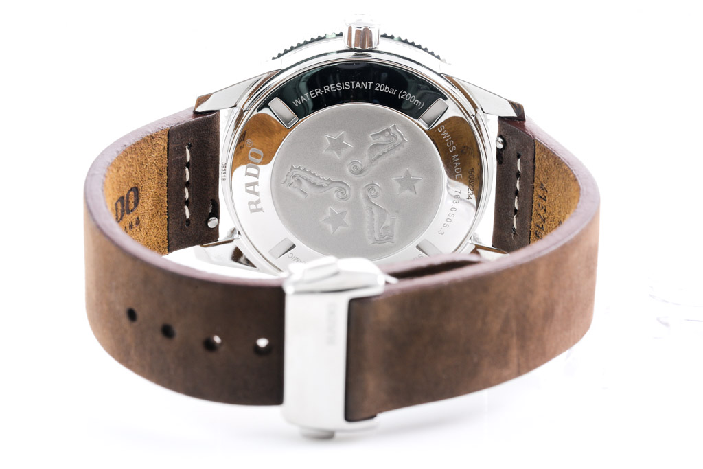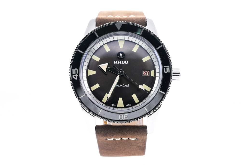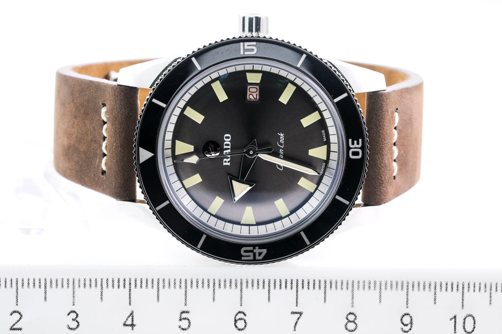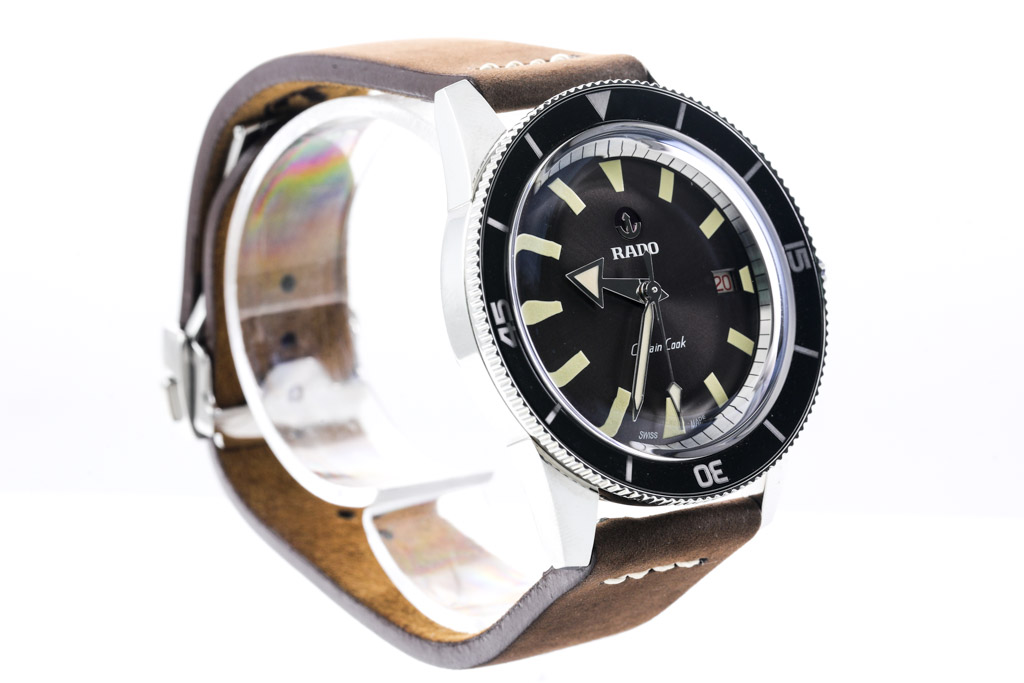 Rado Captain Cook stainless steel automatic mens watch. Dark brown dial, date, case diameter: 42mm, wrist size: 20cm, Swiss made. Ref# R32505305. With Rado dark brown leather strap and clasp. With Rado 2 year International warranty card and Unbranded box. Rado 2 year warranty applies. (As New, Note: minor scratches on case and light wear on bracelet due to being display stock)