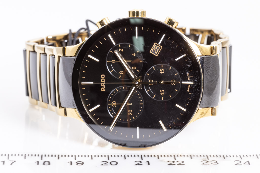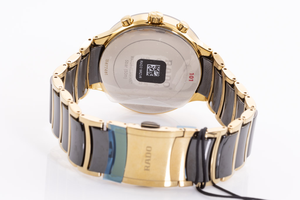 Rado Centrix Chronograph ceramic and gold PVD stainless steel quartz mens watch. Black chronograph dial, date, case diameter: 40mm, wrist size: 20cm, Swiss made. Ref# R30134162. With Rado two tone bracelet and clasp. With Rado 2 Year International Warranty Card and Rado box. Rado warranty applies. (As New, Note: minor scratches on case and light wear on strap due to being display stock)