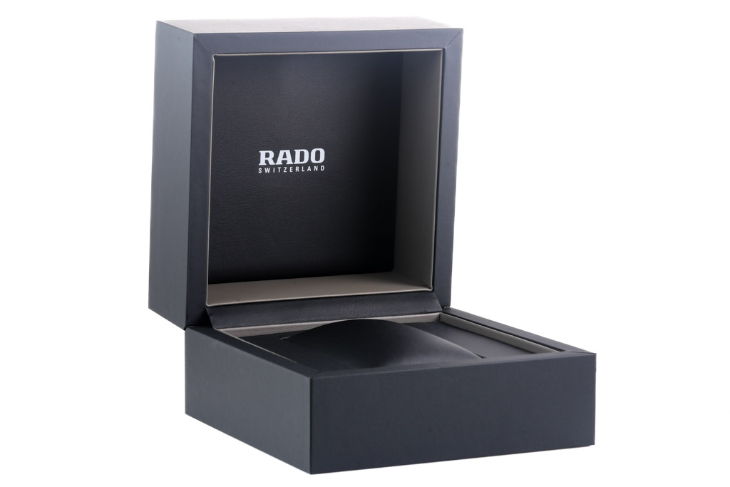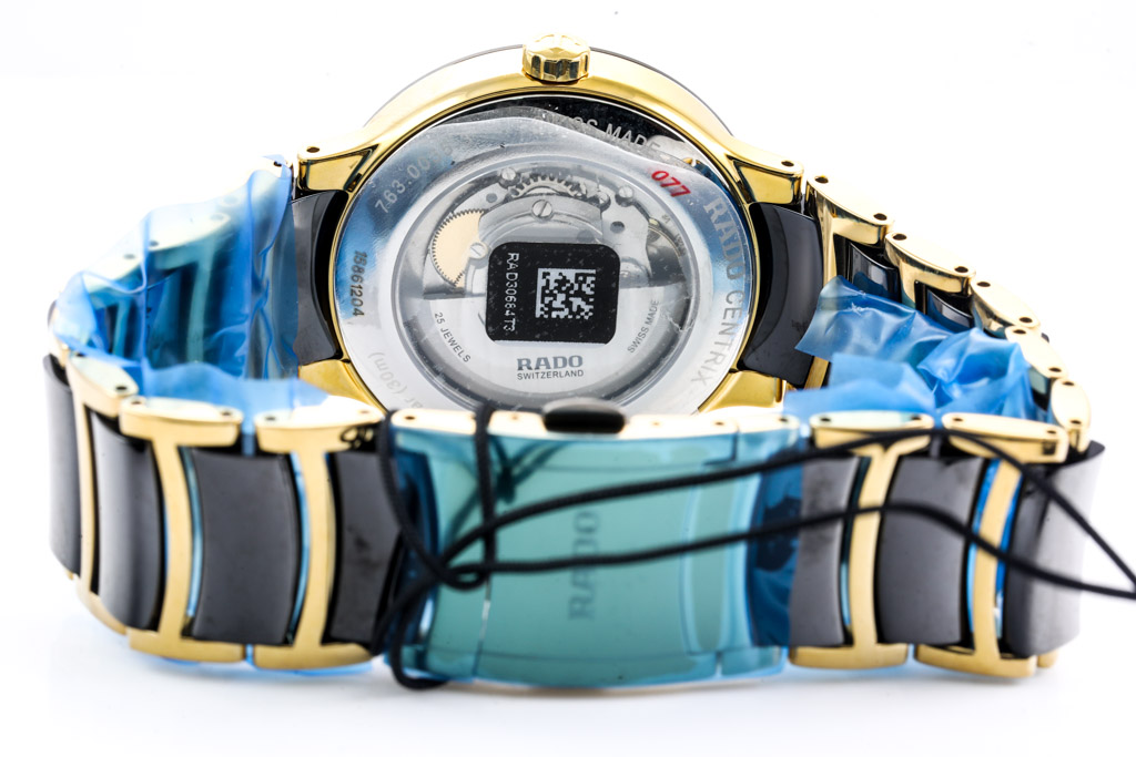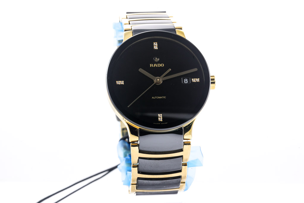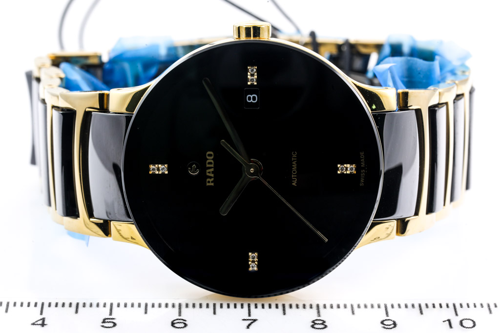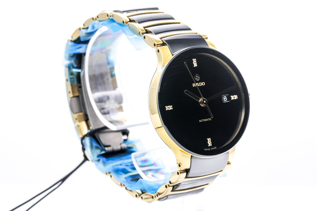 Rado Centrix rose gold PVD coated stainless steel & ceramic automatic mens watch. Black dial, date, Diamond indicators (3, 6, 9 & 12 o'clock), case diameter: 38mm, wrist size: 19cm, Swiss made. Ref# R30035712. With Rado two tone bracelet and clasp. With Rado 2 Year International Warranty Card, Precious Stones Certificate Card and Rado case. Rado warranty applies. (As New, Note: minor scratches on case and light wear on strap due to being display stock)