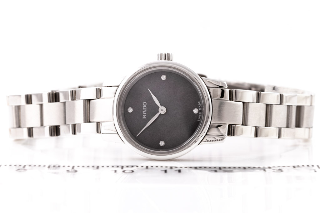 Rado Coupole Classic stainless steel quartz ladies watch. Black Mother of Pearl dial, Diamond indicators, case diameter: 21mm, wrist size: 16cm, Swiss made. Ref# R22890963. With Rado stainless steel bracelet and clasp. With Longines International Warranty card, Precious Stone Certificate Card and Rado box. Rado 2 year warranty applies. (As New, Note: minor scratches on case and bracelet due to being display stock)