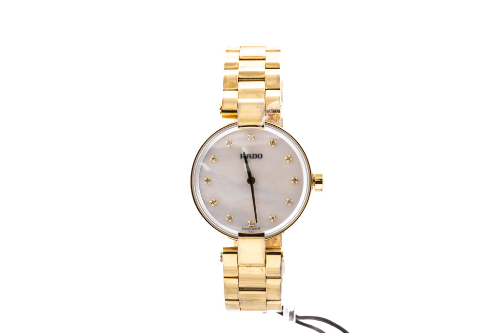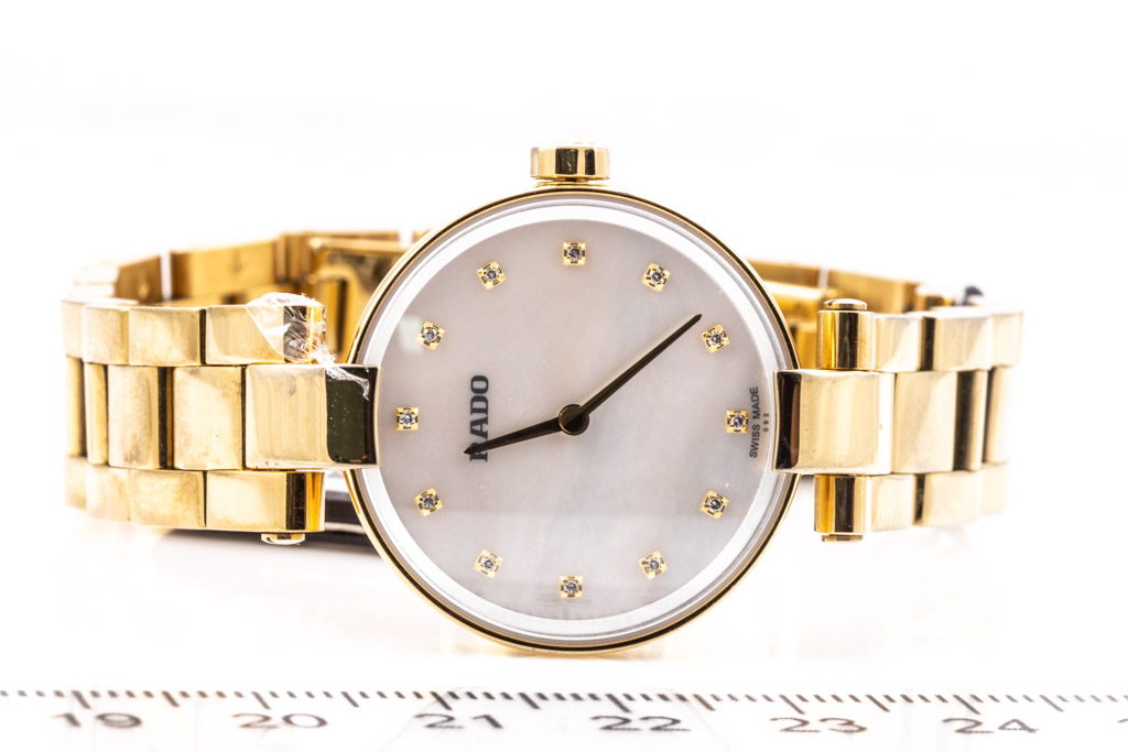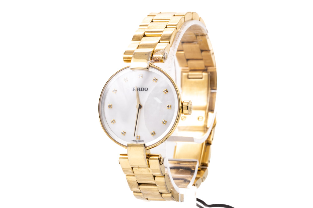 Rado Coupole yellow gold PVD stainless steel quartz ladies watch. Mother of Pearl dial, Diamond indicators, case diameter: 27mm, wrist size: 18cm, Swiss made. Ref# R22857923. With Rado yellow gold PVD stainless steel bracelet and clasp. With Rado 2 year International Warranty Card, Precious Stone Certificate card and Rado box. Rado warranty applies. (As New, Note: minor scratches on case and bracelet due to being display stock)