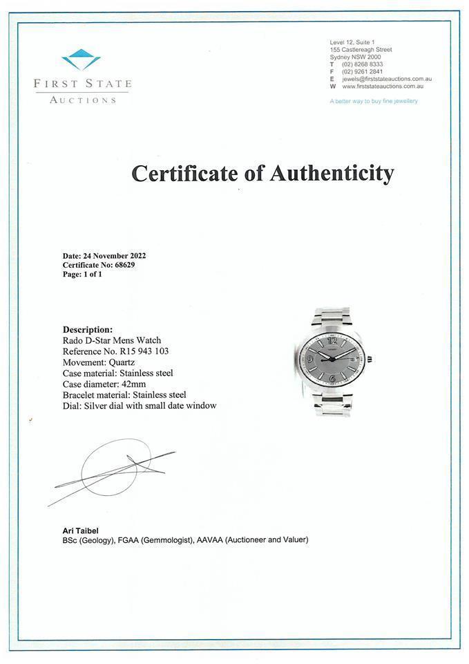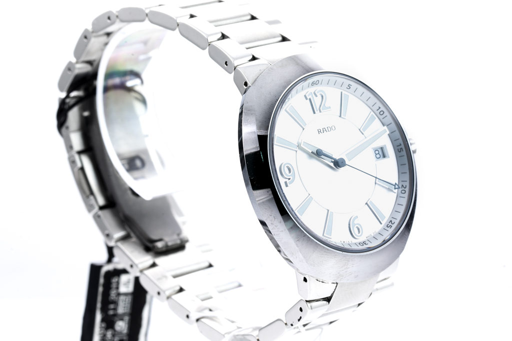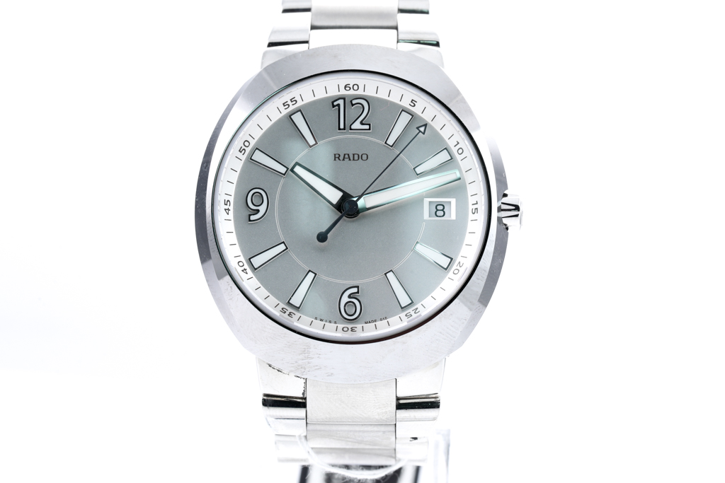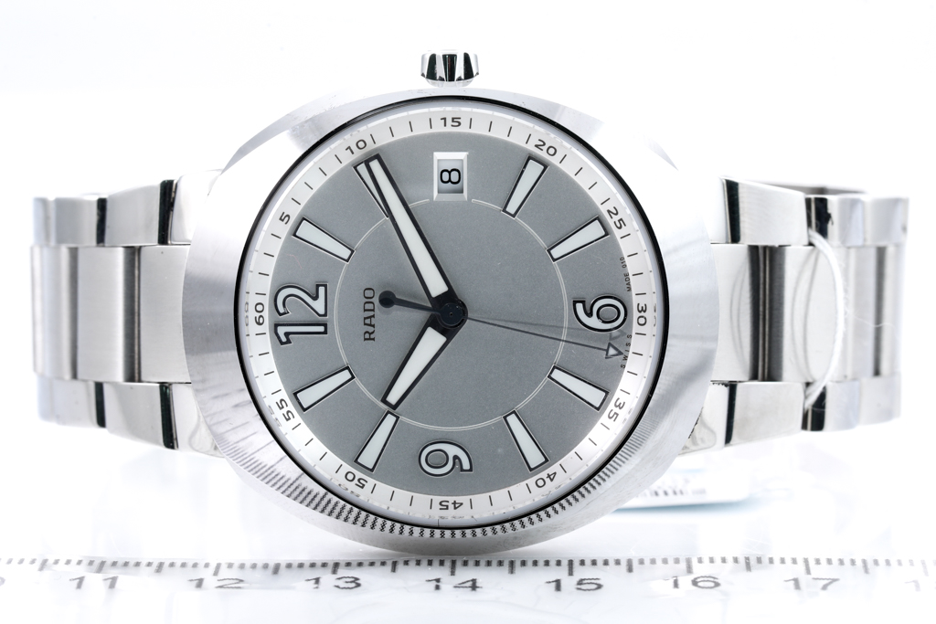 Rado D-Star stainless steel quartz mens watch. Silver dial, date, case diameter: 42mm, wrist size: 19cm, Swiss made. Ref# R15 943 103. With Rado stainless steel bracelet and clasp. With FSA Certificate of Authenticity and Rado box. 3 month FSA warranty. (As New, Note: minor scratches on case and bracelet due to being display stock).
