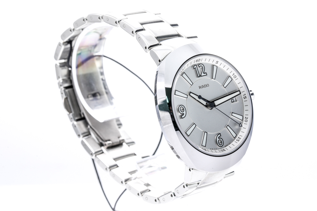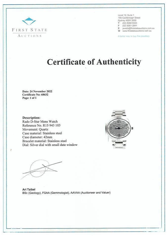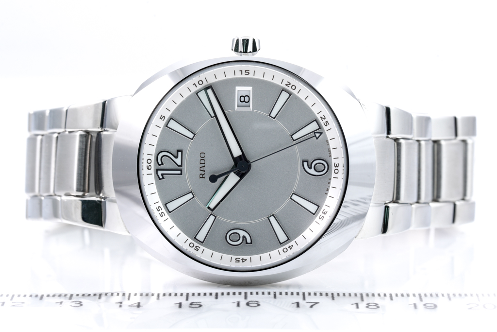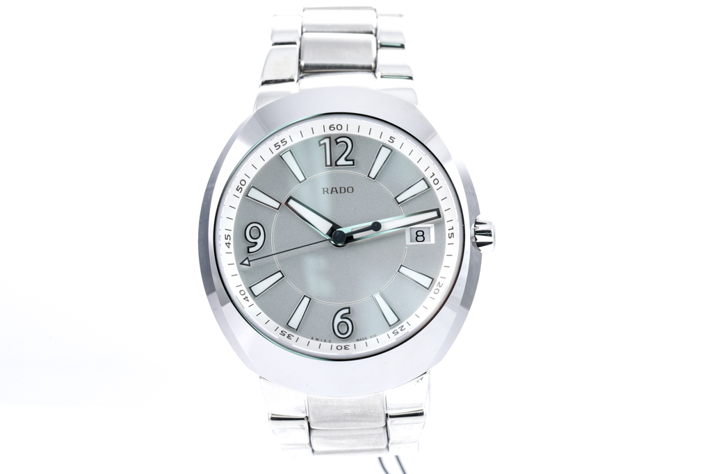 Rado D-Star stainless steel quartz mens watch. Silver dial, date, case diameter: 42mm, wrist size: 20cm, Swiss made. Ref# R15 943 103. With Rado stainless steel bracelet and clasp. With FSA Certificate of Authenticity and Rado box. 3 month FSA warranty. (As New, Note: minor scratches on case and bracelet due to being display stock).