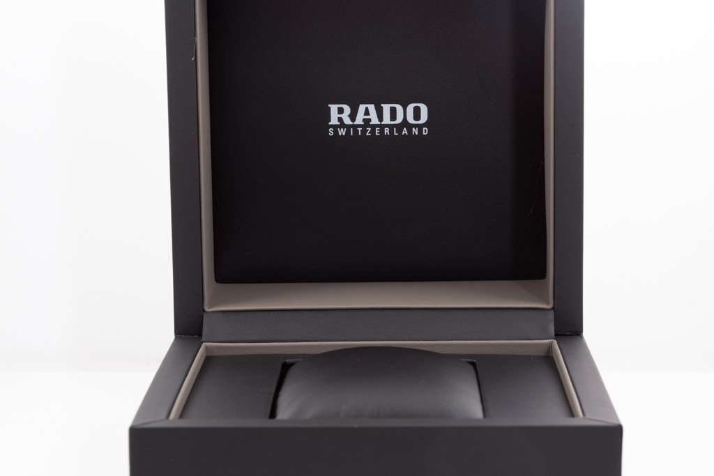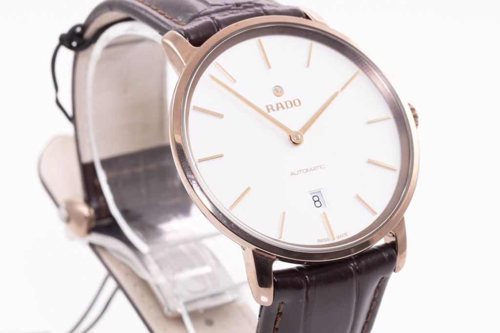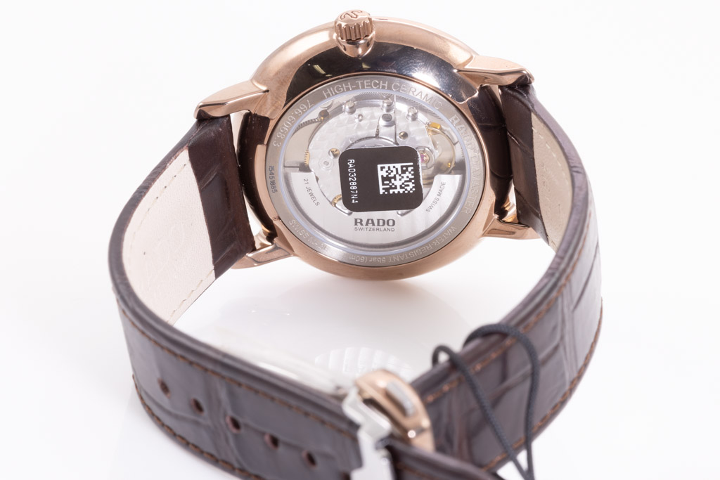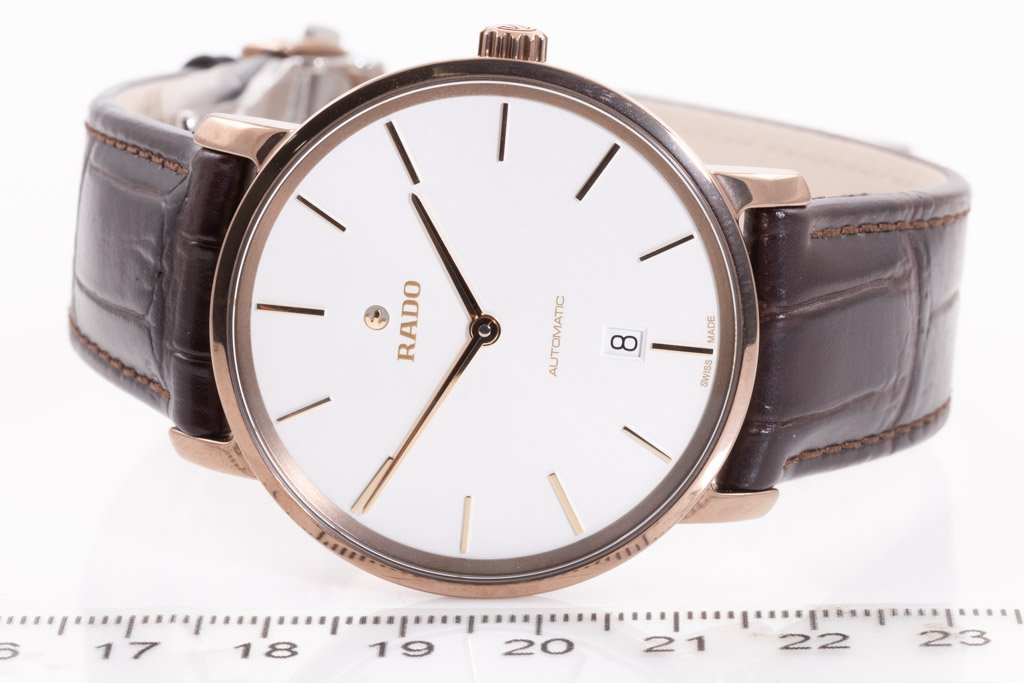 Rado Diamaster Thinline ceramic automatic men's watch. Silver dial, date, case diameter: 40.3mm, adjustable max wrist size: 20cm, Swiss made. Ref# R14068026. With Rado brown leather strap and clasp. With Rado 2 Year International Warranty Card and Rado box. Rado warranty applies. (As New, Note: minor scratches on case and light wear on strap due to being display stock)