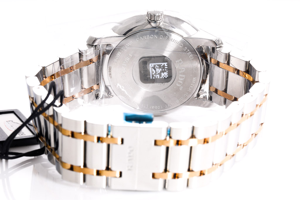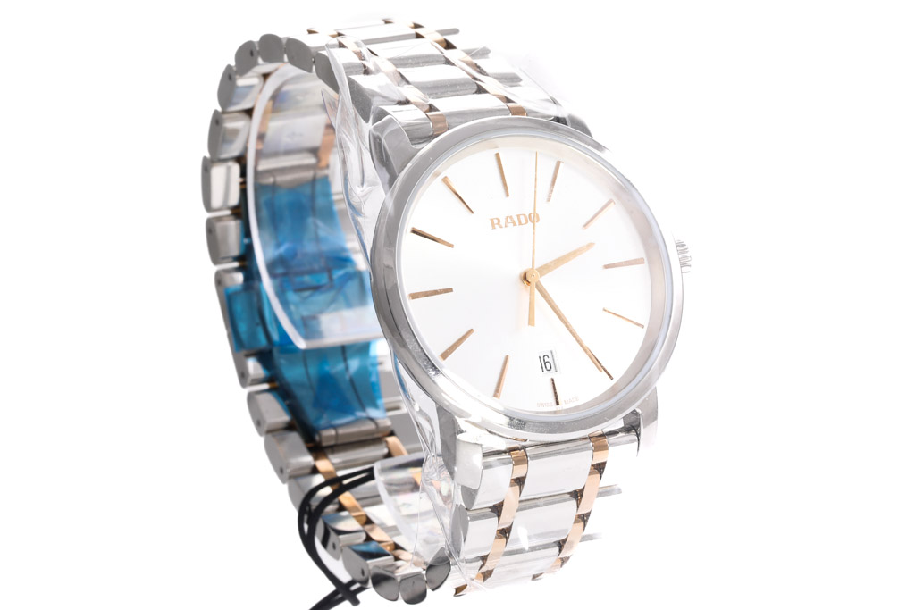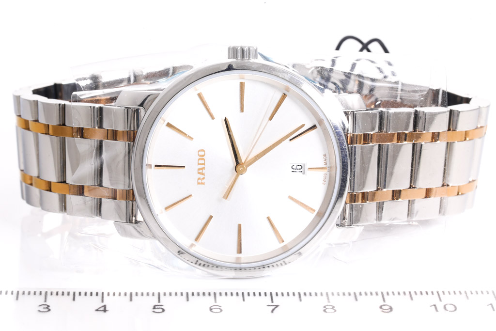 Rado Diamaster stainless steel and rose gold pvd quartz mens watch. Silver dial, date, case diameter: 40mm, wrist size: 19.5cm, Swiss made. Ref# R14078103. With Rado two tone bracelet and clasp. With Rado 2 Year International Warranty Card and Rado box. Rado warranty applies. (As New, Note: minor scratches on case and light wear on strap due to being display stock)