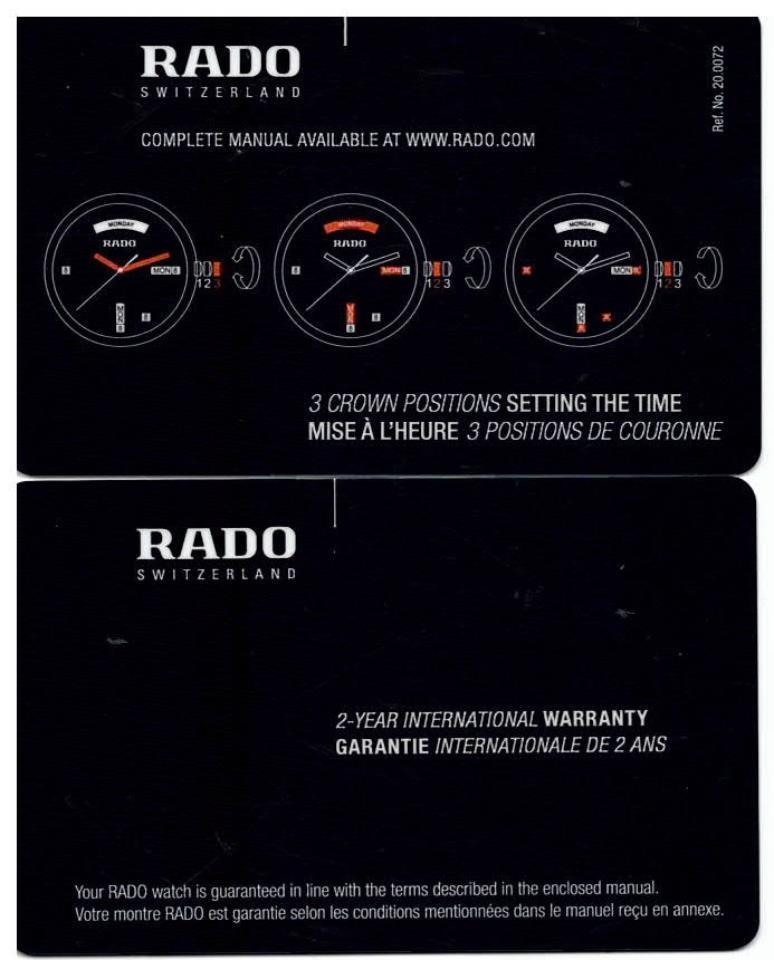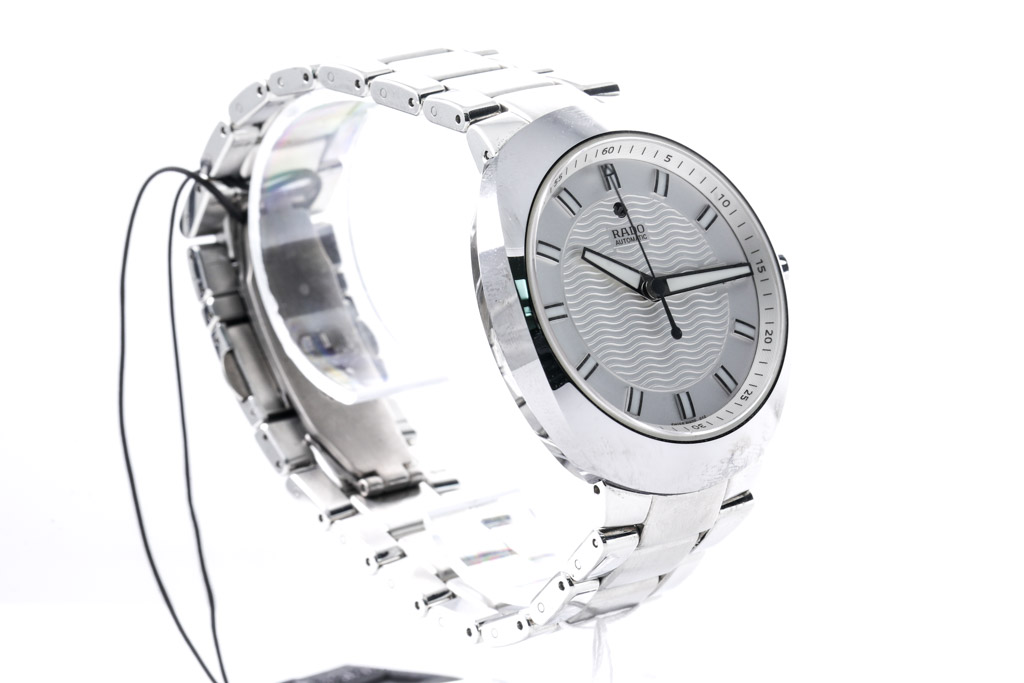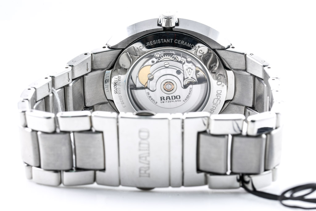 Rado DiaStar stainless steel automatic mens watch. Silver dial, date, approximate case diameter: 48mm, wrist size: 19.5cm, Swiss made. Ref# R15 938 103. With Rado stainless steel bracelet and clasp. With Rado warranty card - the warranty card is not stamped so the Rado warranty will not apply. With Rado box. (As New, Note: minor scratches due to being display stock)