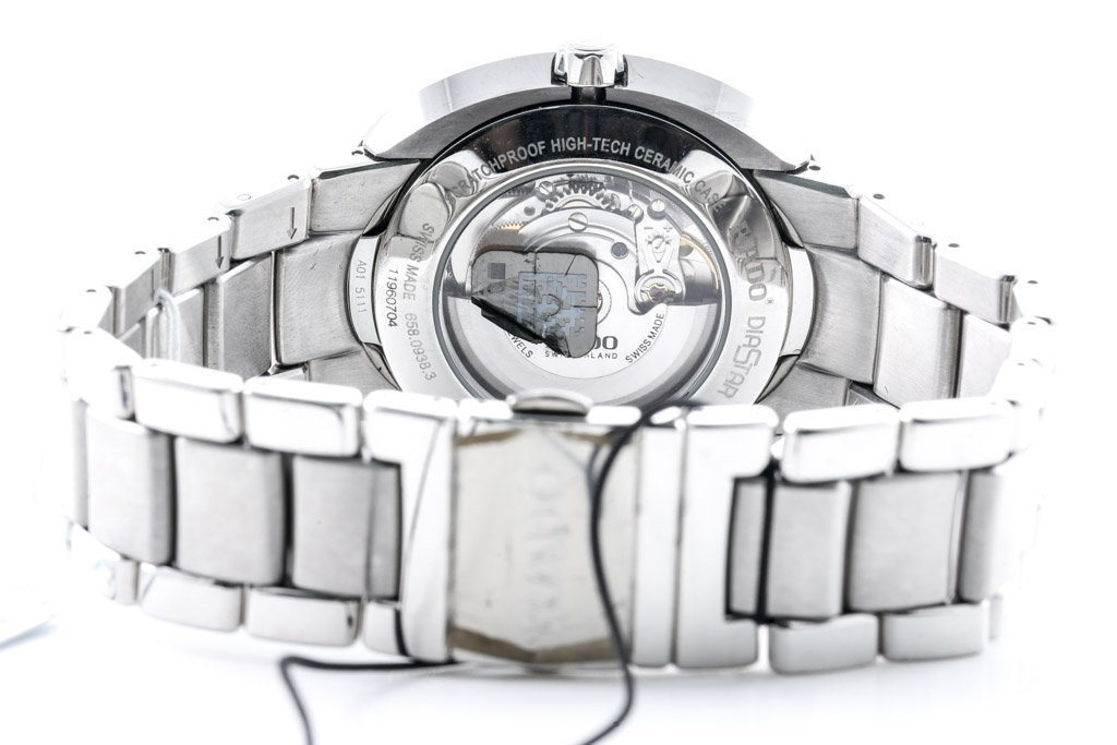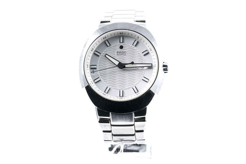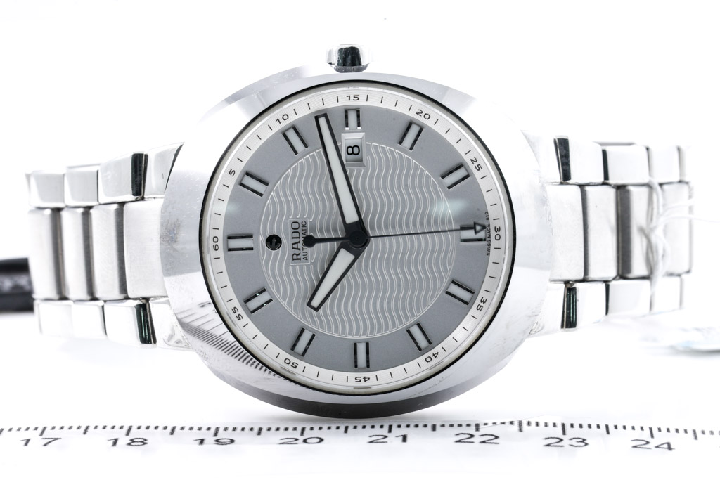 Rado DiaStar stainless steel automatic men's watch. Silver dial, date, approximate case diameter: 48mm, wrist size: 19.5cm, Swiss made. Ref# R15 938 103. With Rado stainless steel bracelet and clasp. With Rado warranty card - the warranty card is not stamped so the Rado warranty will not apply. With Rado box. (As New, Note: minor scratches due to being display stock)