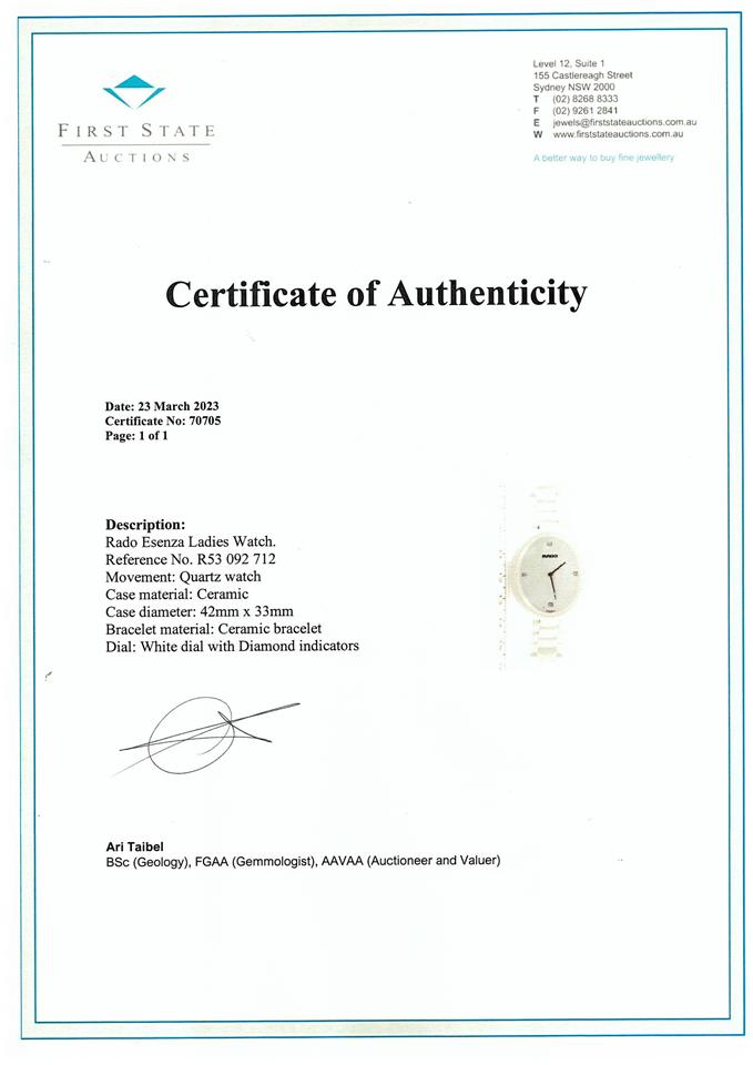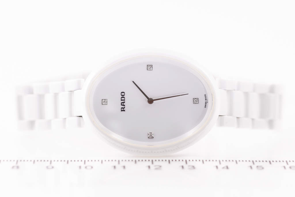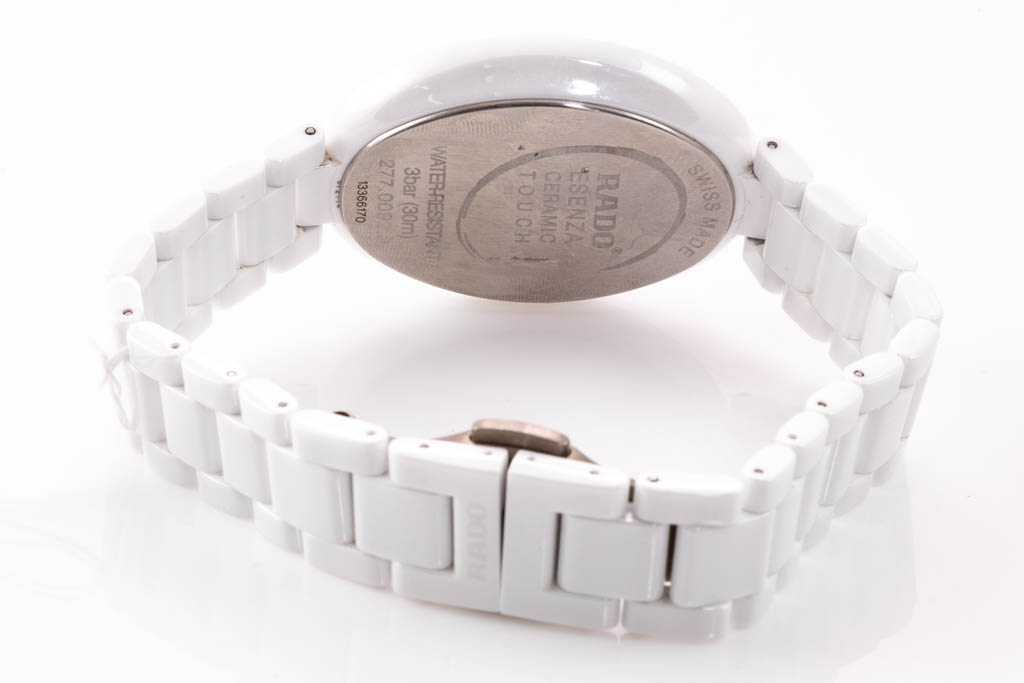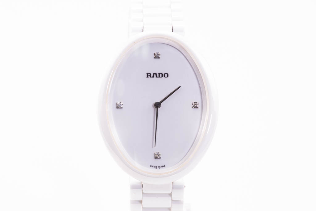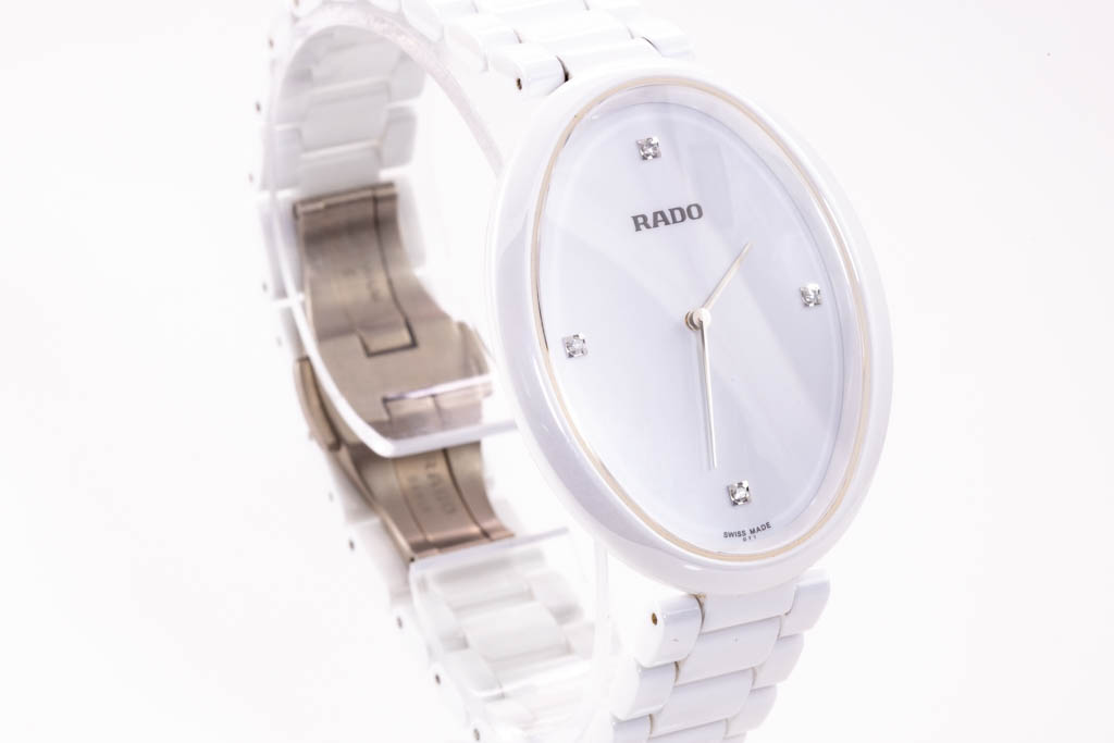 Rado Asenza ceramic quartz ladies watch. White dial, Diamond Indicators (3, 6, 9 & 12 o'clock), case diameter: 42mm x 33mm, wrist size: 18cm, Swiss made. Ref# R53 092 712. With Rado white ceramic bracelet and clasp. With FSA Certificate of Authenticity, Rado standard instruction manual booklet, Rado precious stones certificate card and Rado box. 3 month FSA warranty. (As new, Note; minor scratches on case and bracelet due to being display stock.)