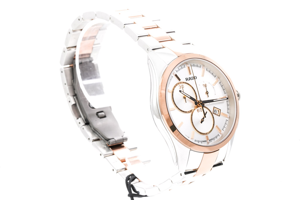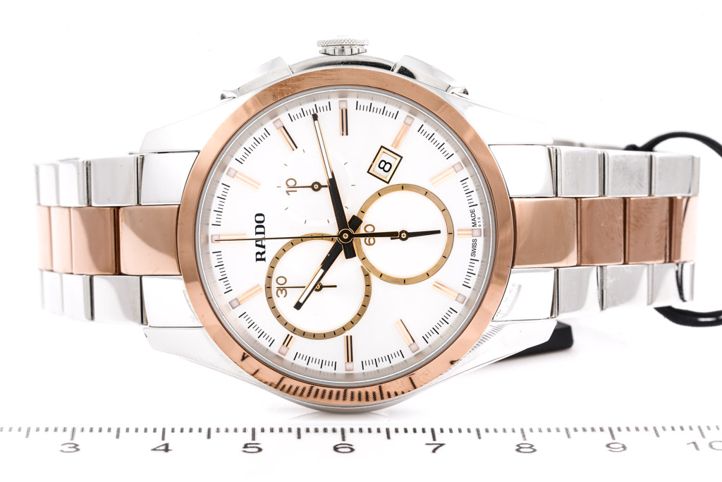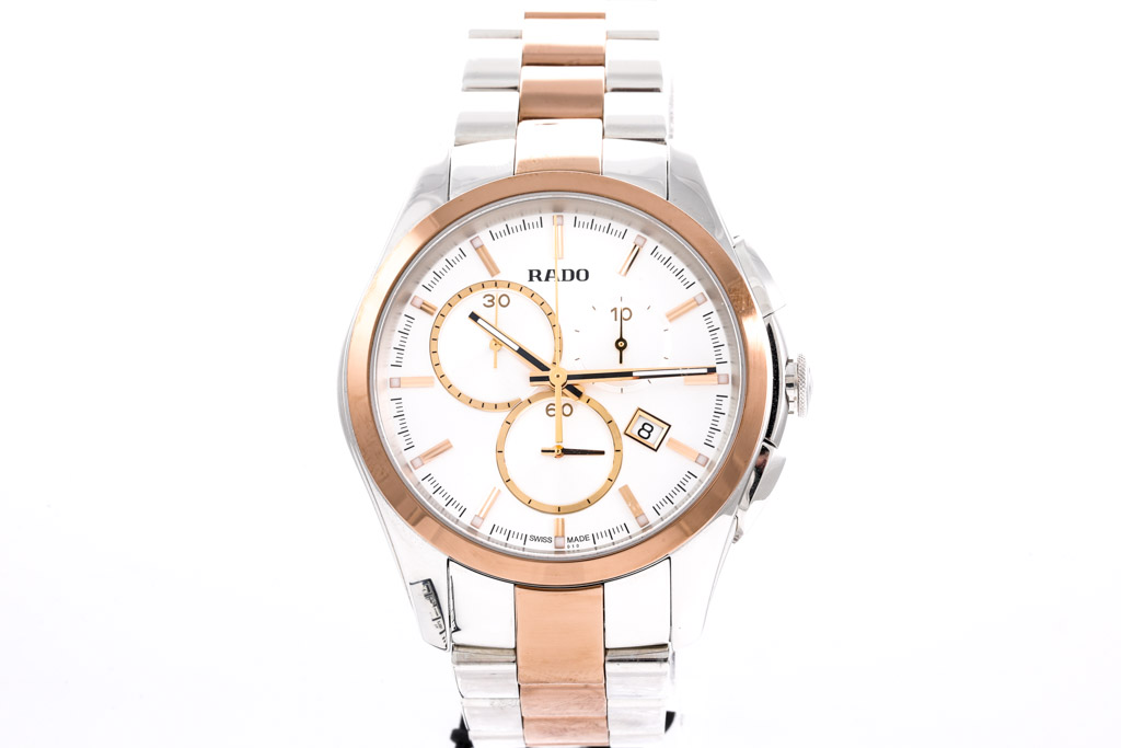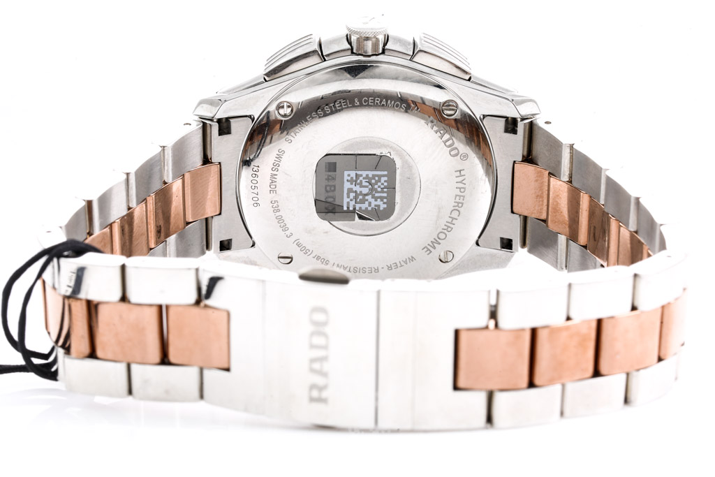 Rado HypercChrome stainless steel and ceramos quartz mens watch. Silver chronograph dial, date, case diameter: 41mm, wrist size: 20cm, Swiss made. Ref# R32039102. With Rado two tone bracelet and clasp. With Rado 2 year International Warranty card and unbranded box. Rado 2 year warranty applies. (As New, Note: minor scratches on case and bracelet due to being stock display)