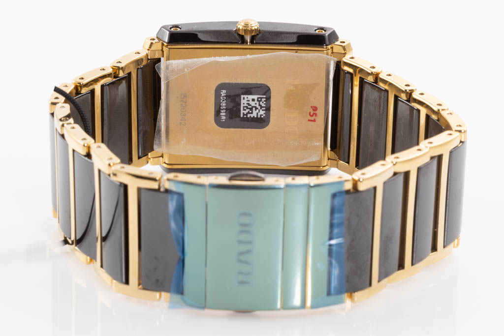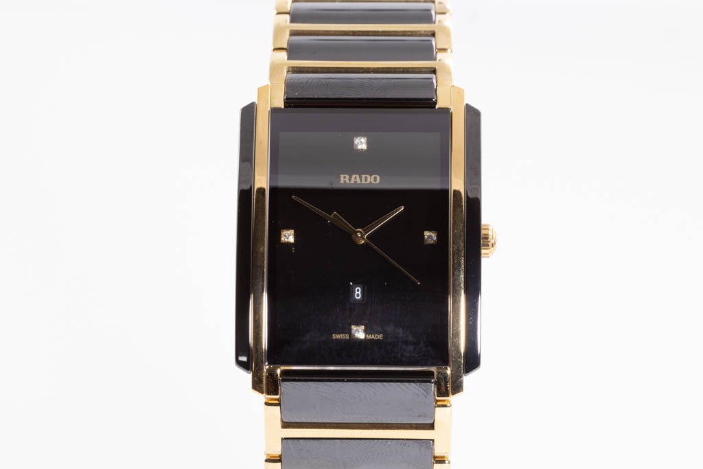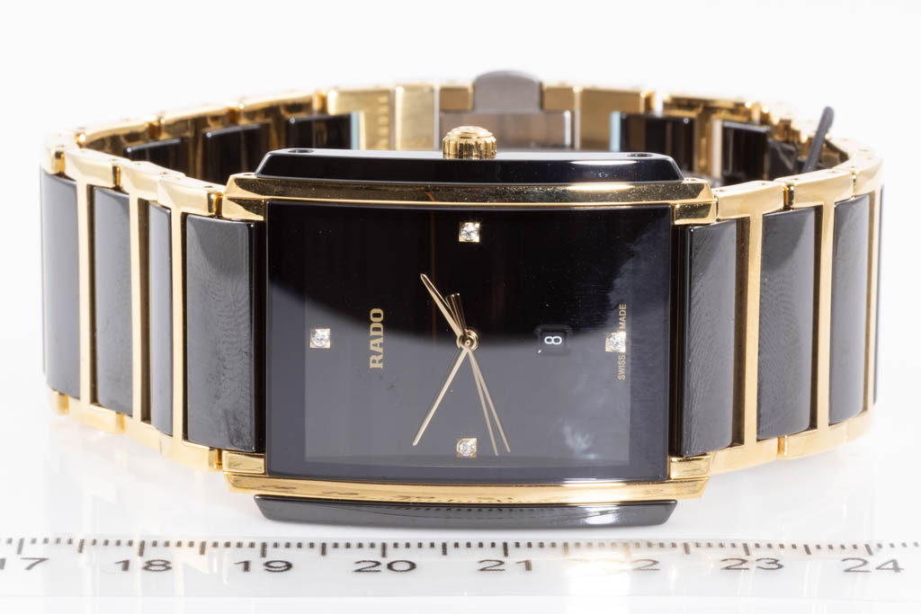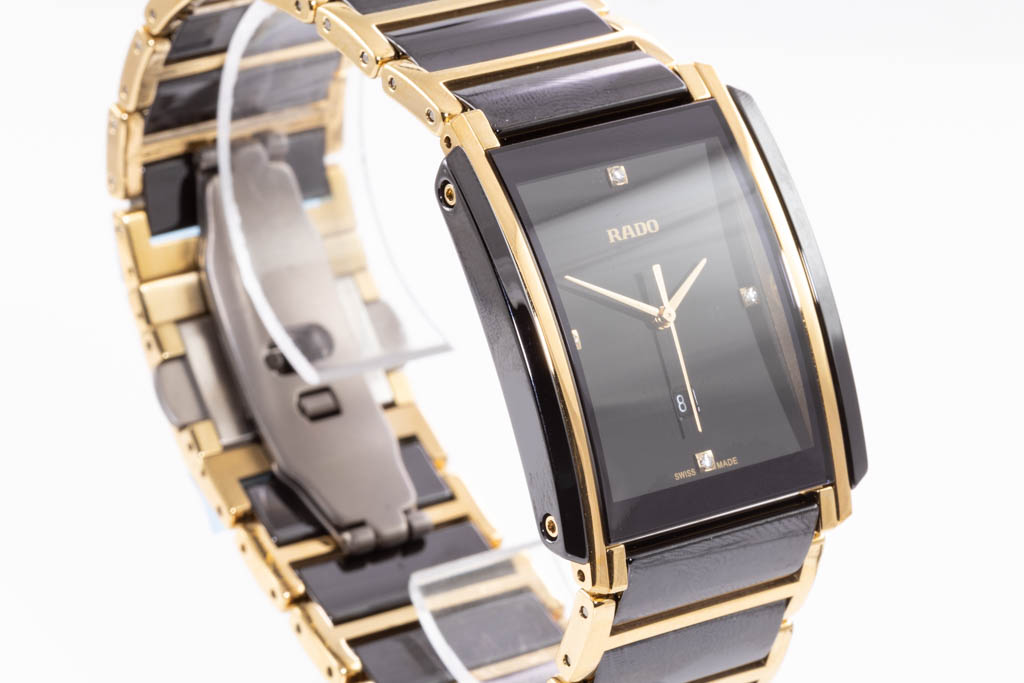 Rado Integral Diamonds ceramic and yellow gold PVD quartz watch. Black dial, date, Diamond indicators, case diameter: 31mm, wrist size: 19.5cm, Swiss made. Ref# R20204712. With Rado two tone bracelet and clasp. With Rado 2 Year International Warranty Card, Rado Precious Stones Certificate Card and Rado case. Rado warranty applies. (As New, Note: minor scratches on case and bracelet due to being display stock)