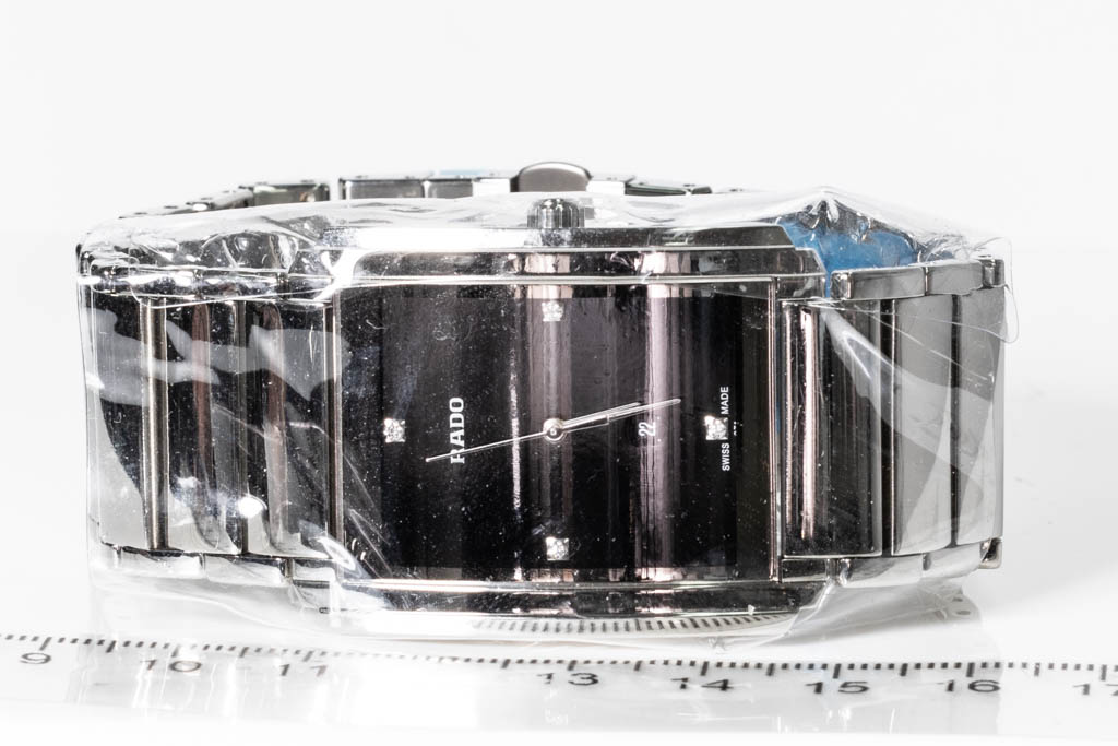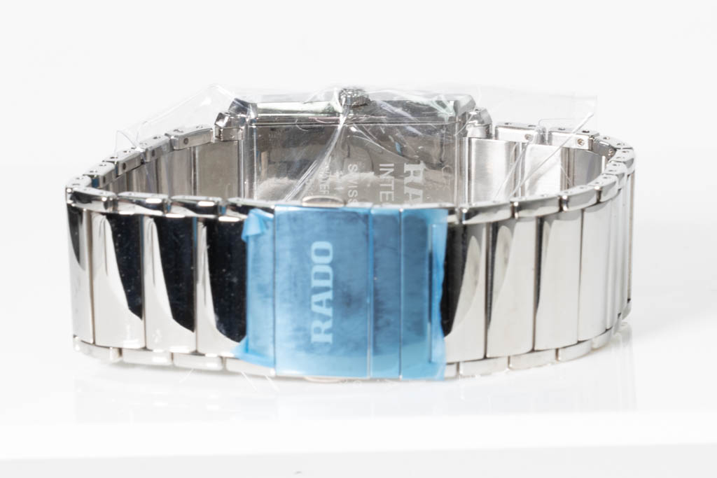 Rado Integral stainless steel quartz men's watch. Black dial, Diamond indicators (3, 6, 9, 12 o'clock), case diameter: 41mm x 31mm, wrist size: 19cm, Swiss made. Ref# R20997713. With Rado stainless steel bracelet and clasp. With Rado International Warranty Card and Rado box. Rado 2 year warranty applies. (As New, Note: scratches on bracelet due to being display stock)