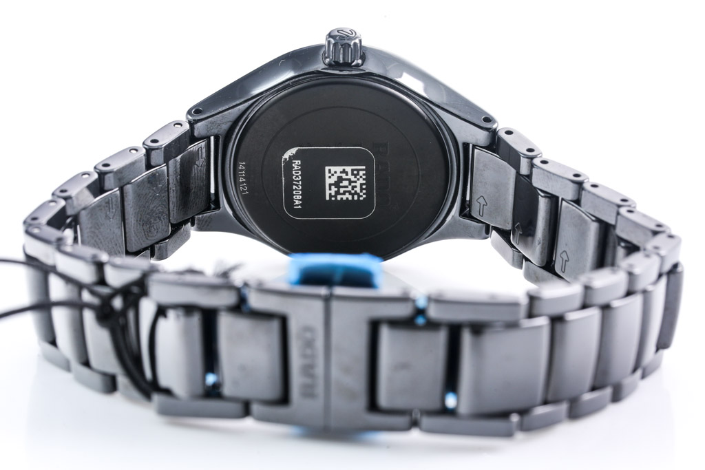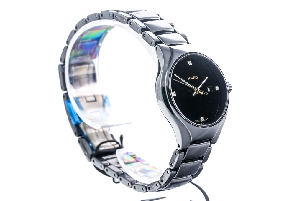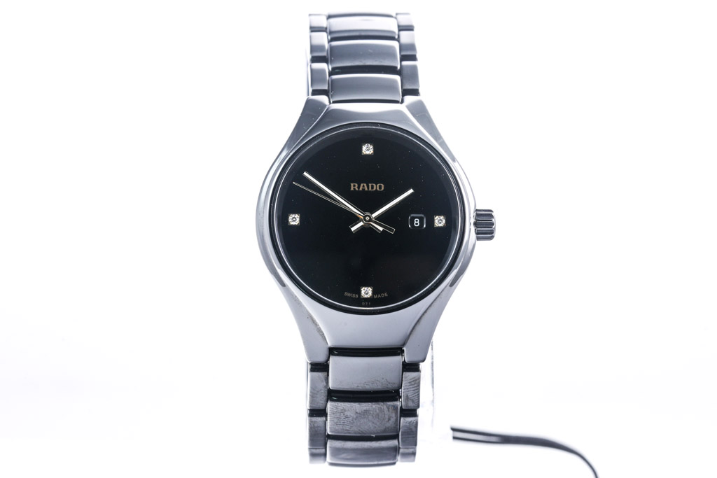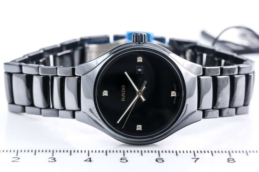 Rado True Diamonds titanium quartz ladies watch. Black dial, 4 Diamond indictors, date, case diameter: 30mm, wrist size: 18cm, Swiss made. Ref# R27059712. With Rado titanium bracelet and clasp. With Rado 2 Year International Warranty Card and Rado case. Rado warranty applies. (As New, Note: minor scratches on case and light wear on strap due to being display stock)