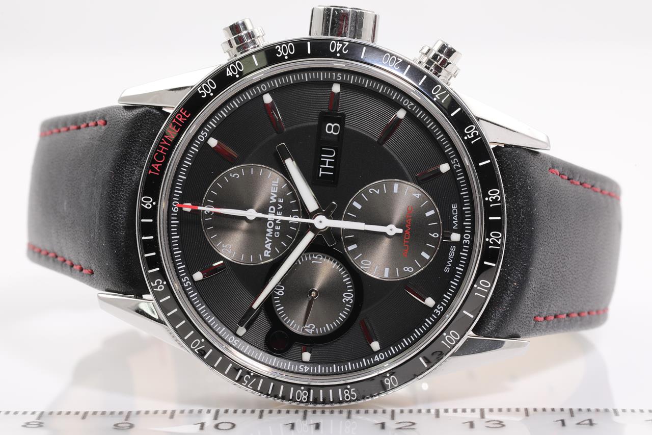 Raymond Weil Freelancer stainless steel automatic mens watch. Black chronograph dial, date & day, case diameter: 42mm, wrist size: 18.5cm (adjustable), Swiss made. Ref# 7731S-C12-0621. With Raymond Weil black leather strap & clasp. With Raymond Weil box. 12 month FSA warranty. (New)