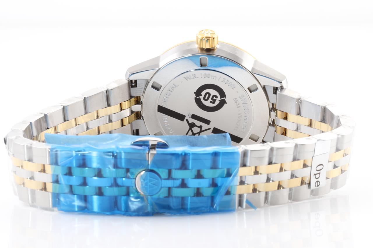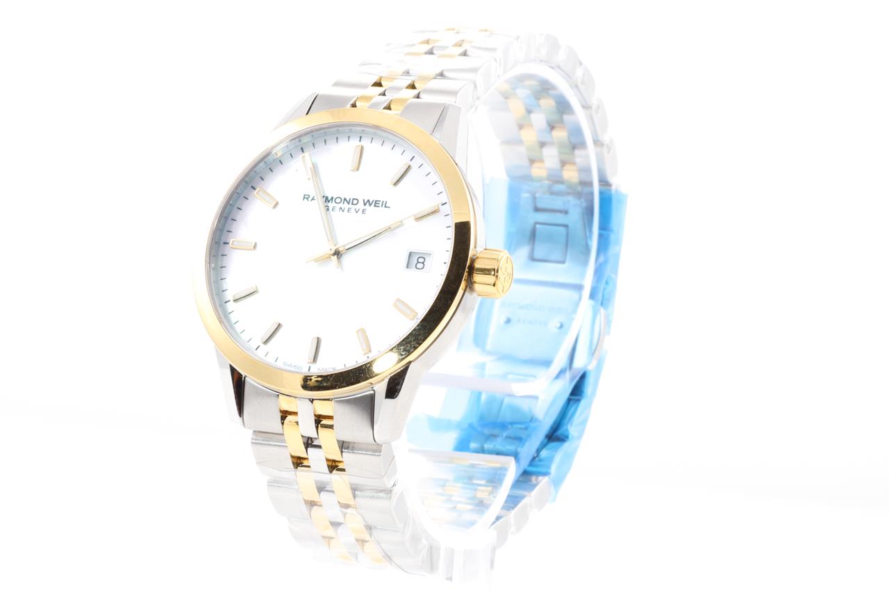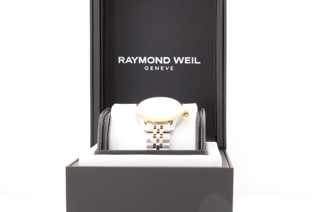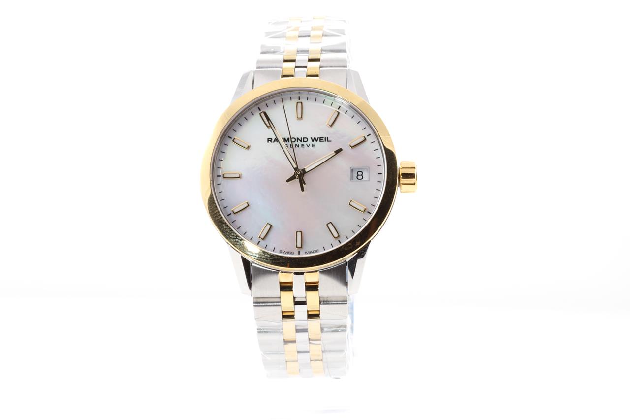 Raymond Weil Freelancer stainless steel quartz women's watch. Mother of pearl dial, date, case diameter: 34mm, Swiss made. Ref# 5634-STP-97021. With Raymond Weil gold PVD and stainless steel bracelet and clasp. With Raymond Weil box. 12 month FSA warranty. (New, in original wrapping)
