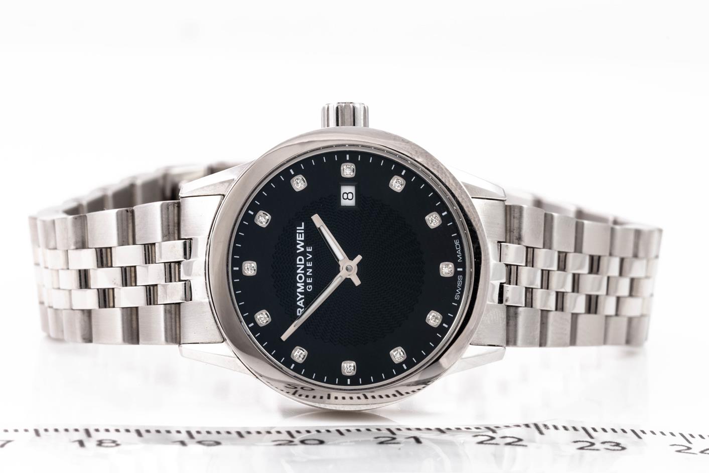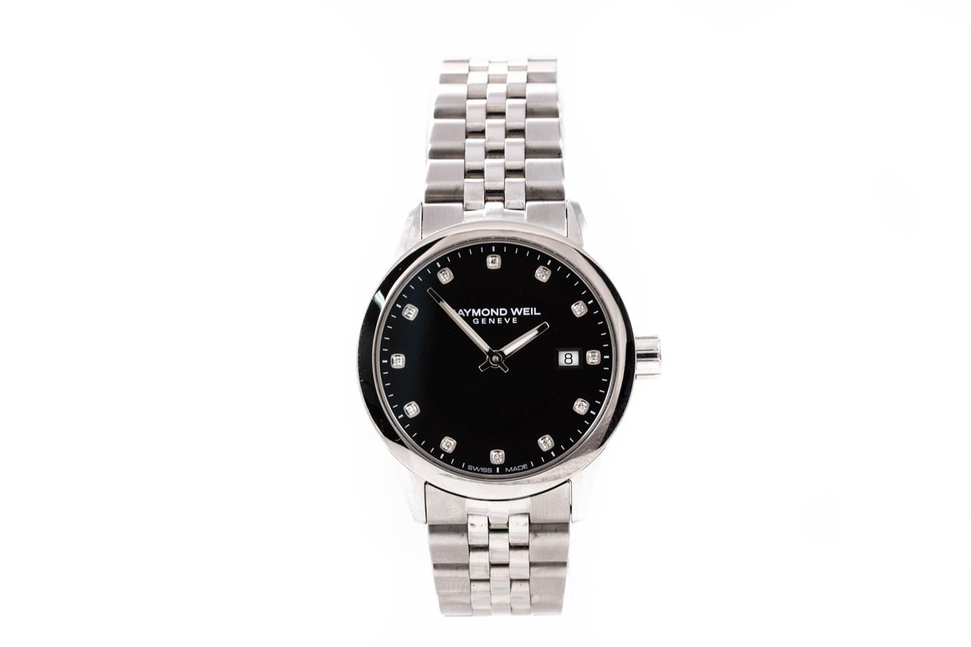 Raymond Weil Freelancer stainless steel quartz ladies watch. Black dial, Diamond indicators, date, case diameter: 29mm, wrist size: 17.5cm, Swiss made. Ref# 5629-ST-20081. With Raymond Weil stainless steel bracelet and clasp. With Raymond Weil Guarantee card and Raymond Weil box. 12 month FSA warranty. (As New, Note: minor scratches on case and bracelet due to being display stock)