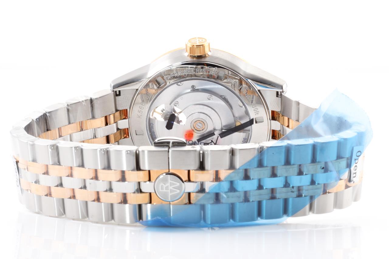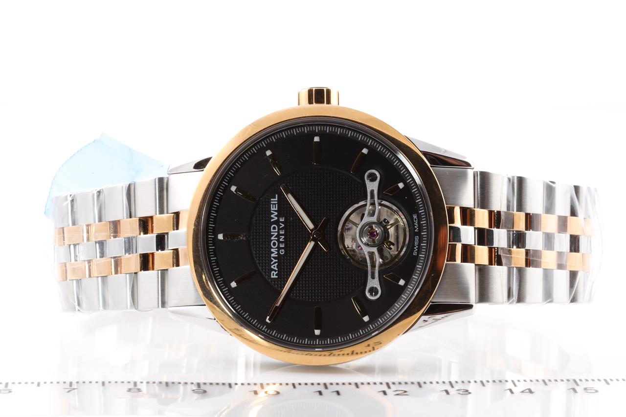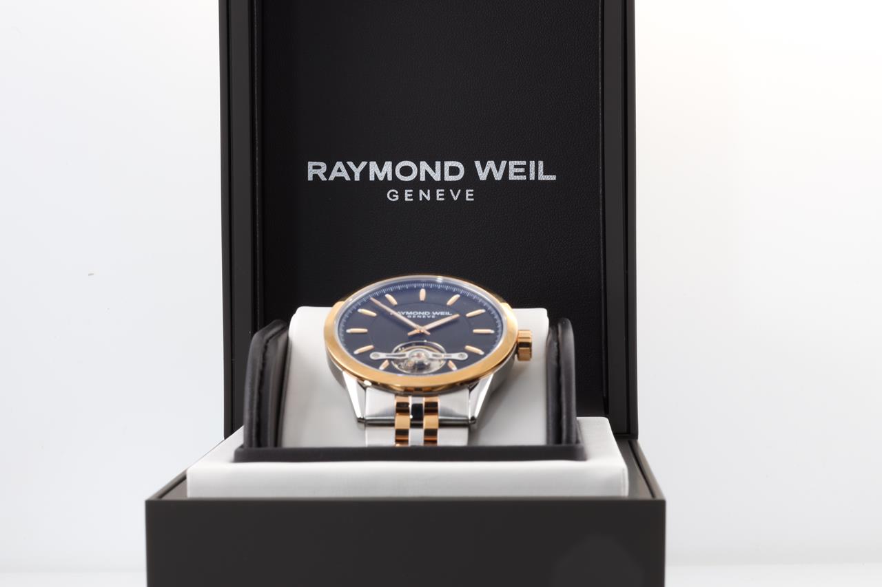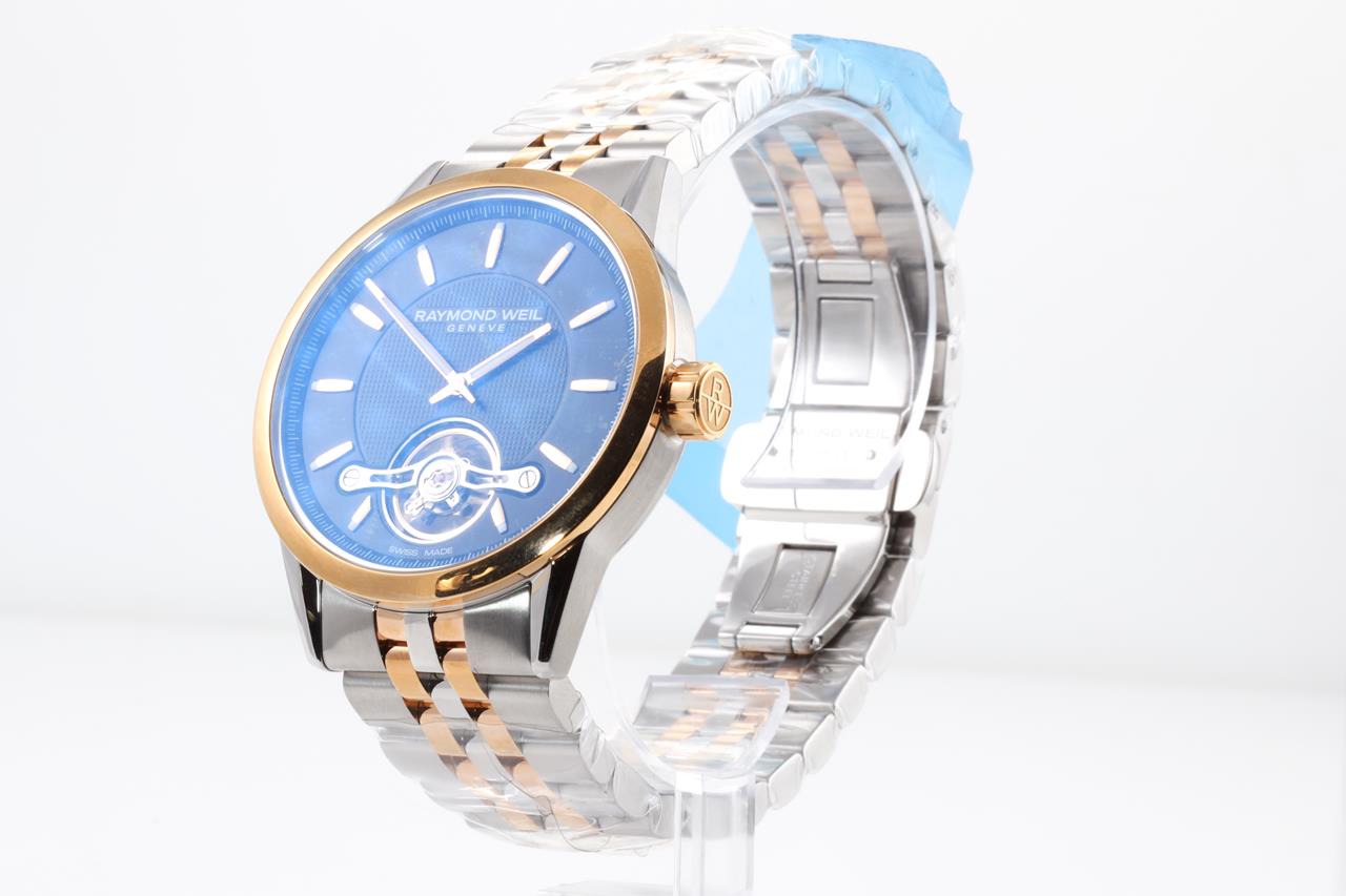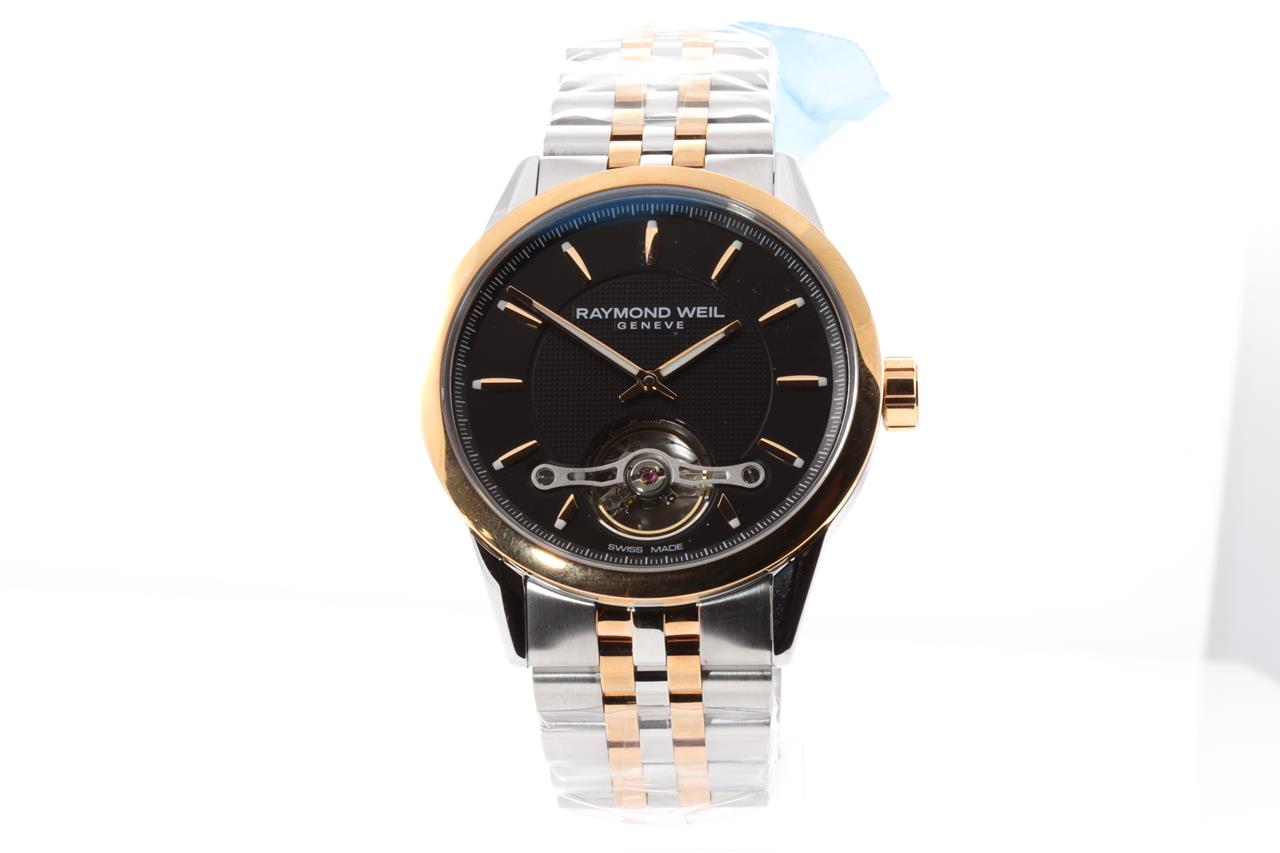 Raymond Weil Freelancer two tone stainless steel quartz Swiss made. Ref#2780-SP5-20001. With Raymond Weil rose gold PVD and stainless steel bracelet and clasp. With Raymond Weil box. 12 month FSA warranty. (New, in original wrapping)