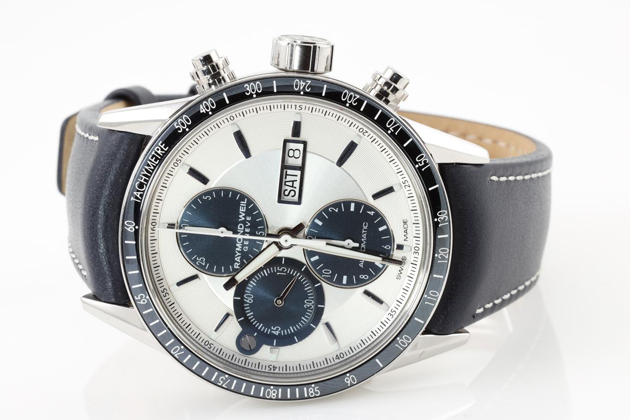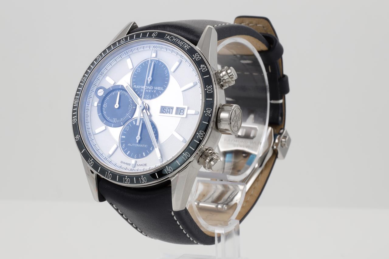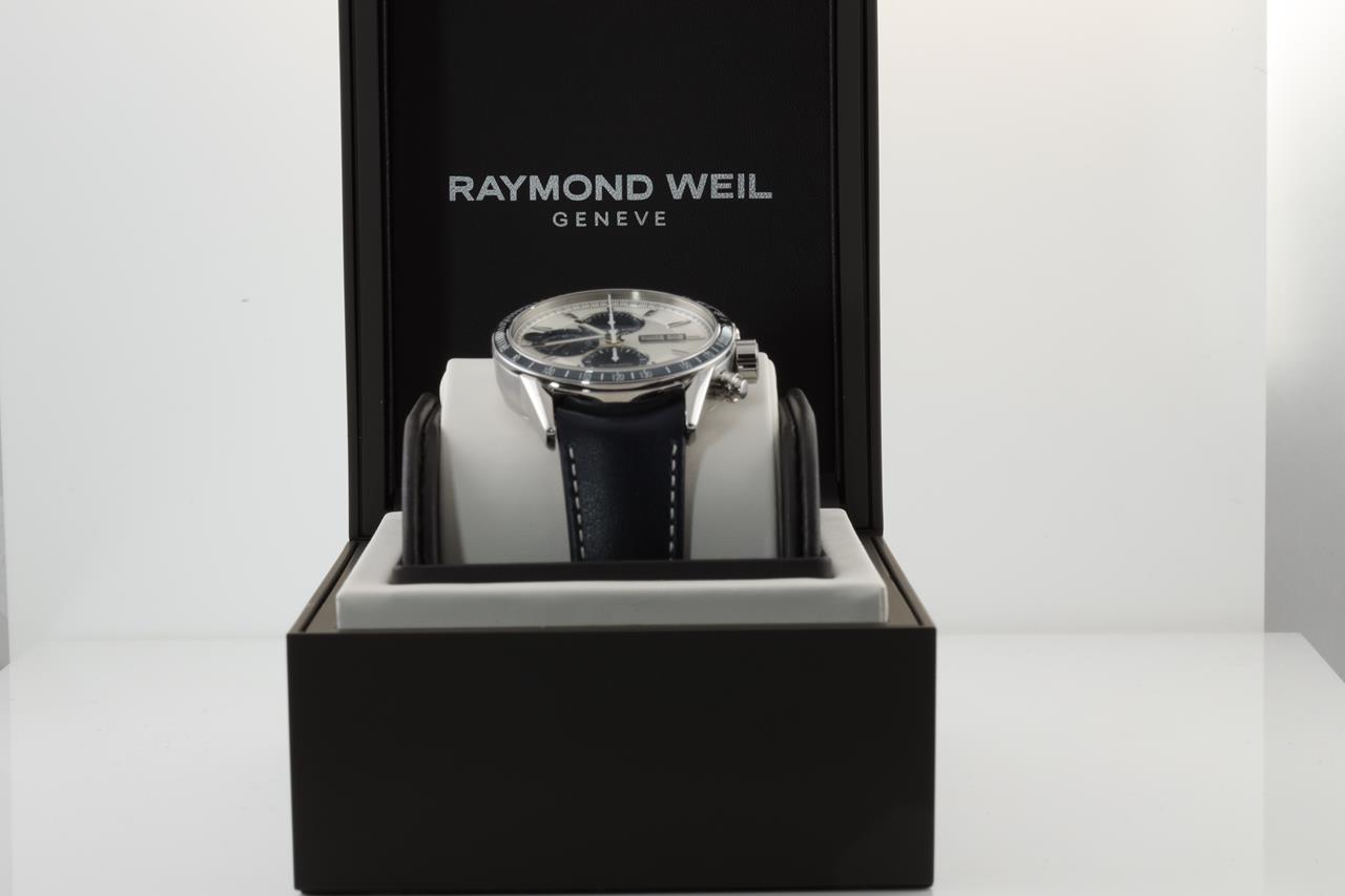 Raymond Weil Freelancer Chronograph stainless steel automatic mens watch. Silver dial, day, date, case diameter: 42mm, Swiss made. Ref#7731-SC3-65521. With Raymond Weil navy leather strap. With Raymond Weil box. 12 month FSA warranty. (New)