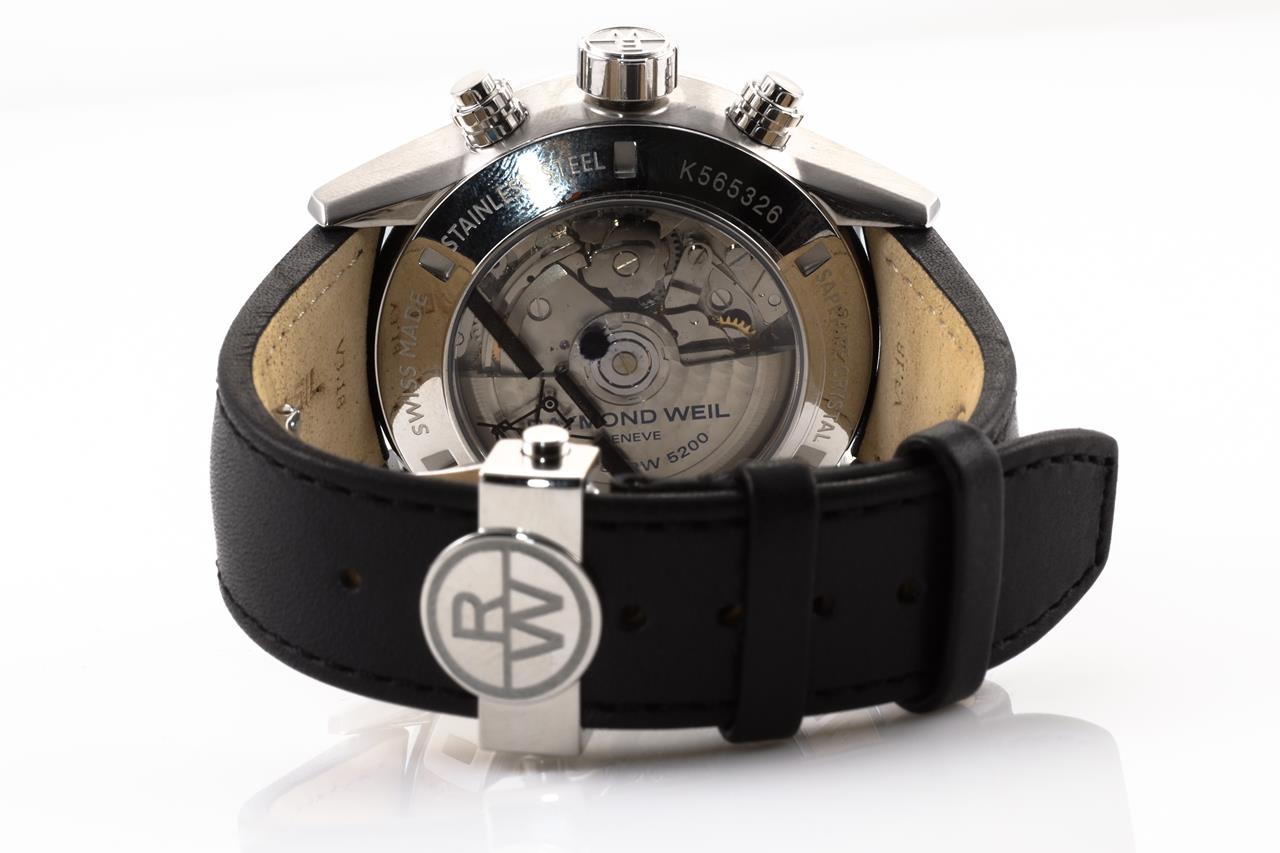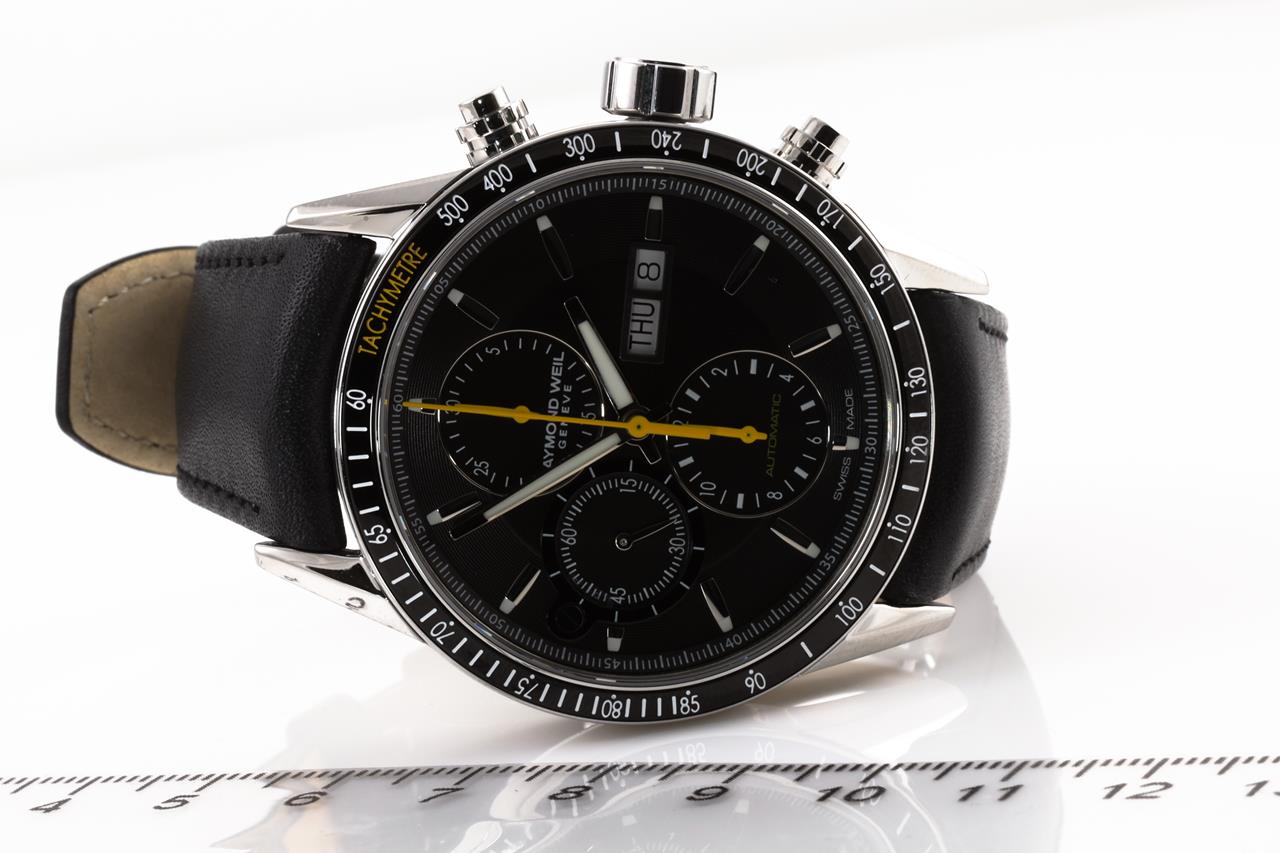 Raymond Weil Freelancer Chronograph stainless steel automatic mens watch. Black dial, day, date, case diameter: 42mm, Swiss made. Ref#7731-SC1-20121. With Raymond Weil black leather strap. With Raymond Weil box. 12 month FSA warranty. (New)