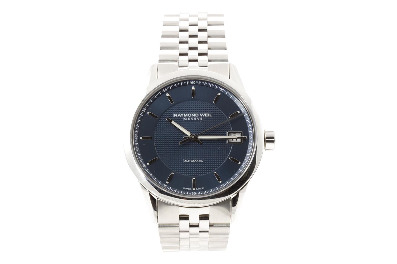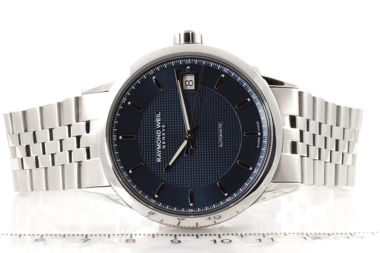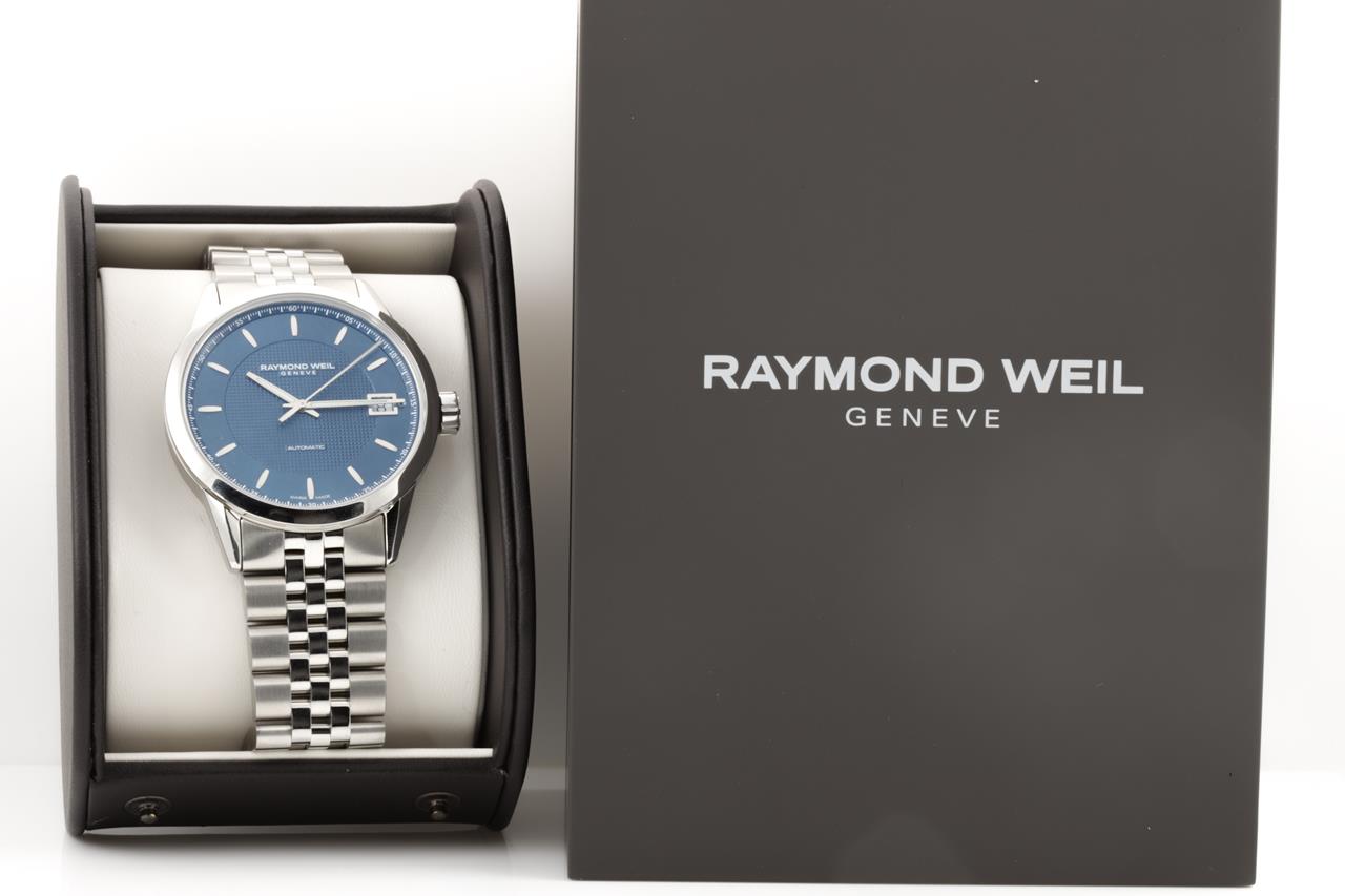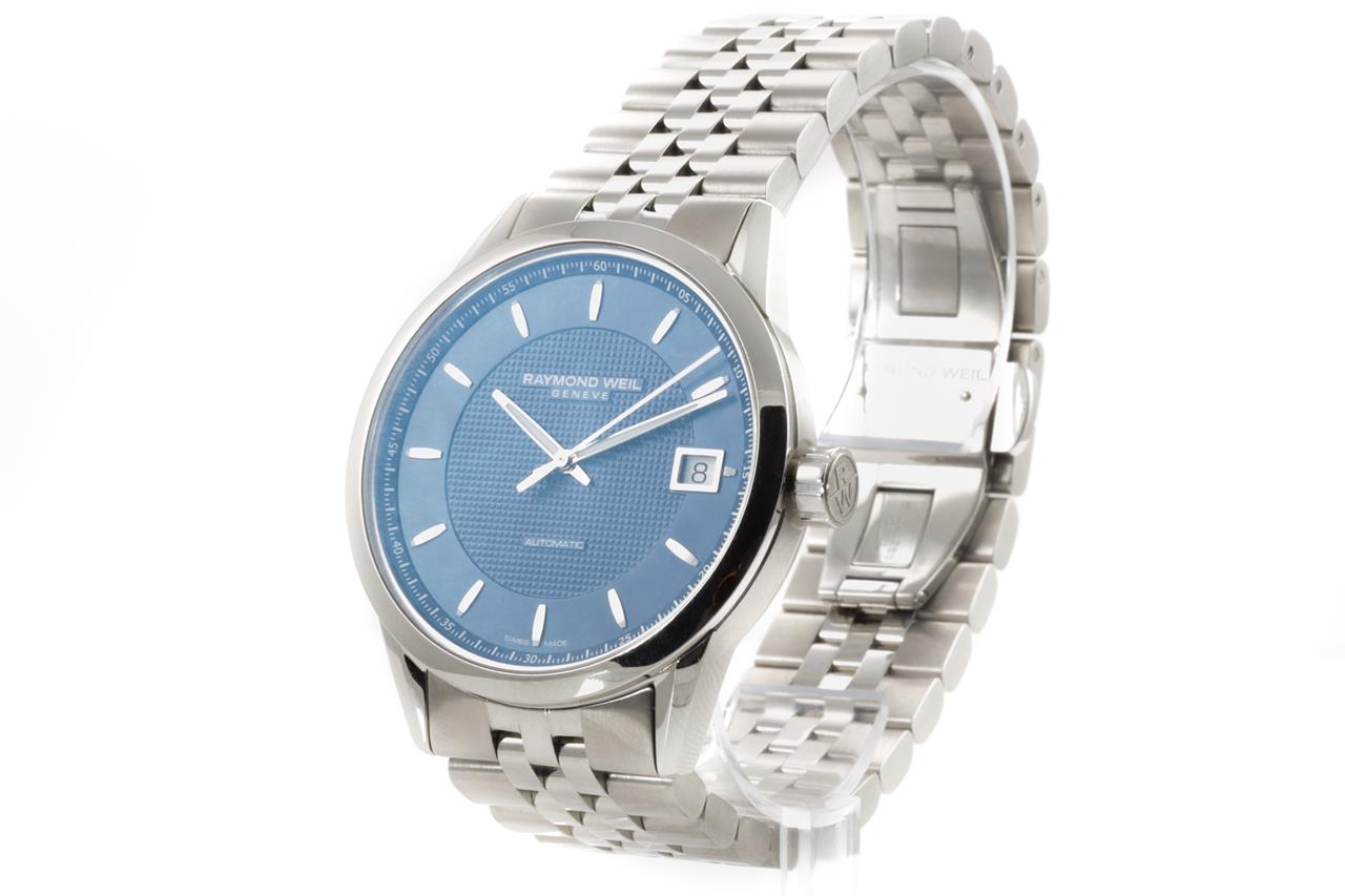 Raymond Weil Freelancer stainless steel automatic mens watch. Blue dial, date, case diameter: 42mm, wrist size: 21cm, Swiss made. Ref# 2740S-T50-021. With Raymond Weil stainless steel bracelet & clasp. Note: minor scratches on case and bracelet due to being display stock. With Raymond Weil box. 12 month FSA warranty. (As New)
