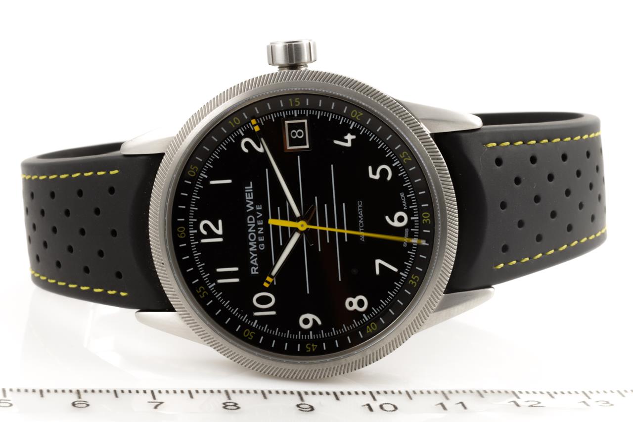 Raymond Weil Freelancer stainless steel automatic mens watch. Black dial, date, case diameter: 42mm, wrist size: 20cm (adjustable), Swiss made. Ref# 2754S-R05-200. With Raymond Weil black rubber strap and clasp. With Raymond Weil box. 12 month FSA warranty. (As New)