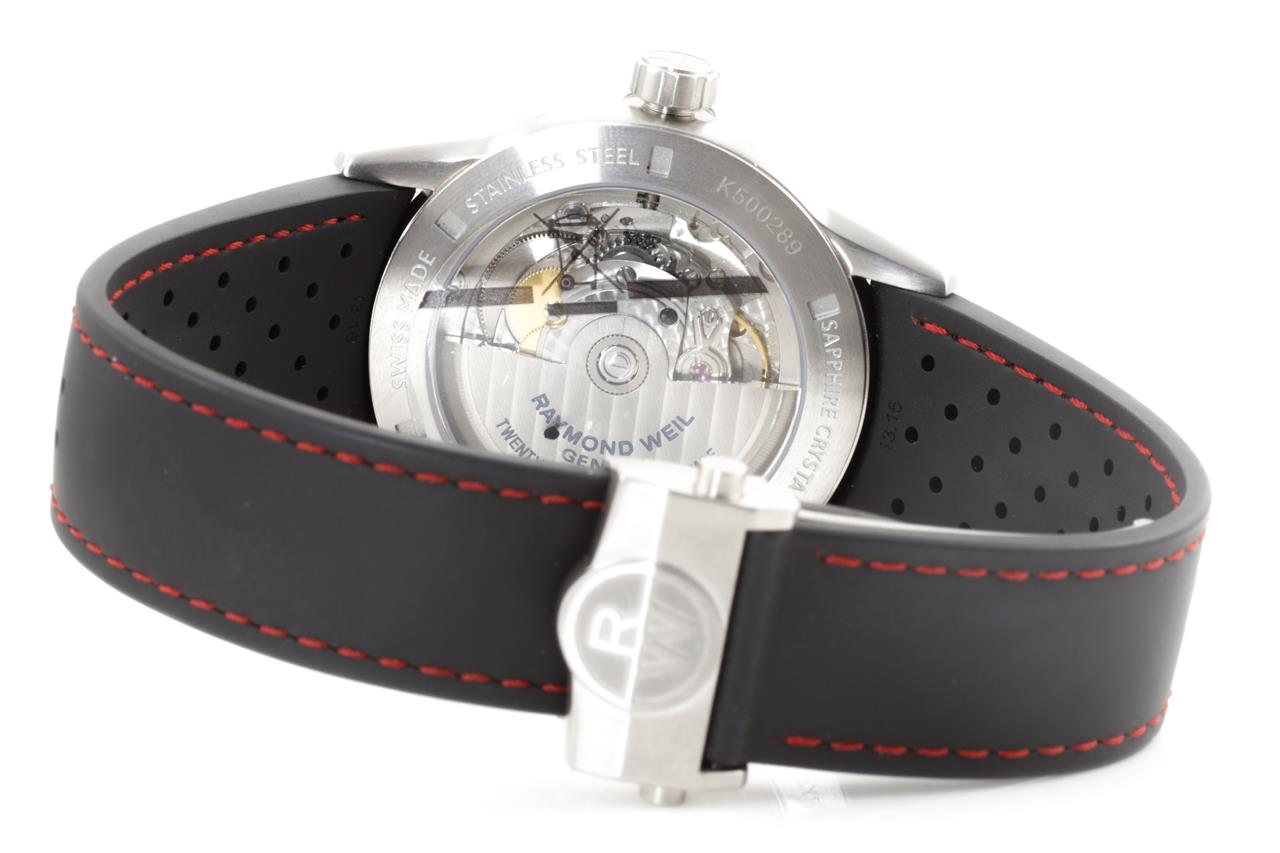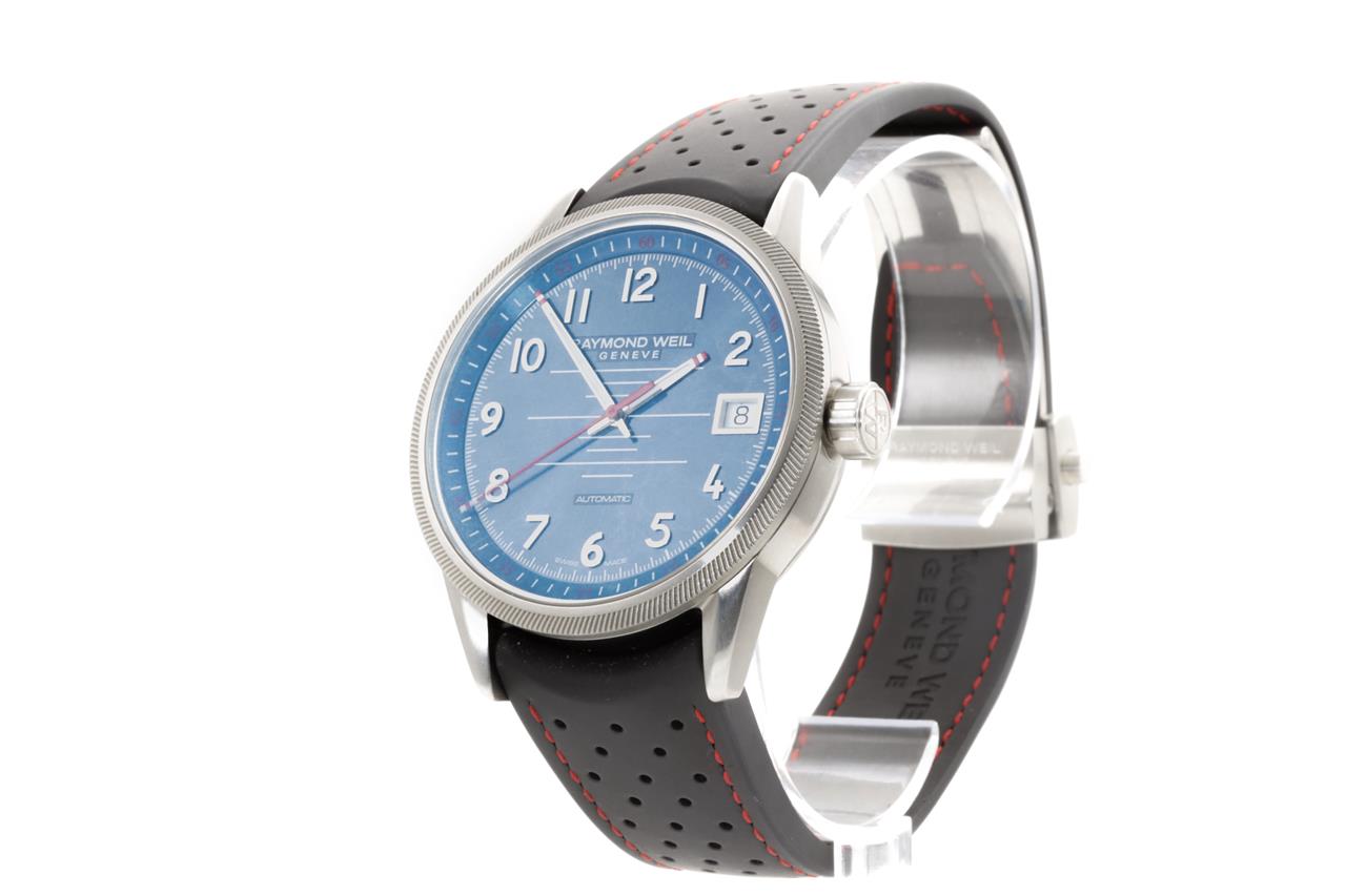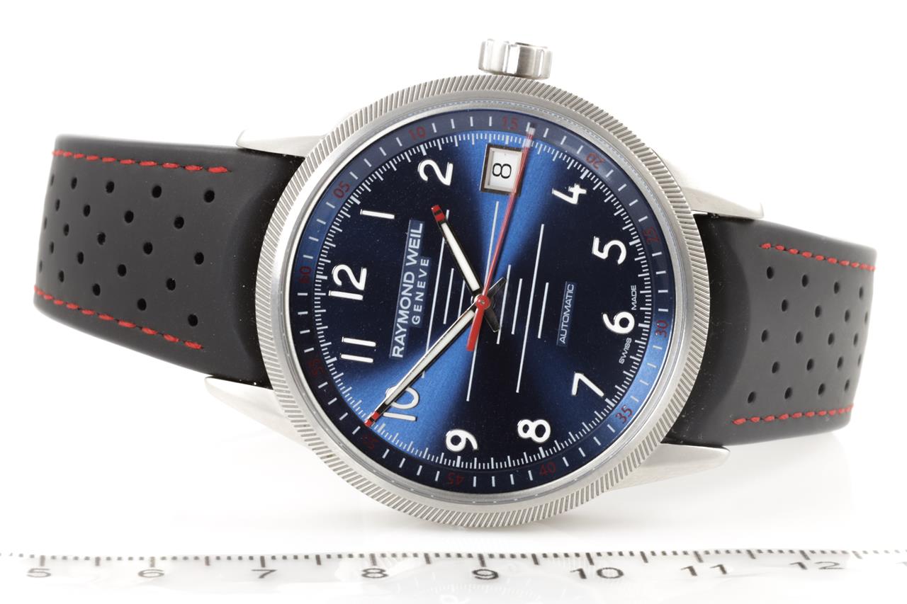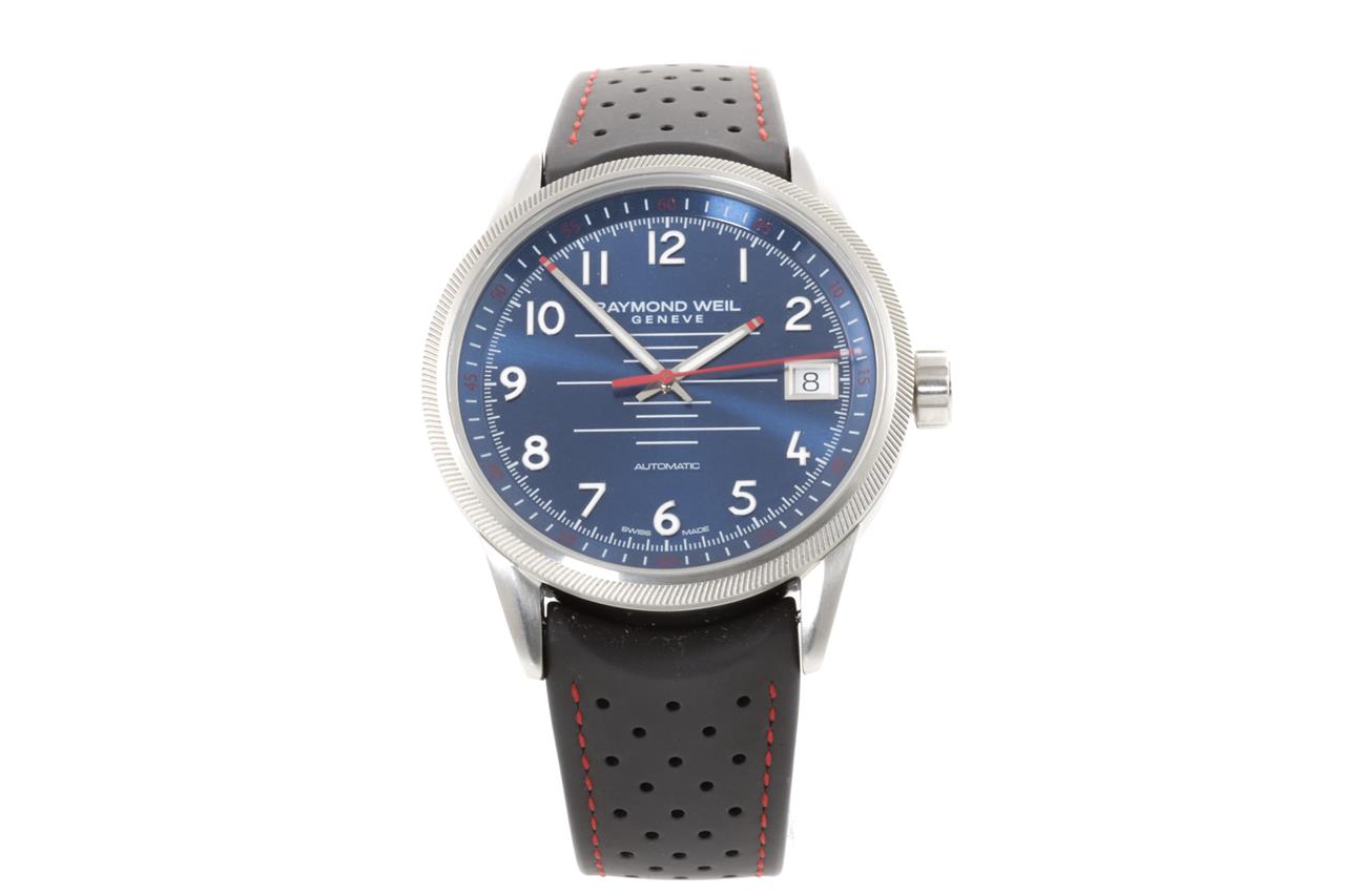 Raymond Weil stainless steel automatic mens watch. Blue dial, date, case diameter: 42mm, wrist size: 21cm (adjustable), Swiss made. Ref# 2754S-R05-500. With Raymond Weil black rubber strap and clasp. Note: minor scratches on case due to being display stock. With Raymond Weil box. 12 month FSA warranty. (As New)