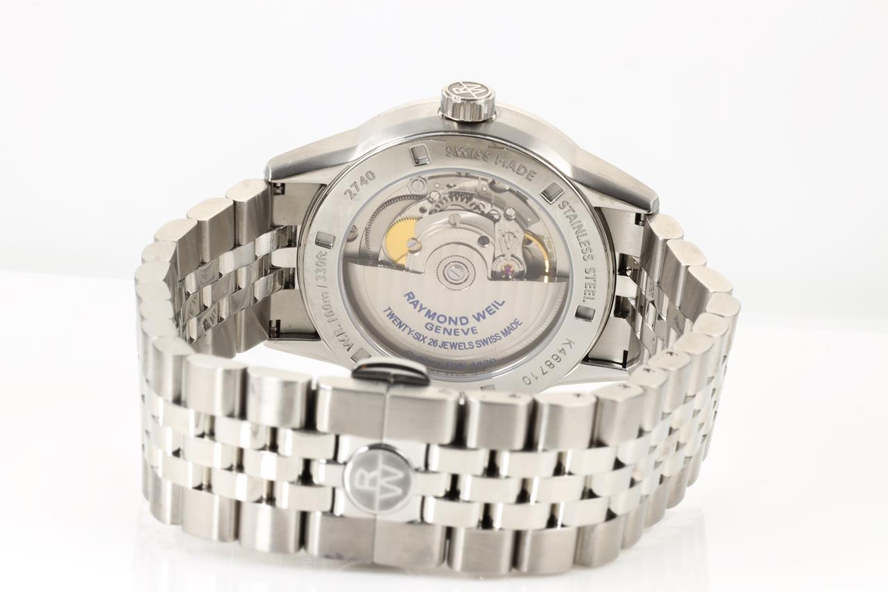 Raymond Weil Freelancer stainless steel automatic mens watch. Black dial, date, case diameter: 42mm, wrist size: 21cm, Swiss Made. Ref# 2740S-T20-021. With Raymond Weil stainless steel bracelet & clasp. Note: minor scratches on case and bracelet due to being display stock. 12 month FSA warranty. (As New)
