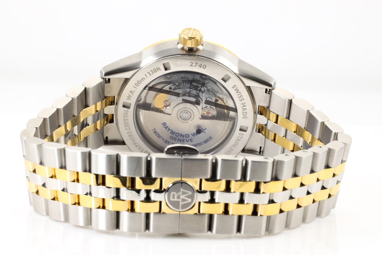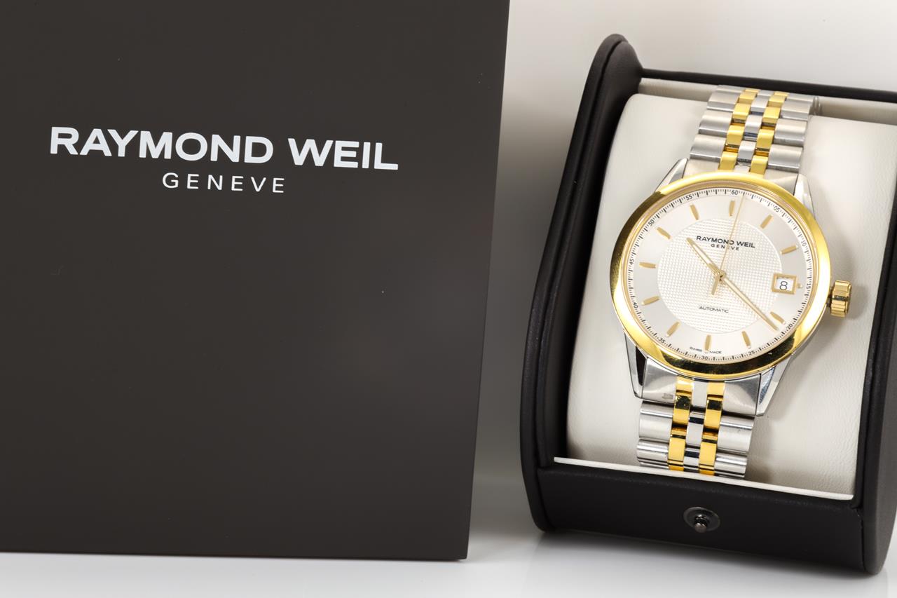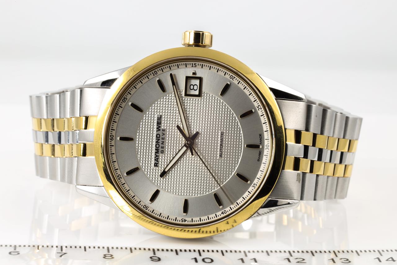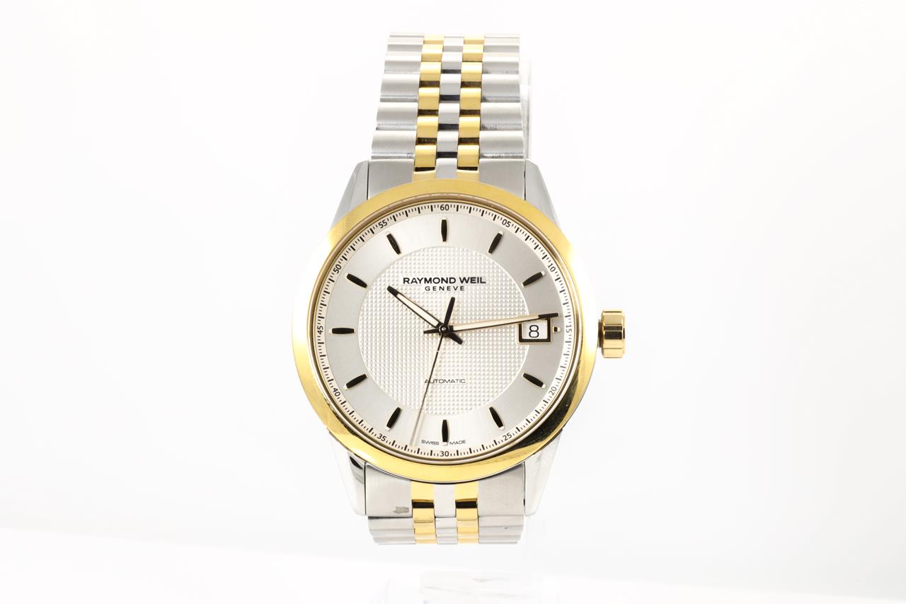 Raymond Weil Freelancer yellow gold PVD stainless steel automatic mens watch. Silver dial, date, case diameter: 42mm, wrist size: 21cm, Swiss made. Ref# 2740S-TP6-5021. With Raymond Weil two-tone bracelet and clasp. Note: minor scratches on case and bracelet due to being display stock. With Raymond Weil box. 12 month FSA warranty. (As new)