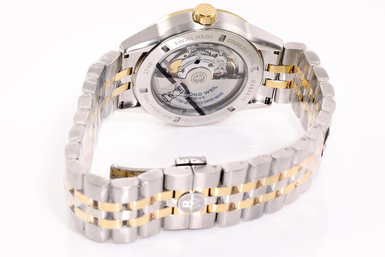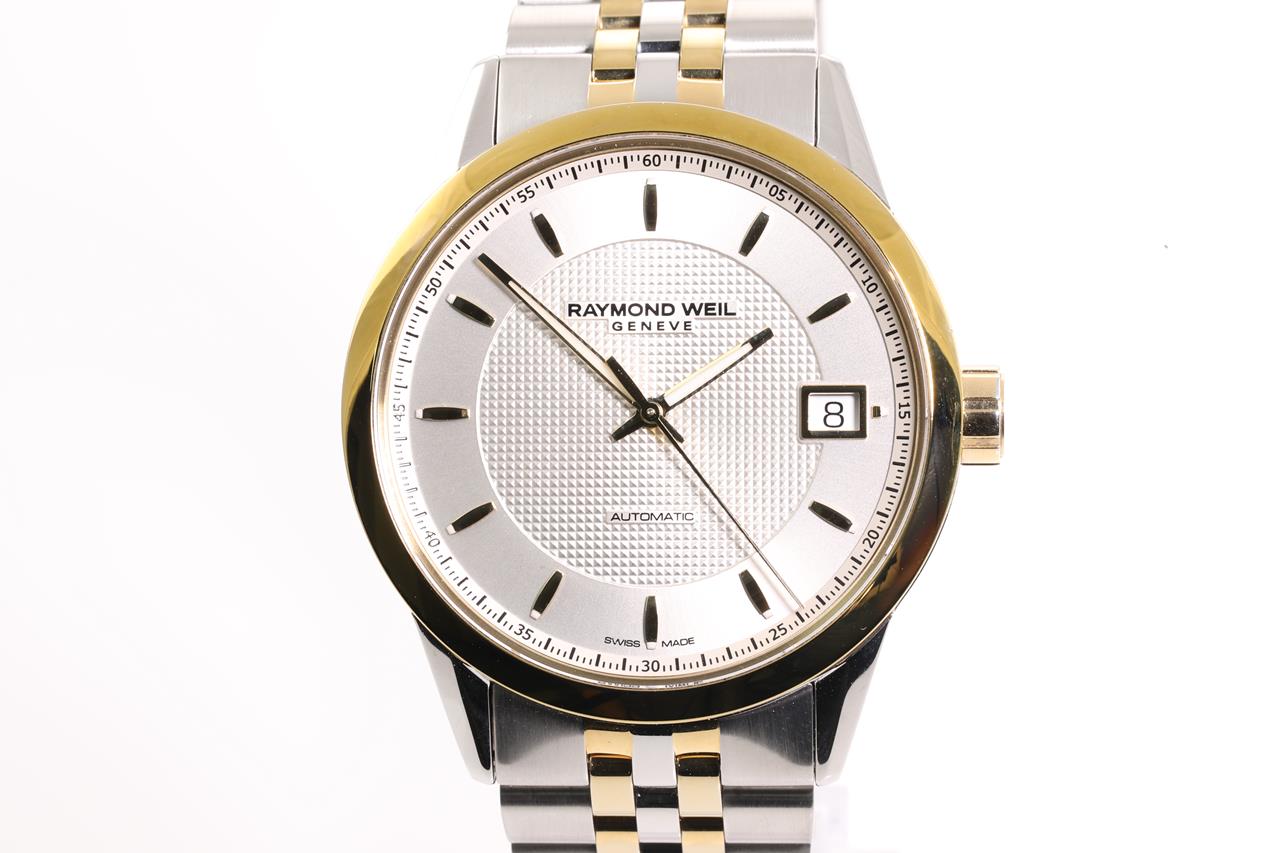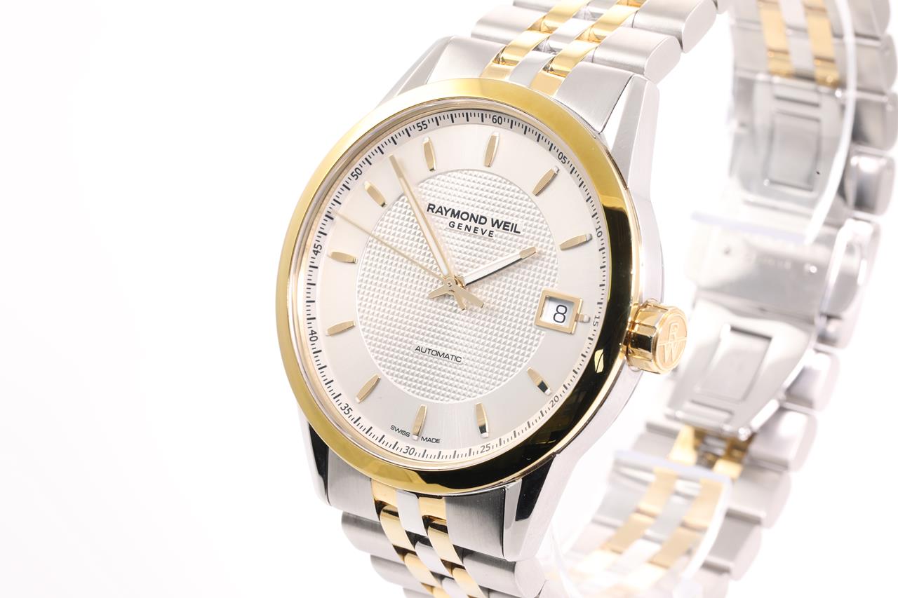 Raymond Weil Freelancer yellow gold PVD stainless steel automatic mens watch. Silver dial, date, case diameter: 42mm, wrist size: 21cm, Swiss made. Ref# 2740S-TP6-5021. With Raymond Weil two-tone bracelet and clasp. Note: minor scratches on case due to being display stock. With Raymond Weil box. 12 month FSA warranty. (As new, in original wrapping)