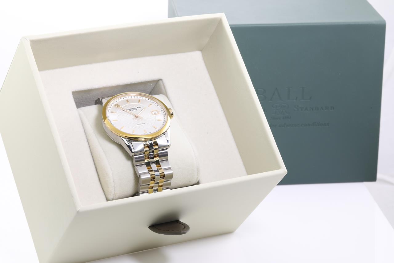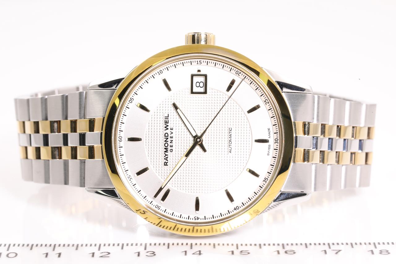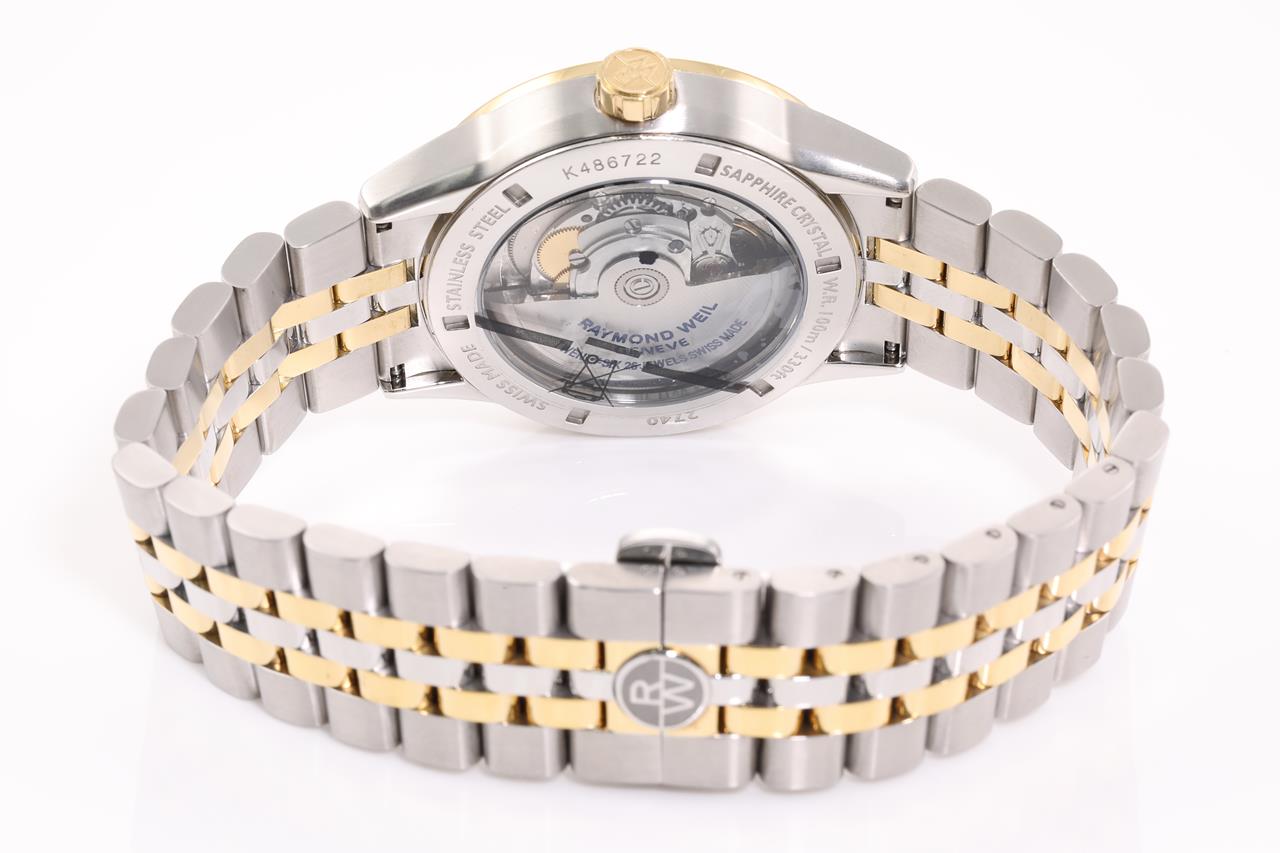 Raymond Weil Freelancer yellow gold PVD stainless steel automatic mens watch. Silver dial, date, case diameter: 42mm, wrist size: 21cm, Swiss made. Ref# 2740S-TP6-5021. With Raymond Weil two-tone bracelet and clasp. Note: minor scratches on case and bracelet due to being display stock. With Raymond Weil box. 12 month FSA warranty. (As new)