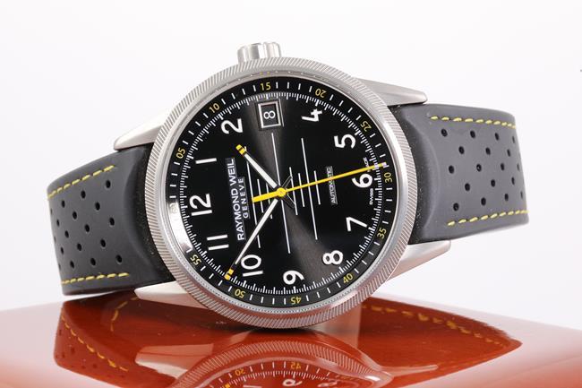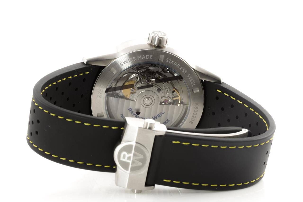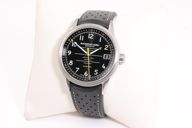 Raymond Weil Freelancer stainless steel automatic mens watch. Black dial, date, case diameter: 42mm, wrist size: 19cm (adjustable), Swiss made. Ref# 2754S-R05-200. With Raymond Weil black rubber strap and clasp. With Raymond Weil box. 12 month FSA warranty. (As New)