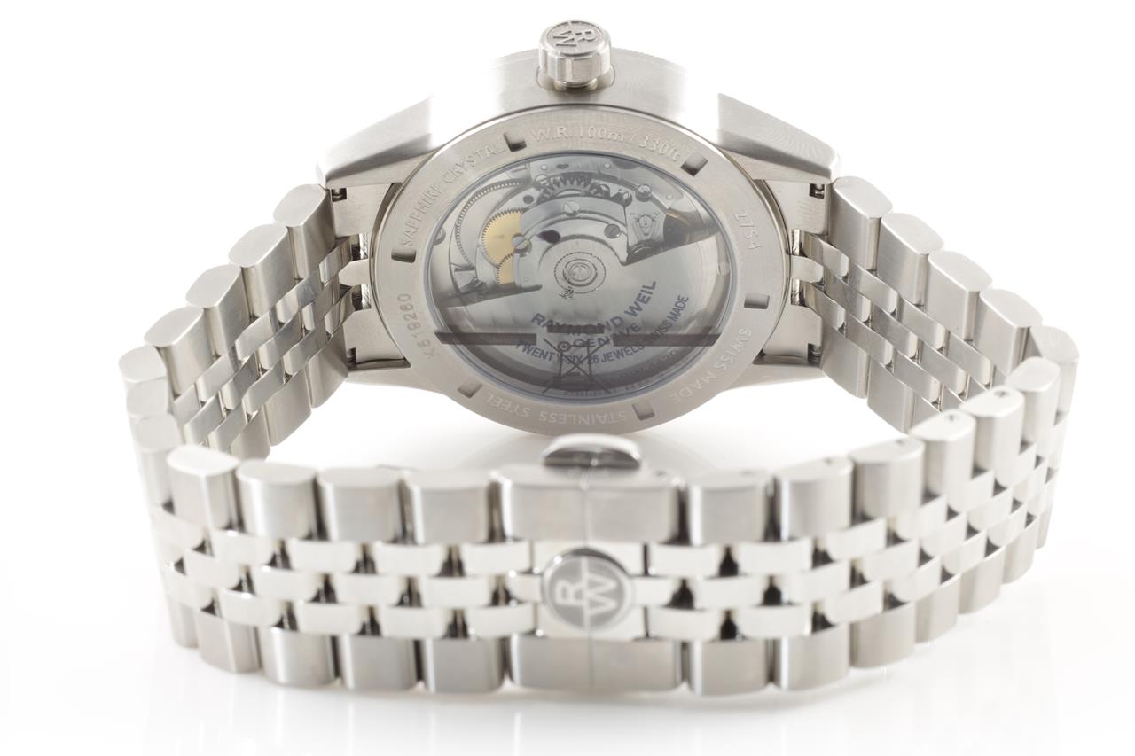 Raymond Weil Freelancer stainless steel automatic mens watch. Black dial, date, case diameter: 42mm, wrist size: 21cm, Swiss made. Ref# 2754S-T05-200. With Raymond Weil stainless steel bracelet and clasp. Note: minor scratches on case and bracelet due to being display stock. With Raymond Weil box. 12 month FSA warranty. (As New)