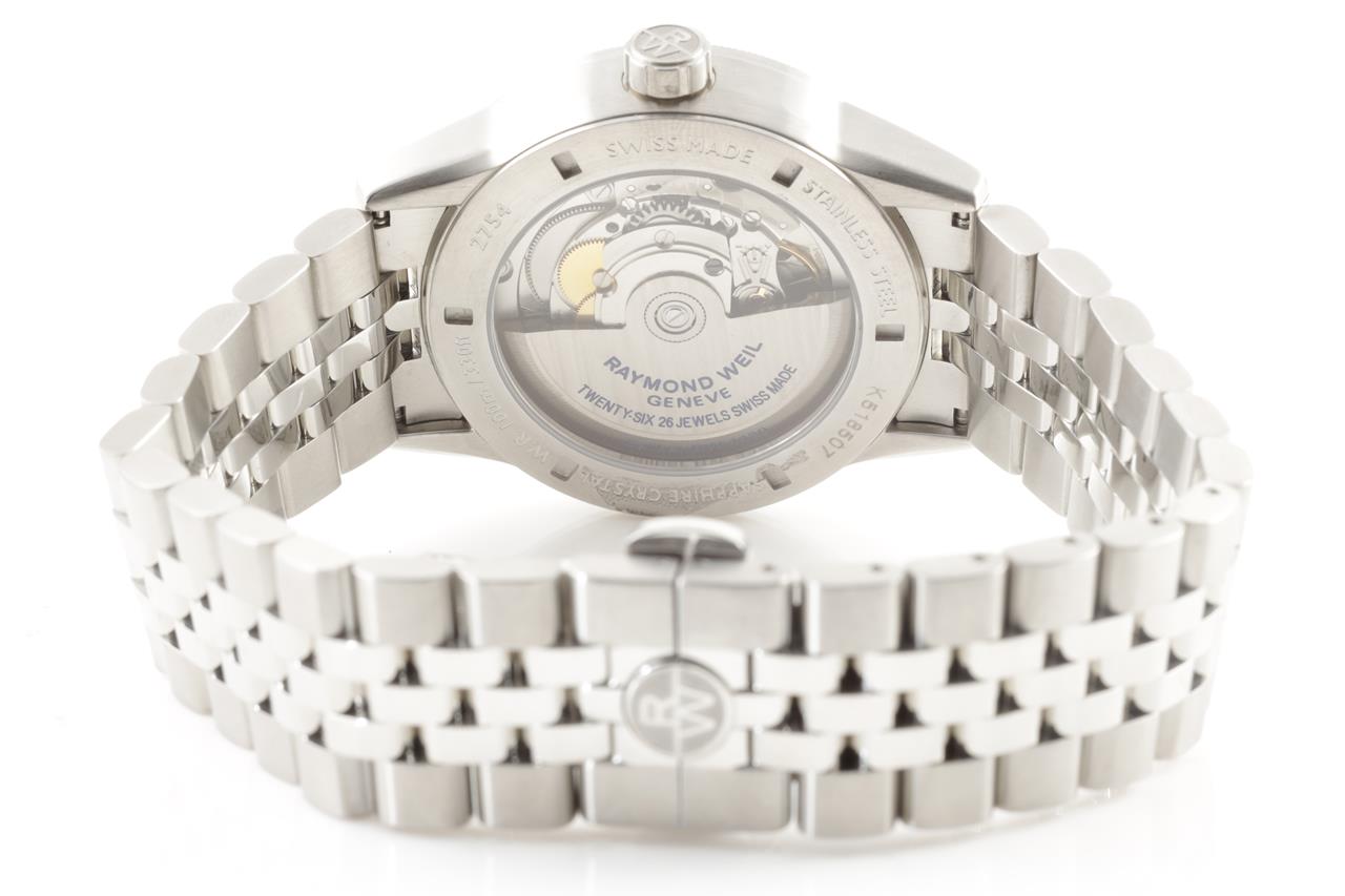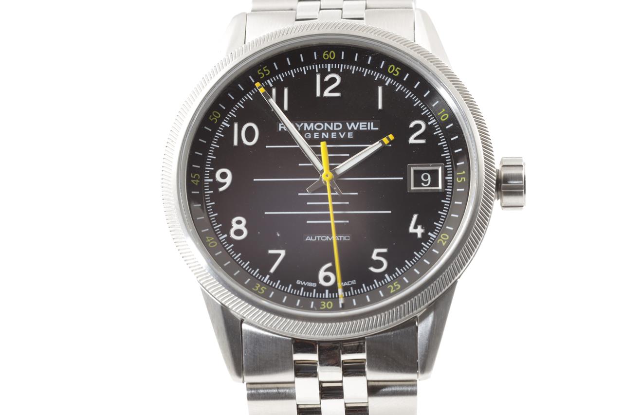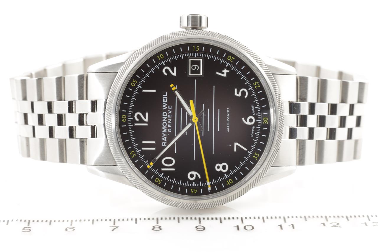 Raymond Weil Freelancer stainless steel automatic mens watch. Black dial, date, case diameter: 42mm, wrist size: 21cm, Swiss made. Ref# 2754S-T05-200. With Raymond Weil stainless steel bracelet and clasp. Note: minor scratches on case and bracelet due to being display stock. With Raymond Weil box. 12 month FSA warranty. (As New)
