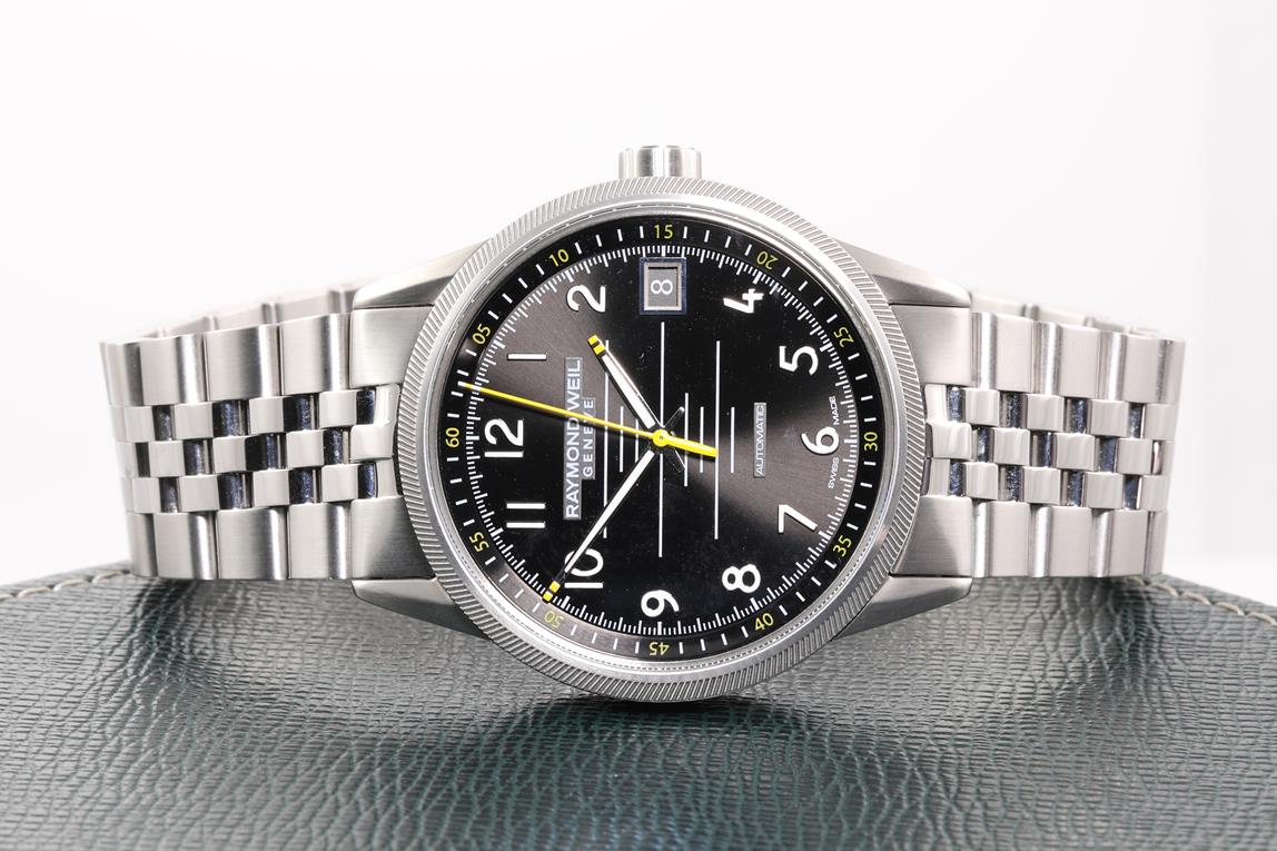 Raymond Weil Freelancer stainless steel automatic mens watch. Black dial, date, case diameter: 42mm, wrist size: 21cm, Swiss made. Ref# 2754S-T05-200. With Raymond Weil stainless steel bracelet and clasp. Note: minor scratches on case and bracelet due to being display stock. With Raymond Weil box. 12 month FSA warranty. (As New)