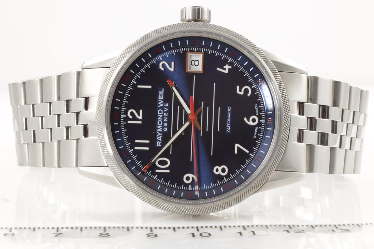 Raymond Weil Freelancer stainless steel automatic mens watch. Blue dial, date, case diameter: 42cm, wrist size: 21cm, Swiss made. Ref# 2754S-T05-500. With Raymond Weil stainless steel bracelet and clasp. Note: minor scratches on case and bracelet due to being display stock. With Raymond Weil box. 12 month FSA warranty. (As New)