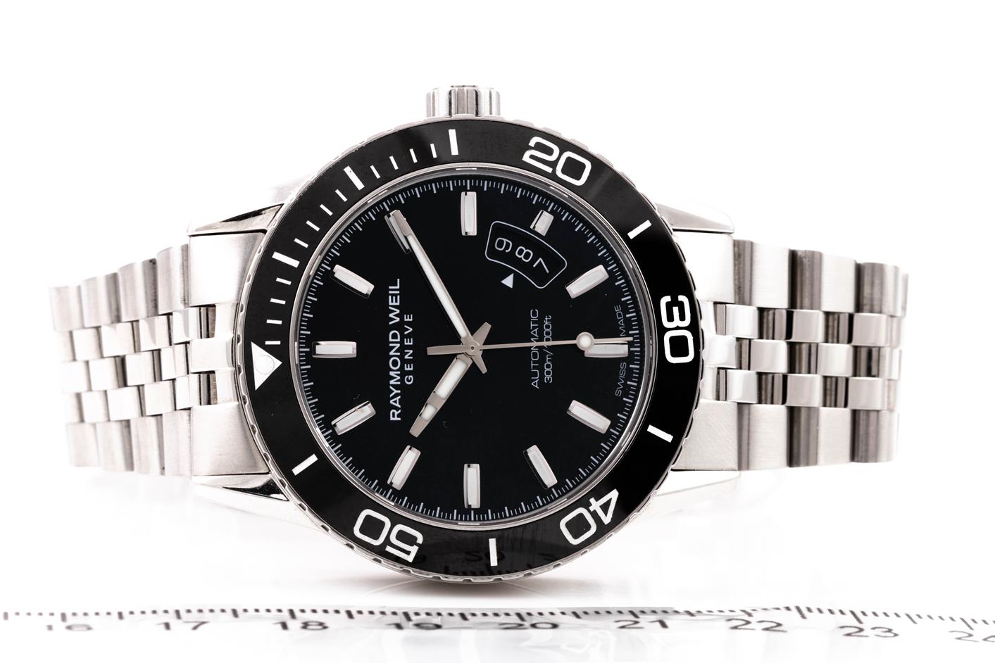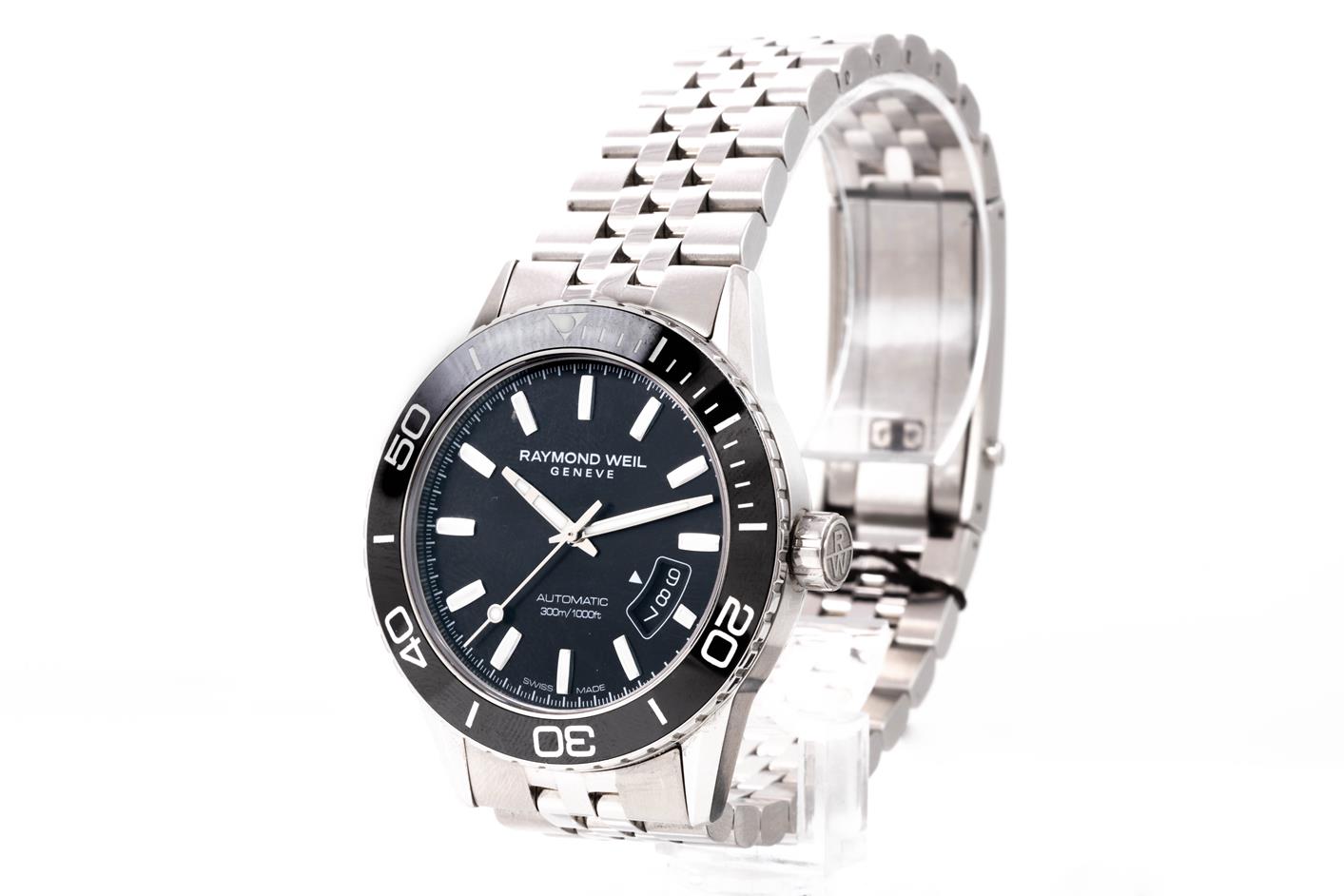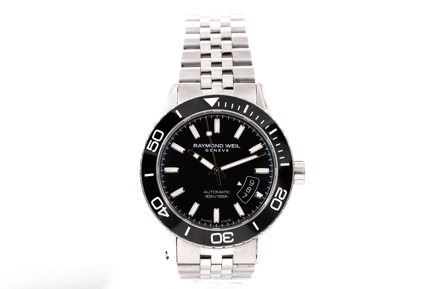 Raymond Weil Freelancer stainless steel automatic mens watch. Black dial, date, case diameter: 42mm, wrist size: 22cm, Swiss made. Ref# 2760-ST1-20001. With Raymond Weil stainless steel bracelet and clasp. With Raymond Weil Guarantee card and Raymond Weil box. 12 month FSA warranty. (As New, Note: minor scratches on case and bracelet due to being display stock)