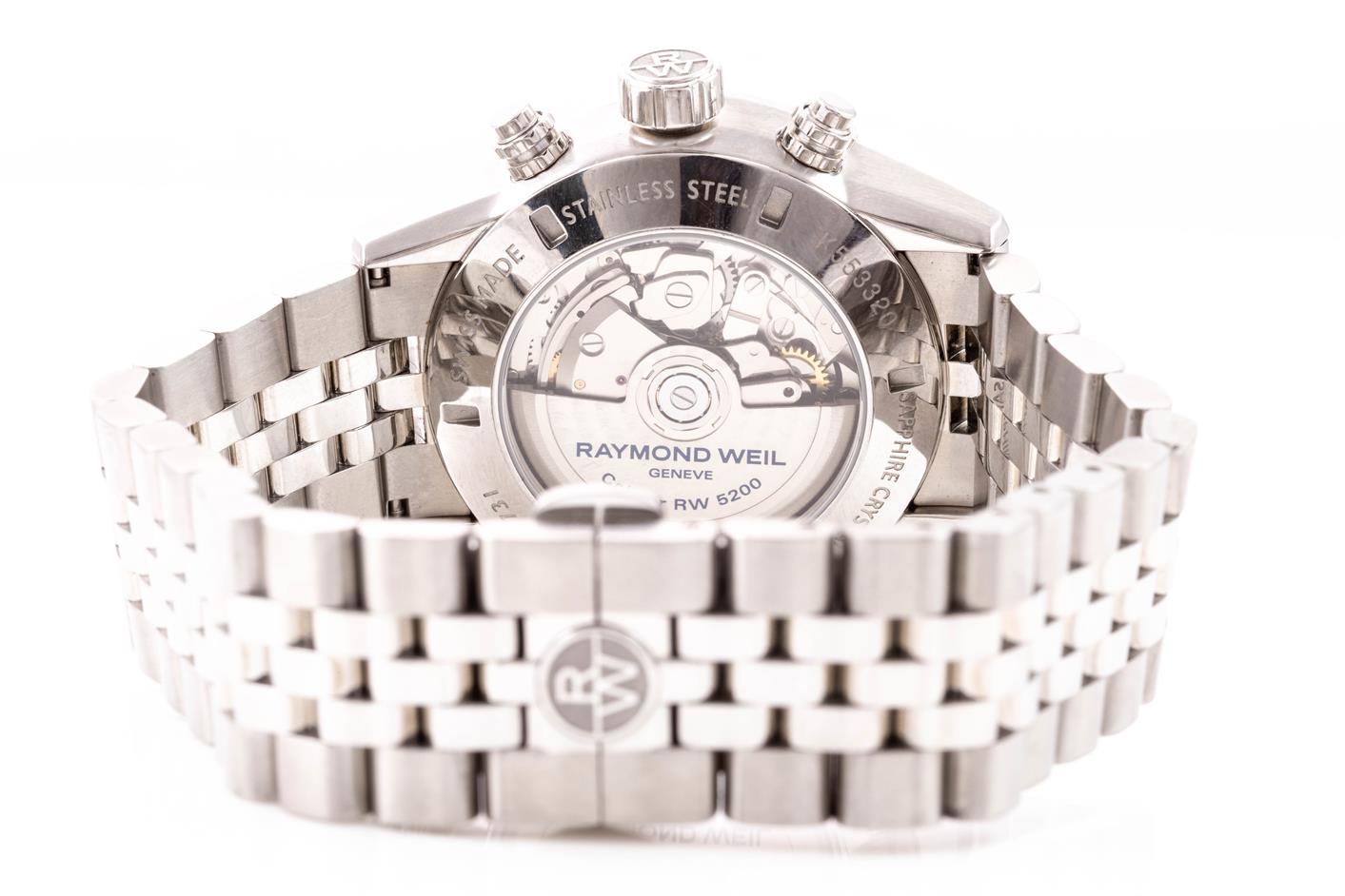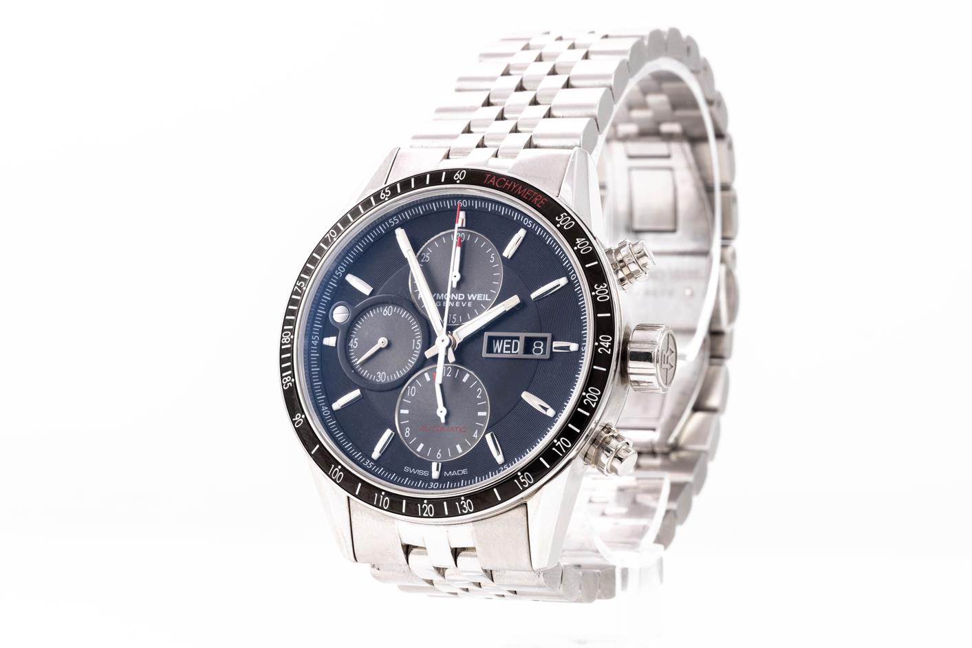 Raymond Weil Freelancer Chronograph stainless steel automatic mens watch. Grey chronograph dial, day & date, case diameter: 42mm, wrist size: 21cm, Swiss made. Ref #7731-ST1-20621. With Raymond Weil Guarantee card and Raymond Weil box. 12 month FSA warranty. (As New, bracelet in original wrapping. Note: minor scratches son case due to being display stock.)