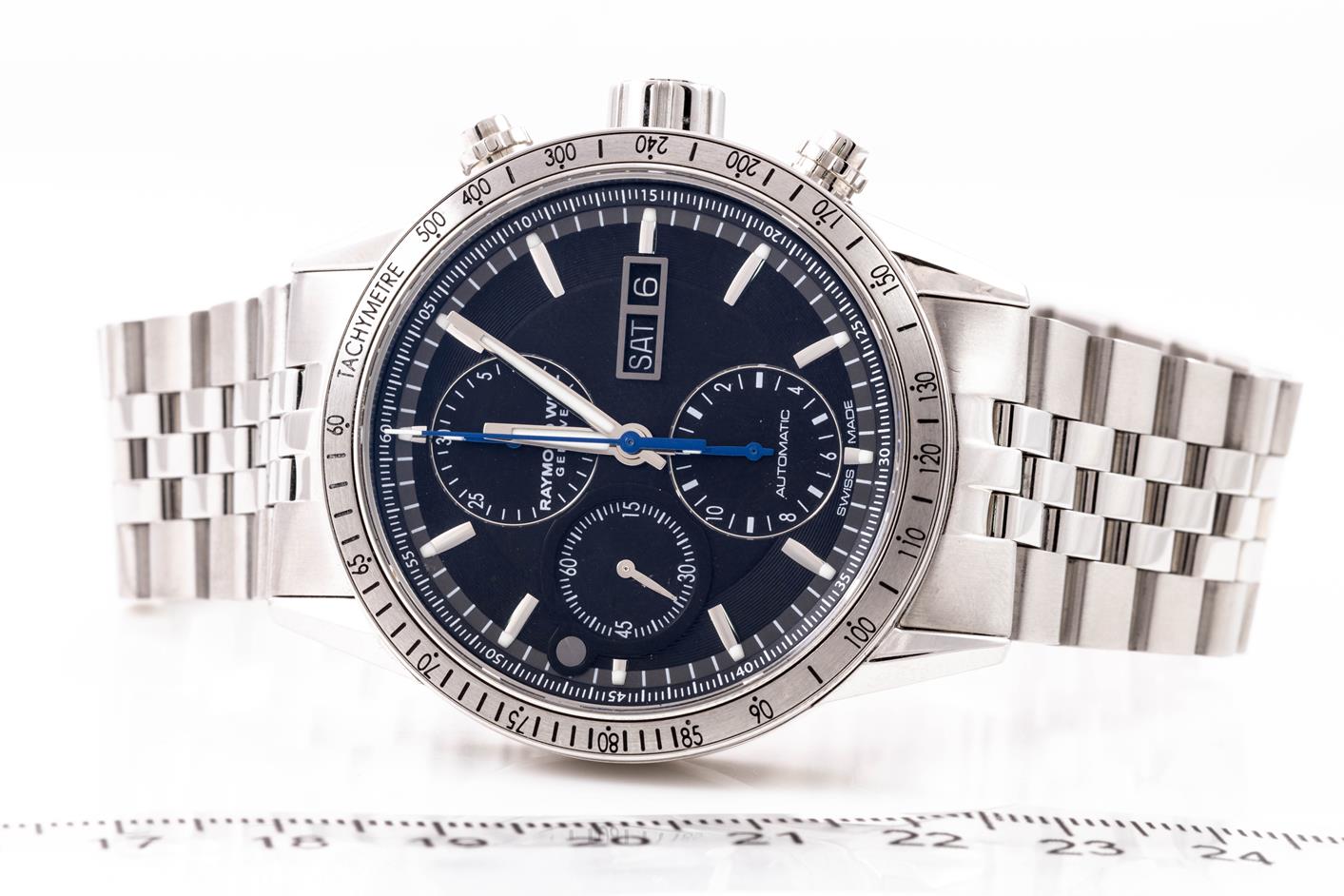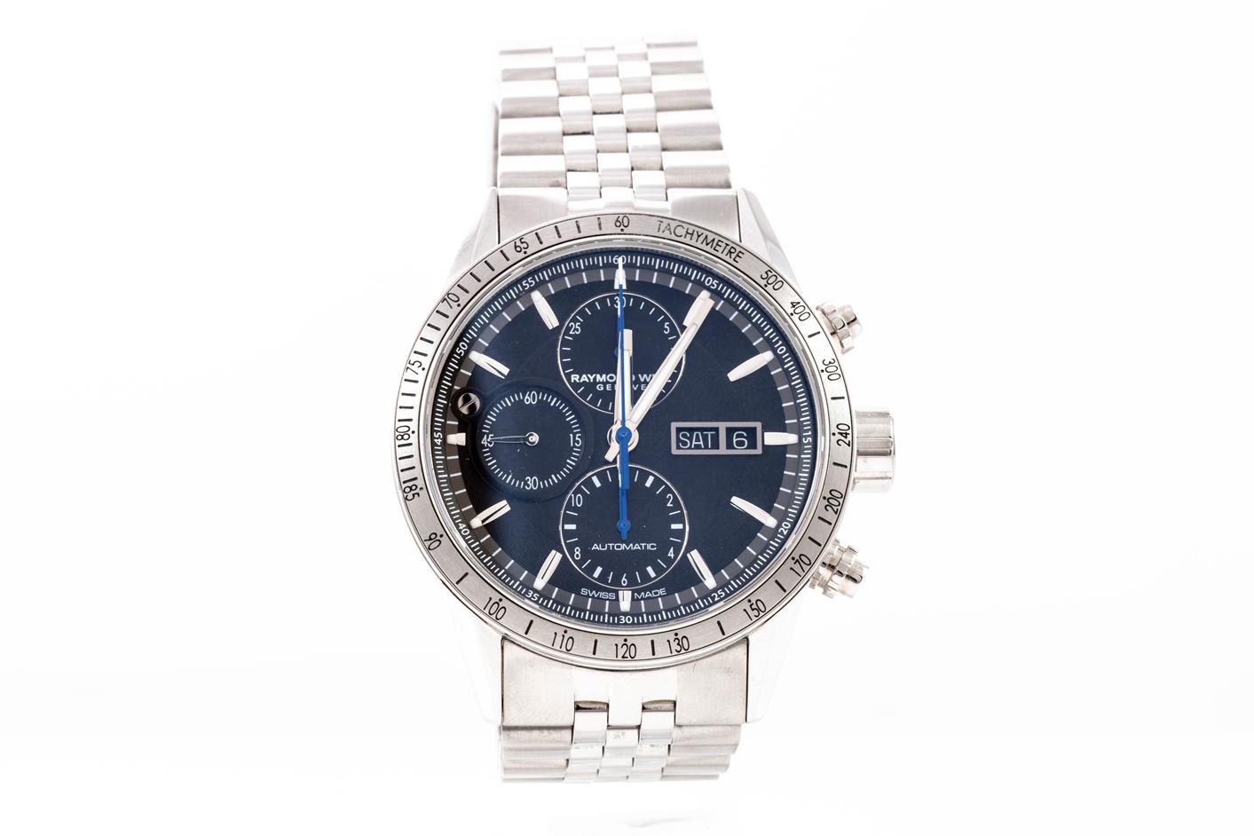 Raymond Weil Freelancer stainless steel automatic men's watch. Black chronograph dial, day & date, wrist size: 21cm, case diameter: 42.5mm, Swiss made. Ref# 7731-ST-20021. With Raymond Weil bracelet and clasp. With Raymond Weil Guarantee card and Raymond Weil box. 12 month FSA warranty. (As New, Note: scratches on case and bracelet due to being display stock)