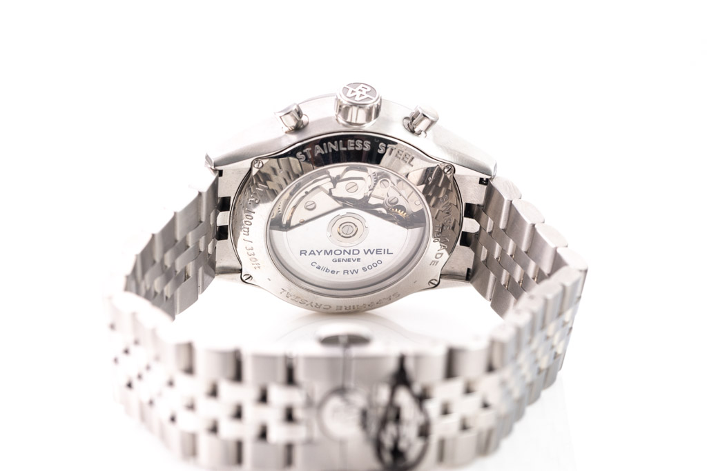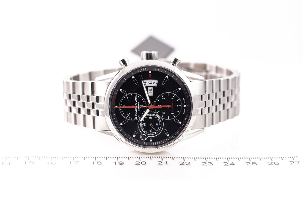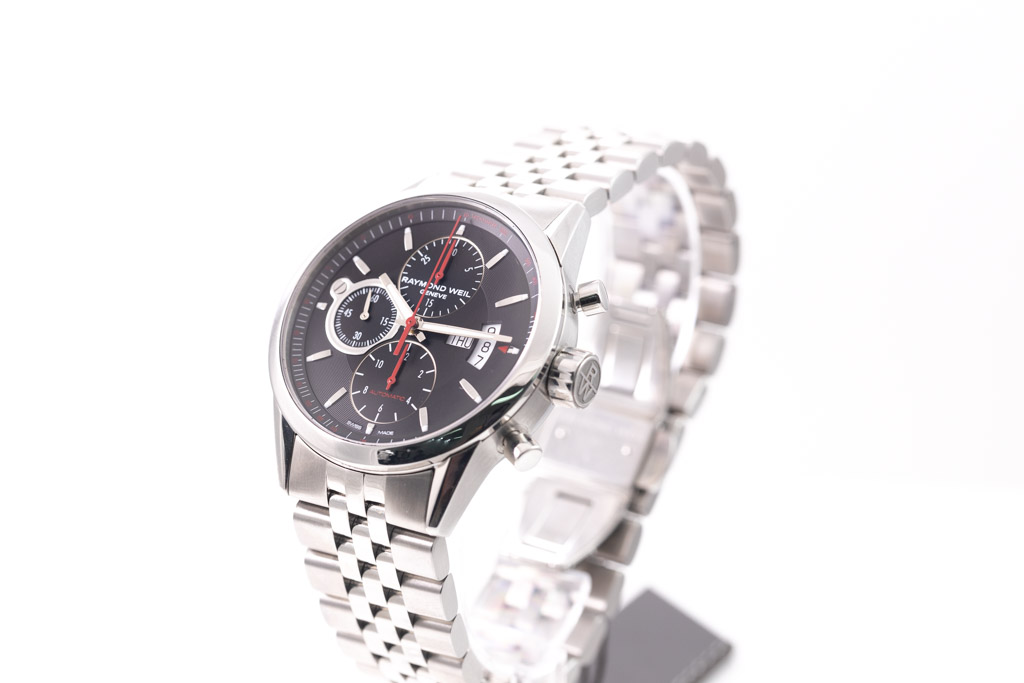 NO BOX IMAGE: Raymond Weil Freelancer stainless steel automatic mens watch. Black chronograph dial, date, case diameter: 42mm, wrist size: 21.5cm, Swiss made. Ref# 7730-ST-20041. With Raymond Weil stainless steel bracelet and clasp. With Raymond Weil International Guarantee card and Raymond Weil box. 12 month FSA warranty (As new, Note: minor scratches on case and bracelet due to being display stock)