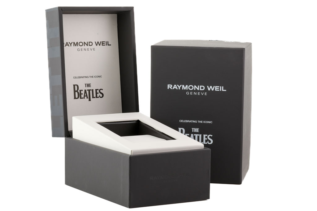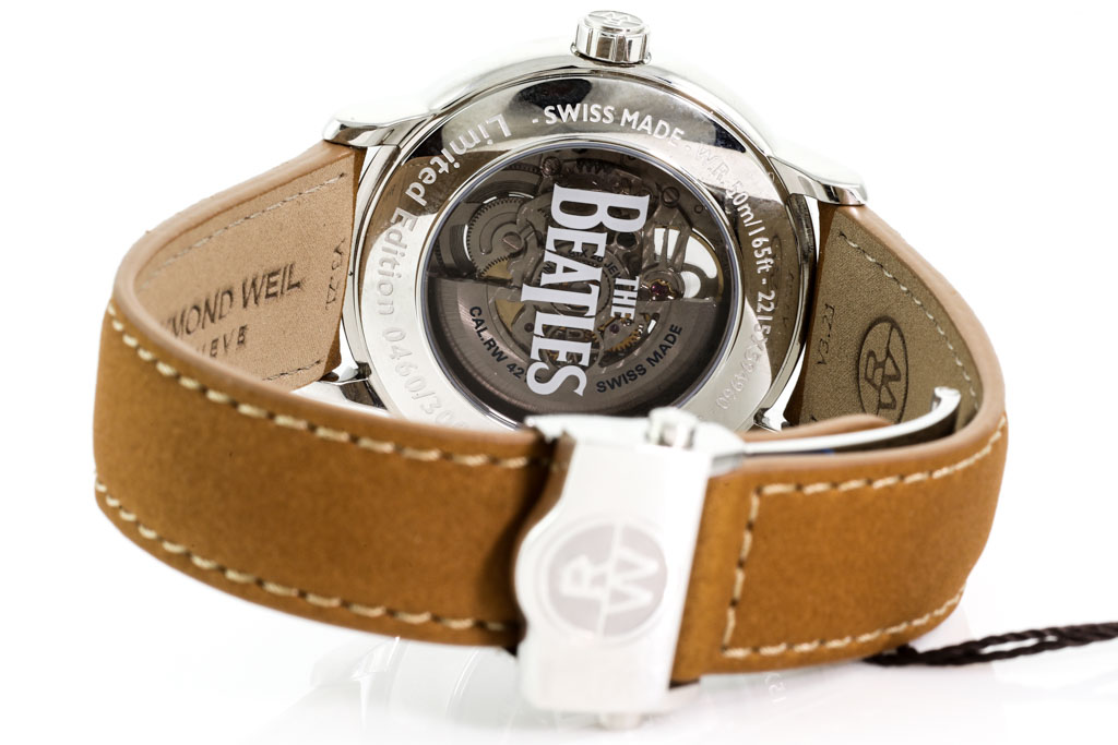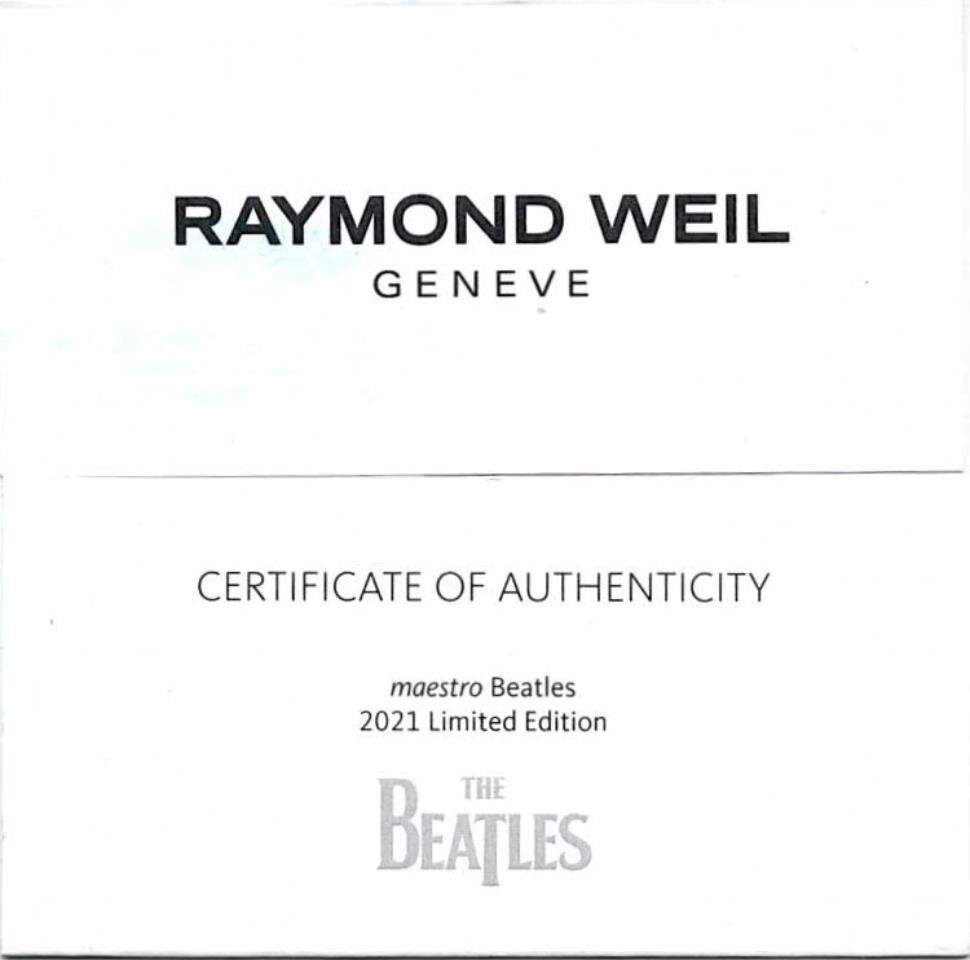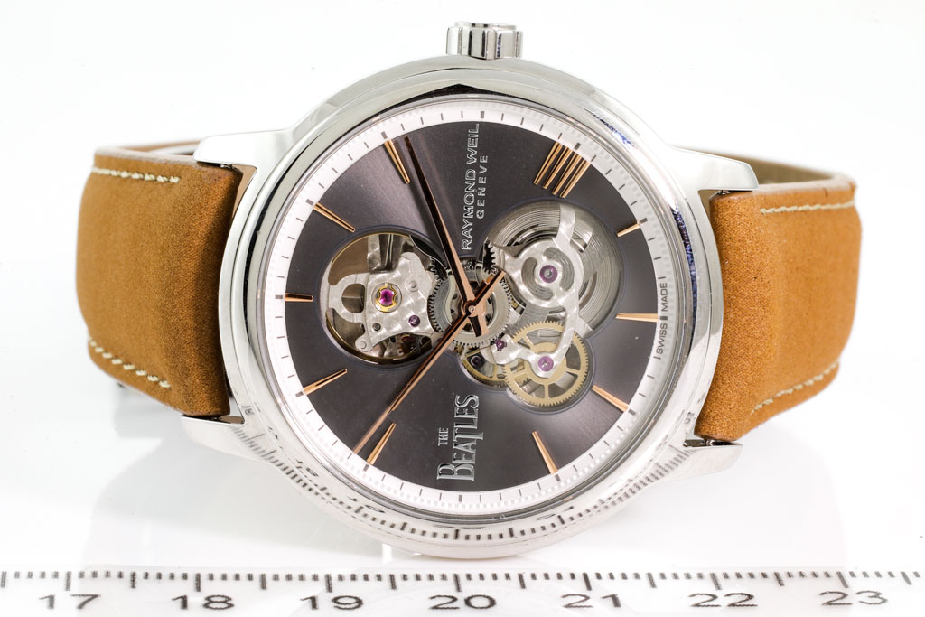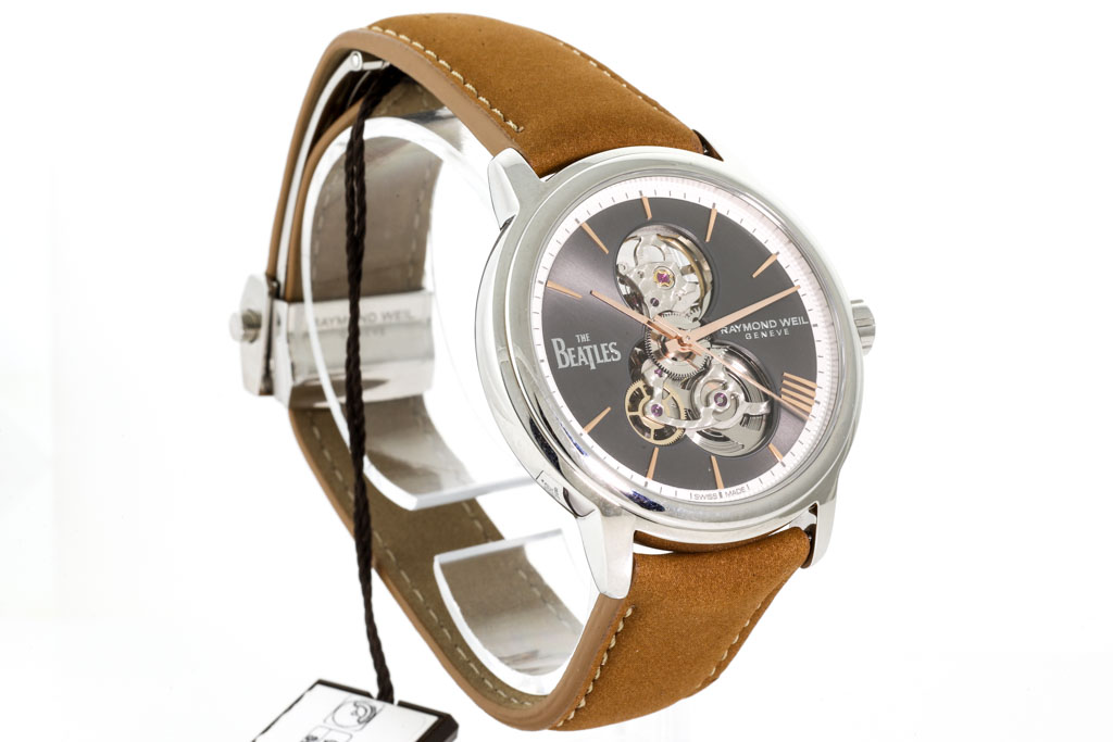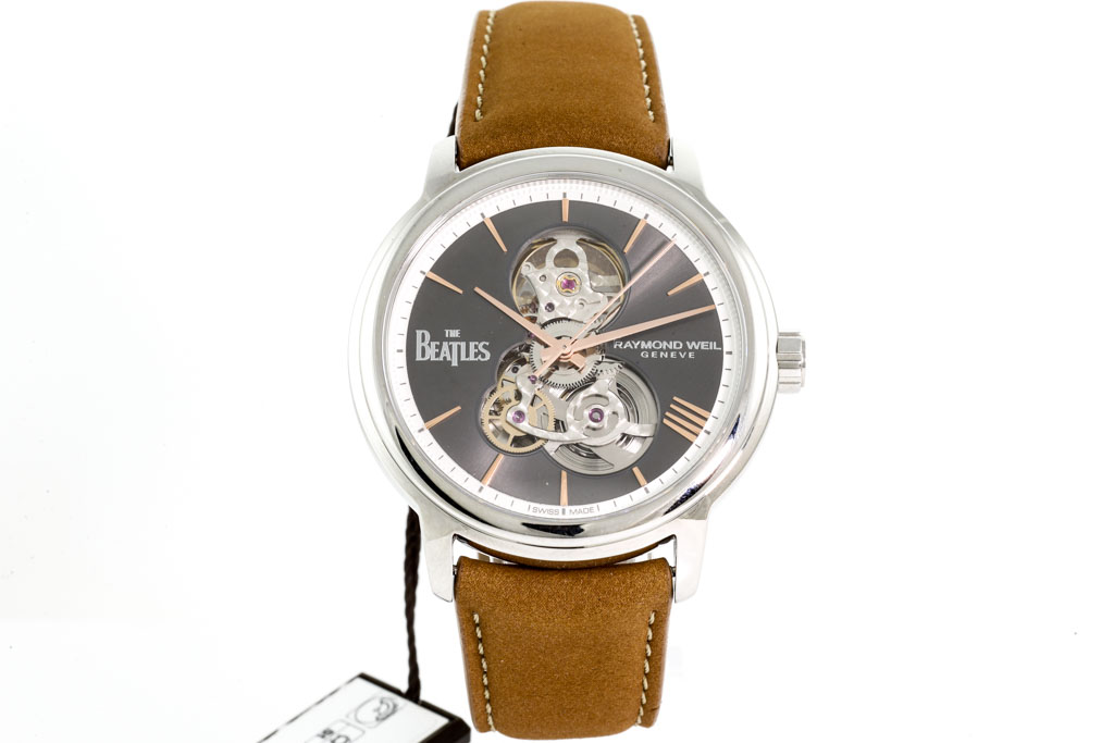 Raymond Weil Maestro Beatles Limited Edition of 3000 stainless steel automatic mens watch. Grey skeleton dial, case diameter: 40mm, strap length: 21.5cm, Swiss made. Ref# 2215-STC-BEAT4. With Raymond Weil brown leather strap and clasp. With Raymond Weil International Guarantee card, Raymond Weil Certificate of Authenticity and Raymond Weil box. 12 month FSA warranty. (As new, Note: minor scratches on case and minor light wear on strap due to being display stock)