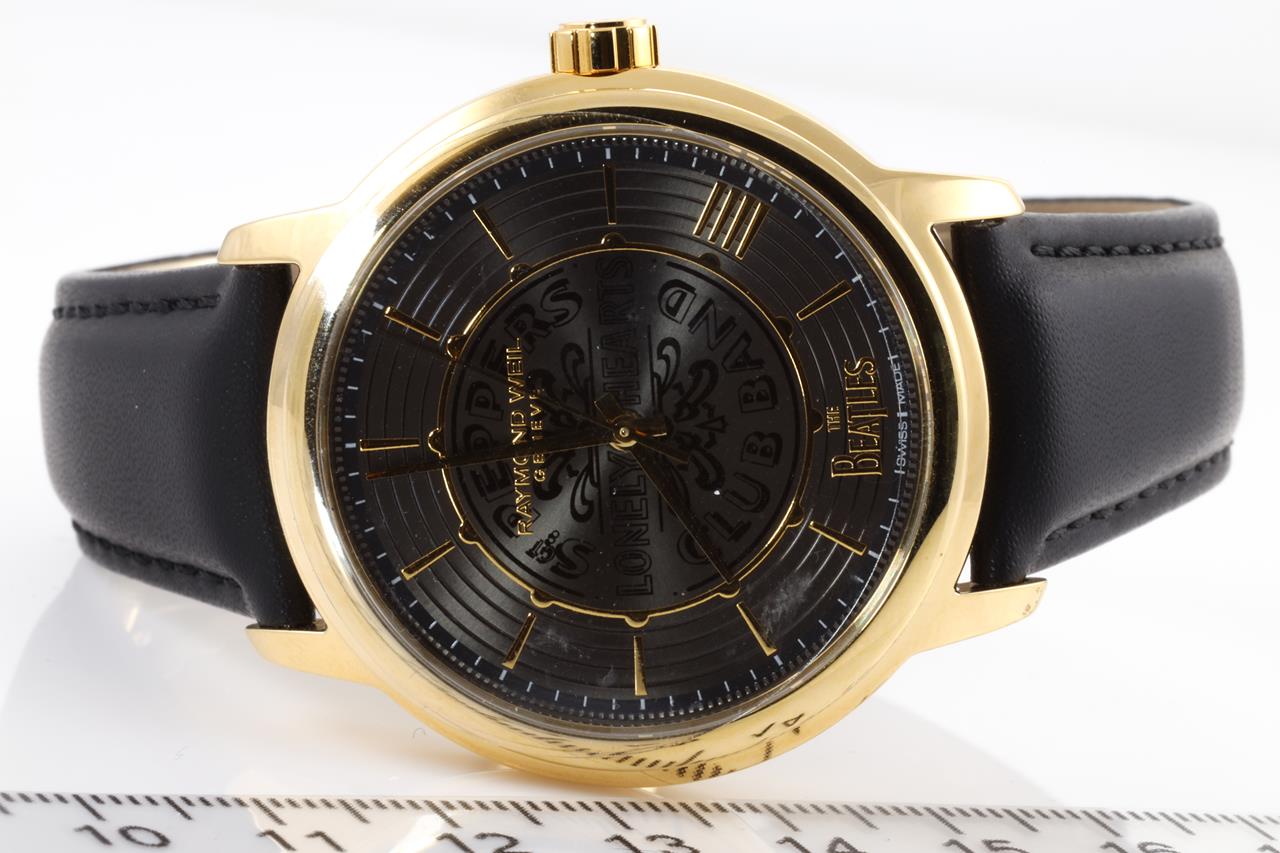 Raymond Weil Maestro The Beatles Sgt. Pepper Limited edition automatic mens watch. Black dial, case diameter; 40mm. Swiss made. Ref# 2237-PC-BEAT3. With Raymond Weil black polyurethane strap. With Raymond Weil box. 12 month FSA warranty. (New)