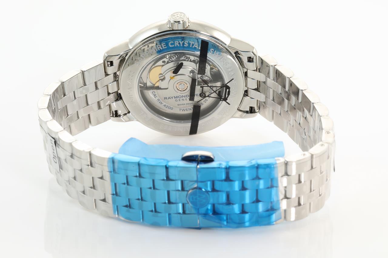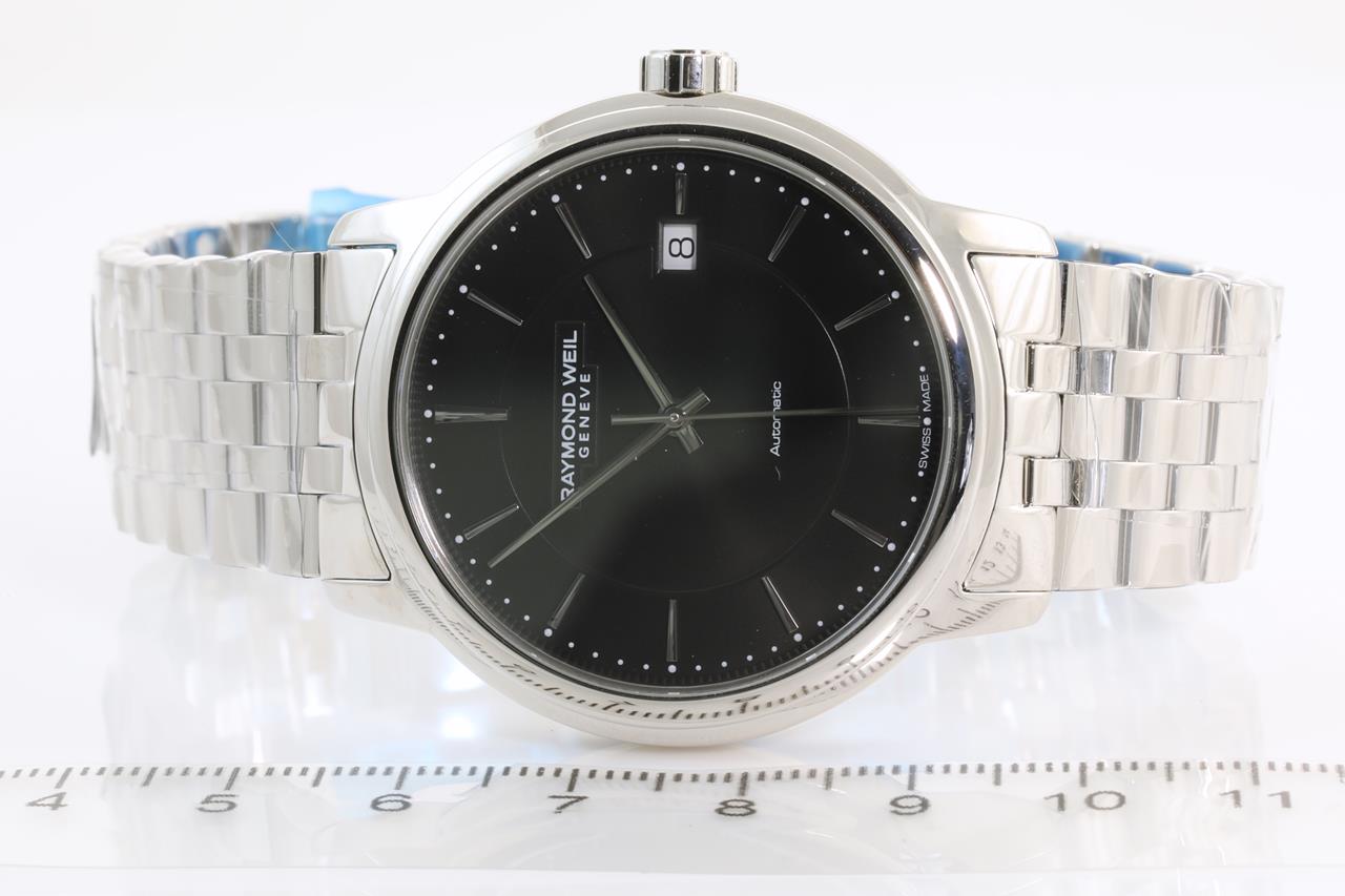 Raymond Weil Maestro stainless steel automatic mens watch. Black dial, date, case diameter; 40mm. Swiss made. Ref# 2237-ST-20011. With Raymond Weil stainless steel bracelet and clasp. With Raymond Weil box. 12 month FSA warranty. (New, in original wrapping)