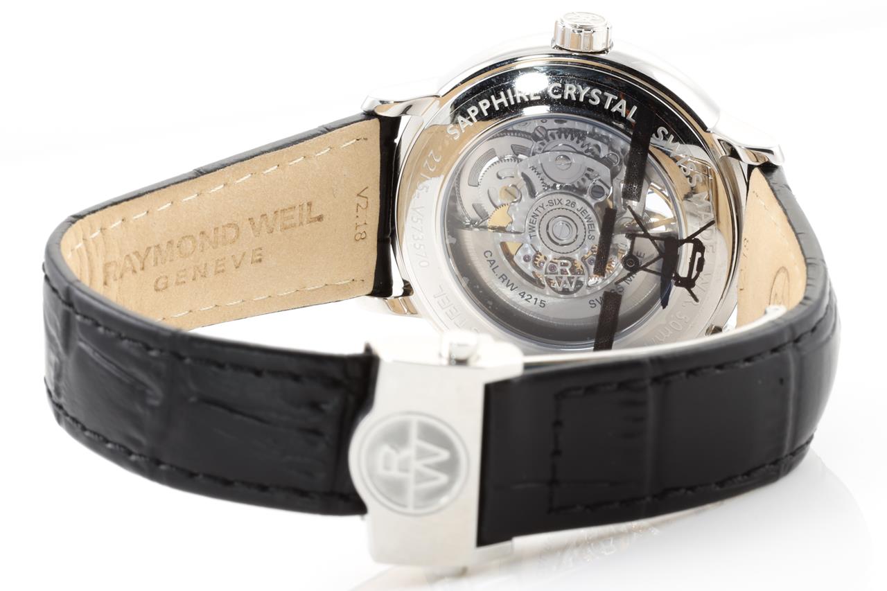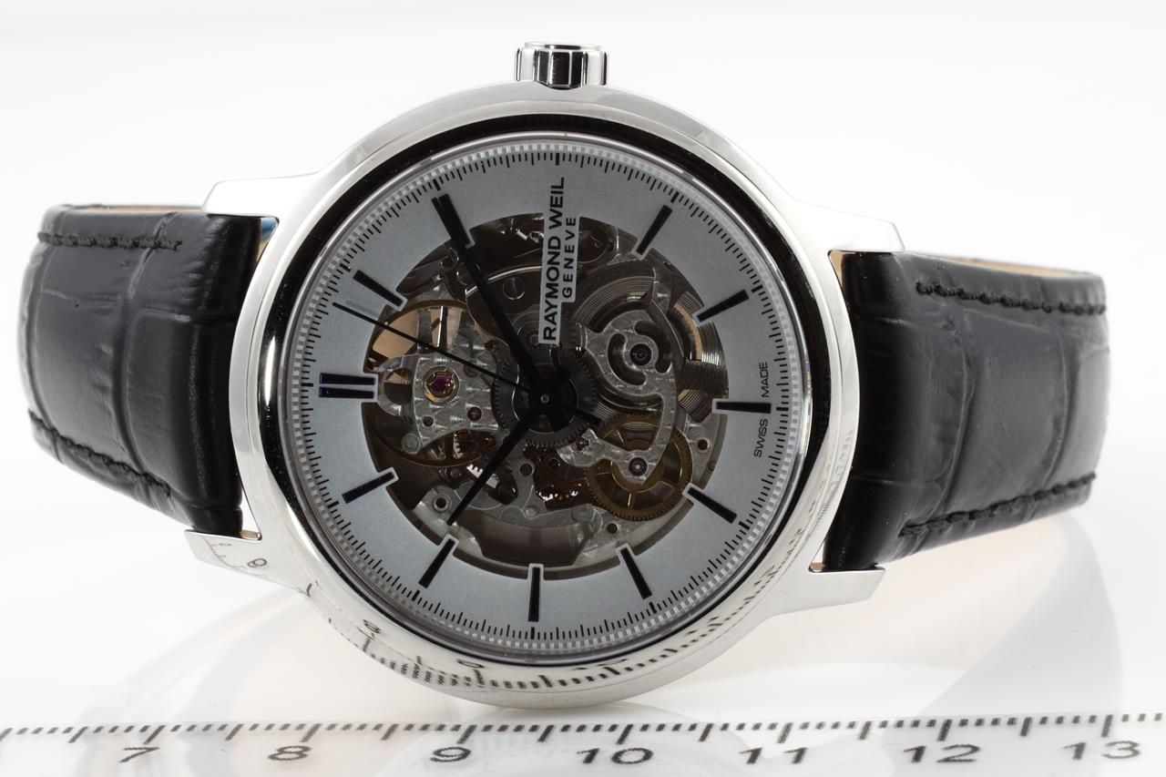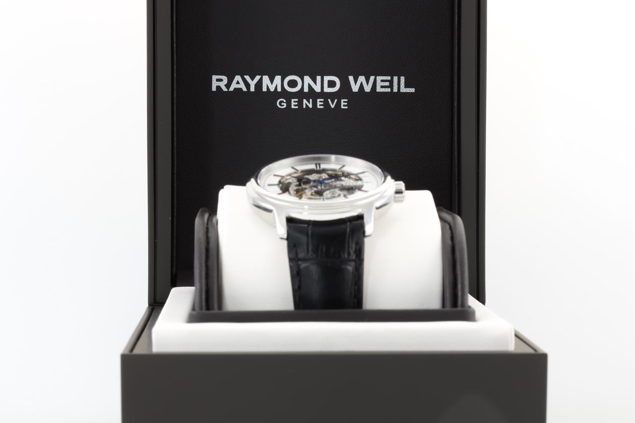 Raymond Weil Maestro automatic mens watch. White and mechanical dial, case diameter; 40mm. Swiss made. Ref# 2215-STC-65001. With Raymond Weil black leather strap. With Raymond Weil box. 12 month FSA warranty. (New, in original wrapping)