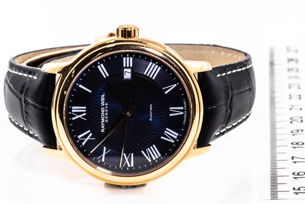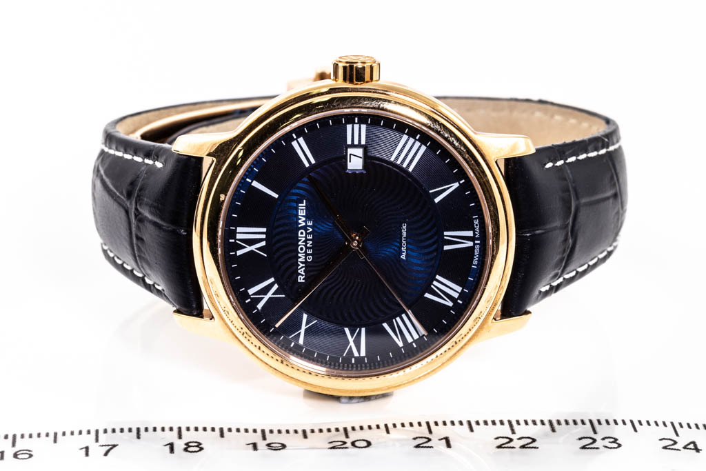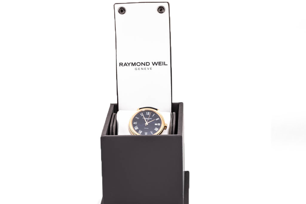 Raymond Weil Maestro rose tone PVD stainless stee automatic mens watch. Blue dial, date, case diameter 40mm, adjustable max wrist size: 20cm, Swiss made. Ref# 2237-PC5-00508. With Raymond Weil blue leather strap and clasp. With Raymond Weil Guarantee card and Raymond Weill box. 12 month FSA warranty. (As New, Note: light wear on strap and minor scratches on case due to being display stock)