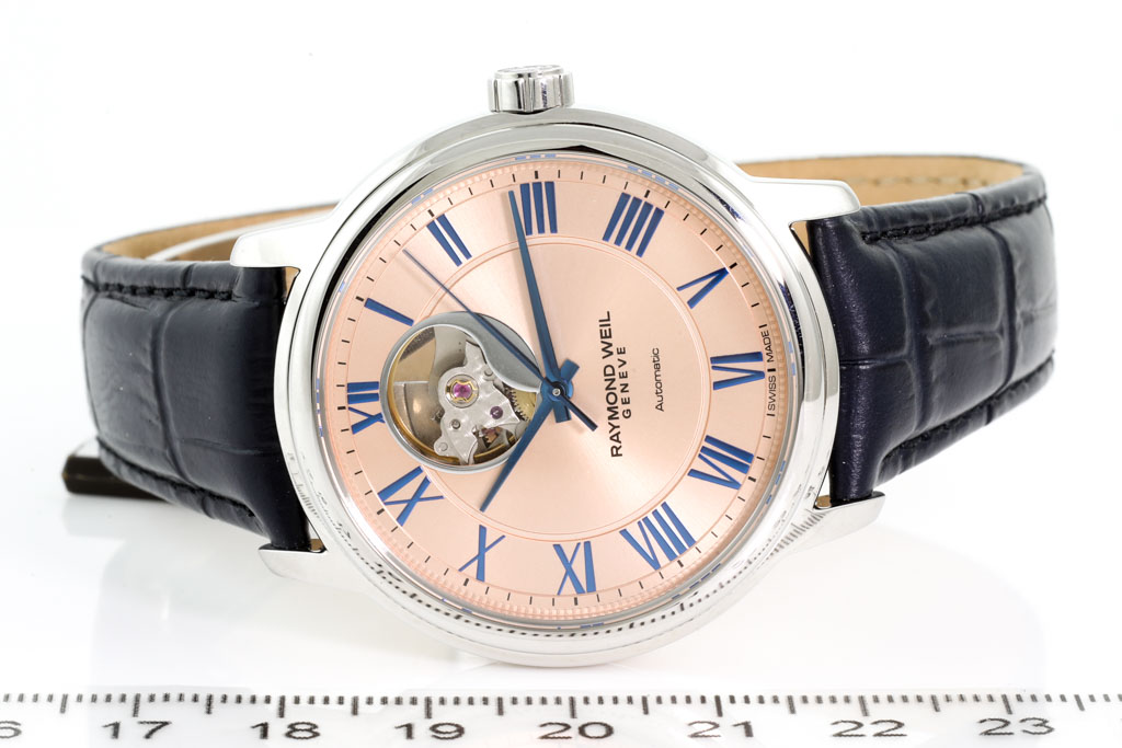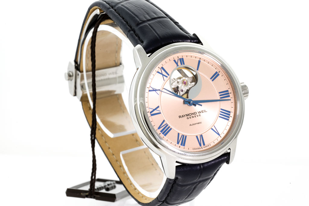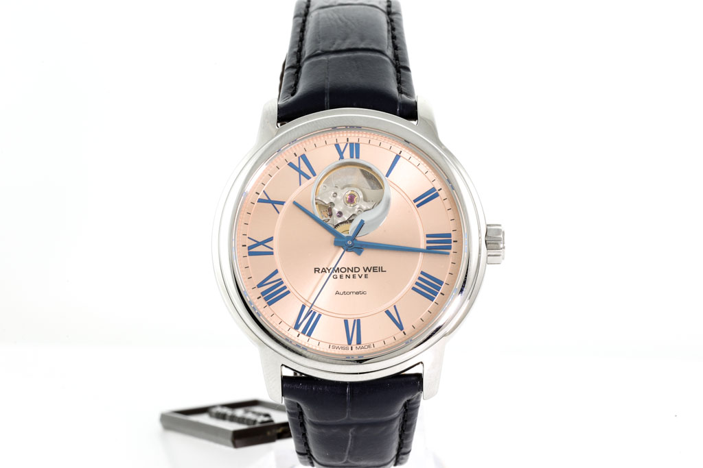 Raymond Weil Maestro Open Heart stainless steel automatic mens watch. Salmon dial, case diameter: 40mm, strap length: 21cm, Swiss made. Ref# 2227-STC-00808. With Raymond Weil black leather strap and clasp. With Raymond Weil International Guarantee card and Raymond Weil box. 12 month FSA warranty. (As new, Note: minor scratches on case and minor light wear on strap due to being display stock)