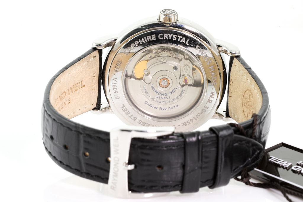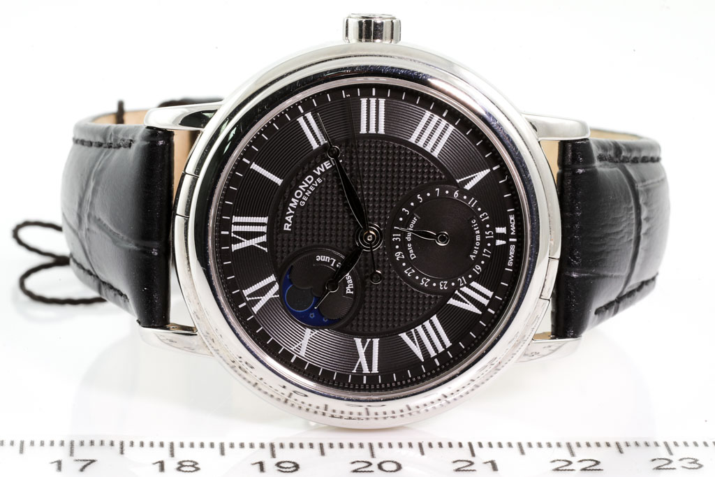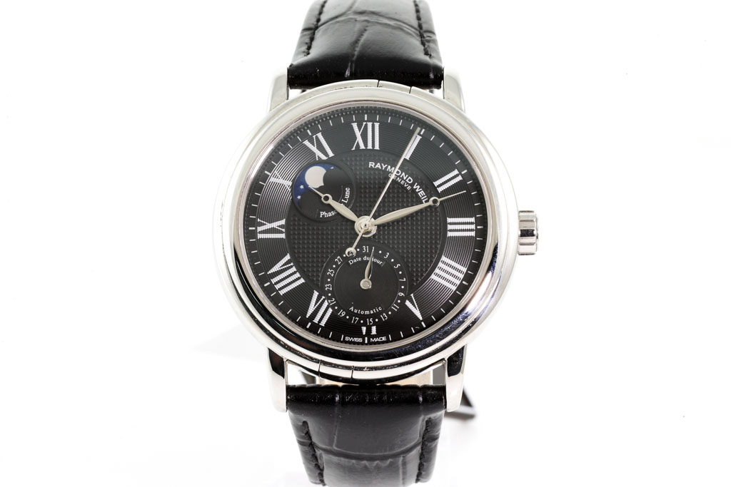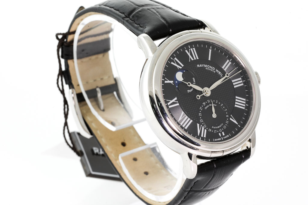 Raymond Weil Maestro stainless steel automatic mens watch. Black dial, date, case diameter: 39.5cm, strap length: 39.5cm, Swiss made. Ref# 2839-STC-00209. With Raymond Weil black leather strap and buckle. With Raymond Weil International Guarantee card and Raymond Weil box. 12 month FSA warranty (As new, Note: light wear on strap and minor scratches on case due to being display stock)