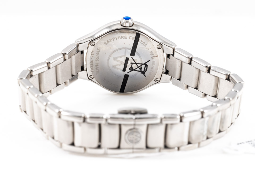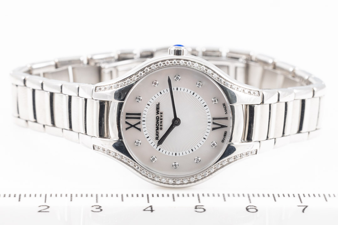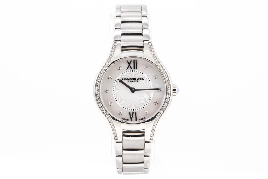 Raymond Weil Noemia stainless steel quartz ladies watch. Mother of Pearl dial, Diamond on bezel, Diamond indicators, case diameter: 27mm, wrist size:17.5cm, Swiss made. Ref# 5127-STS-00985. With Raymond Weil stainless steel bracelet & clasp. With Raymond Weil Certificate of Authenticity card - not stamped so the Raymond Weil warranty does not apply. With Raymond Weil Box. 3 month FSA warranty. (As New, Note: minor scratches on case and bracelet due to being display stock)