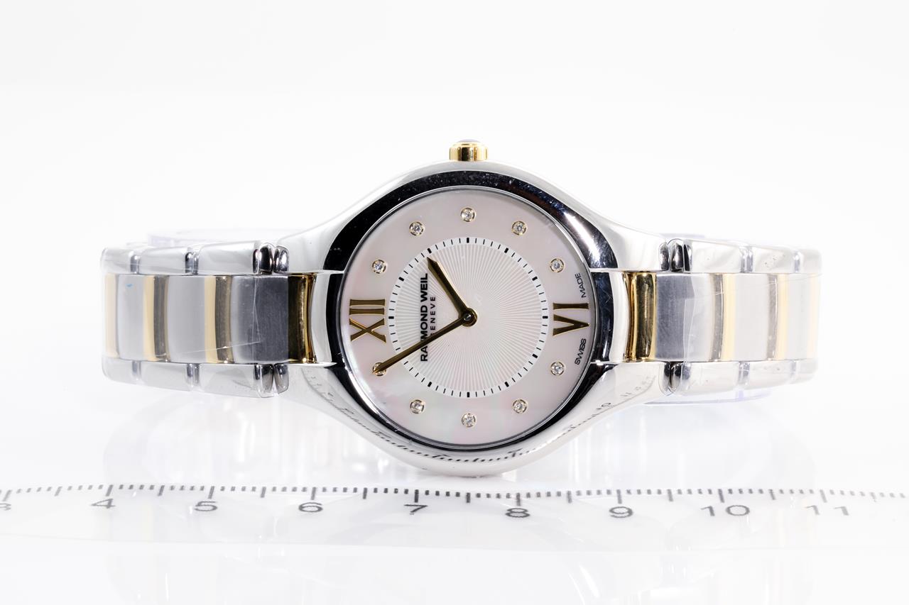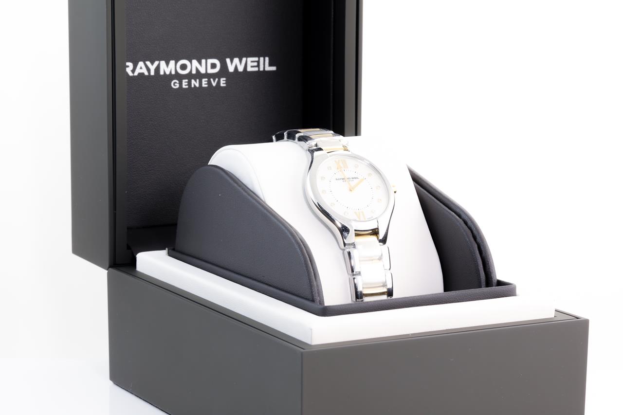 Raymond Weil Noemia stainless steel quartz womens watch. Mother of pearl dial, Diamond indicators, case diameter: 32mm, Swiss made. Ref#5132-STP-00985. With Raymond Weil stainless steel bracelet and clasp. With Raymond Weil box. 12 month FSA warranty. (New, in original wrapping)