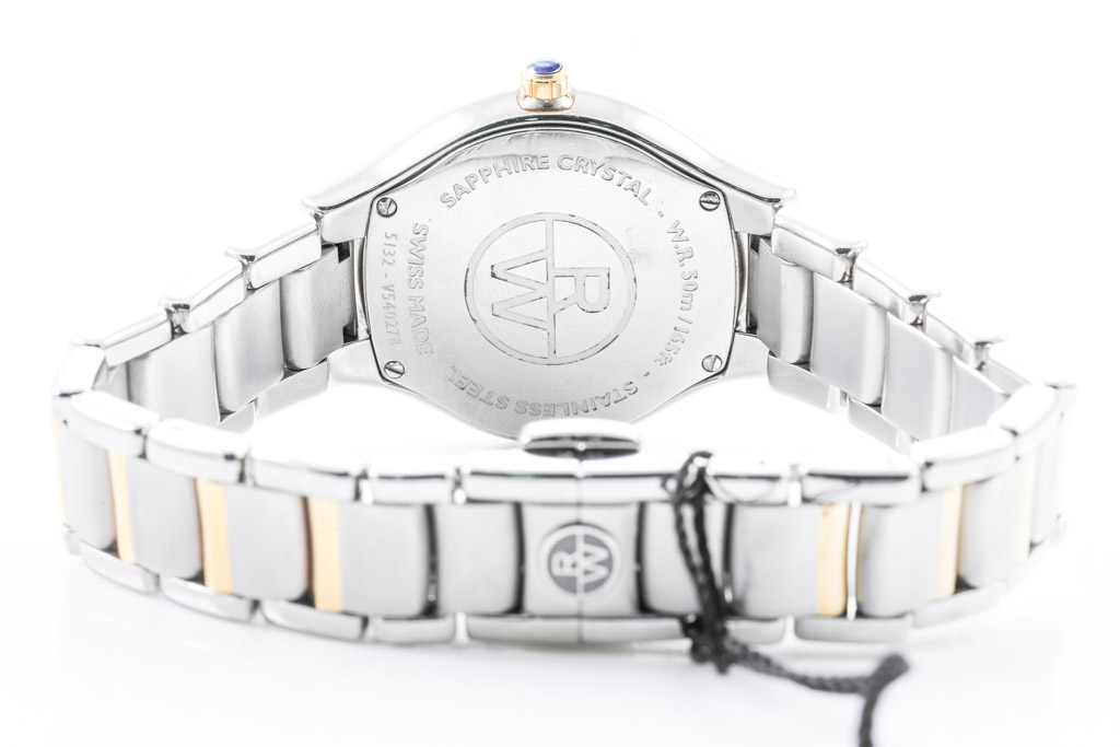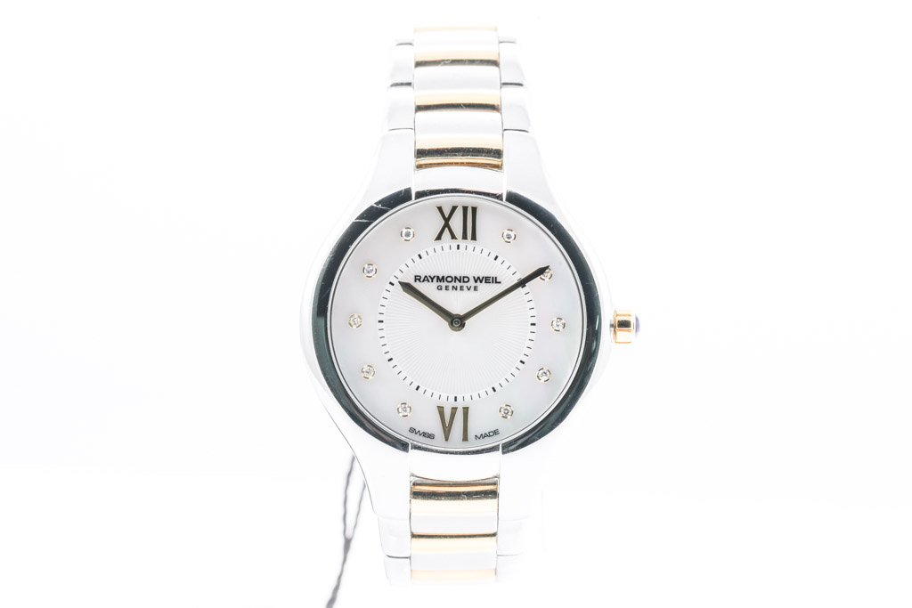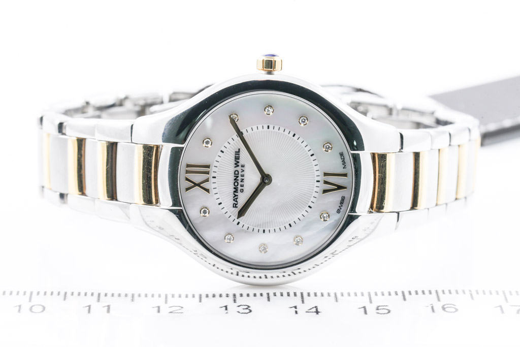 Raymond Weil Noemia stainless steel and yellow gold tone quartz ladies watch. Mother of pearl dial, Diamond indicators, date, case diameter: 32mm, wrist size: 17.5cm, Swiss made. Ref# 5132-STP-00985. With Raymond Weil two tone bracelet and clasp. With Raymond Weil Guarantee Card and Raymond Weil box. 12 month FSA warranty. (As New, Note: scratches on case and bracelet due to being display stock).