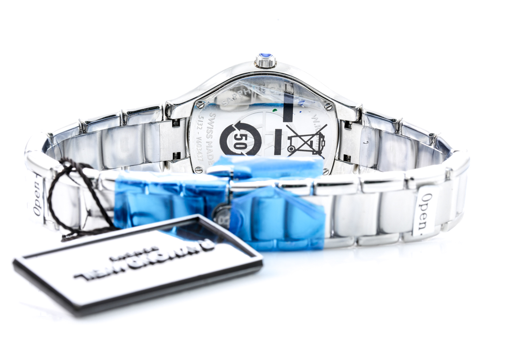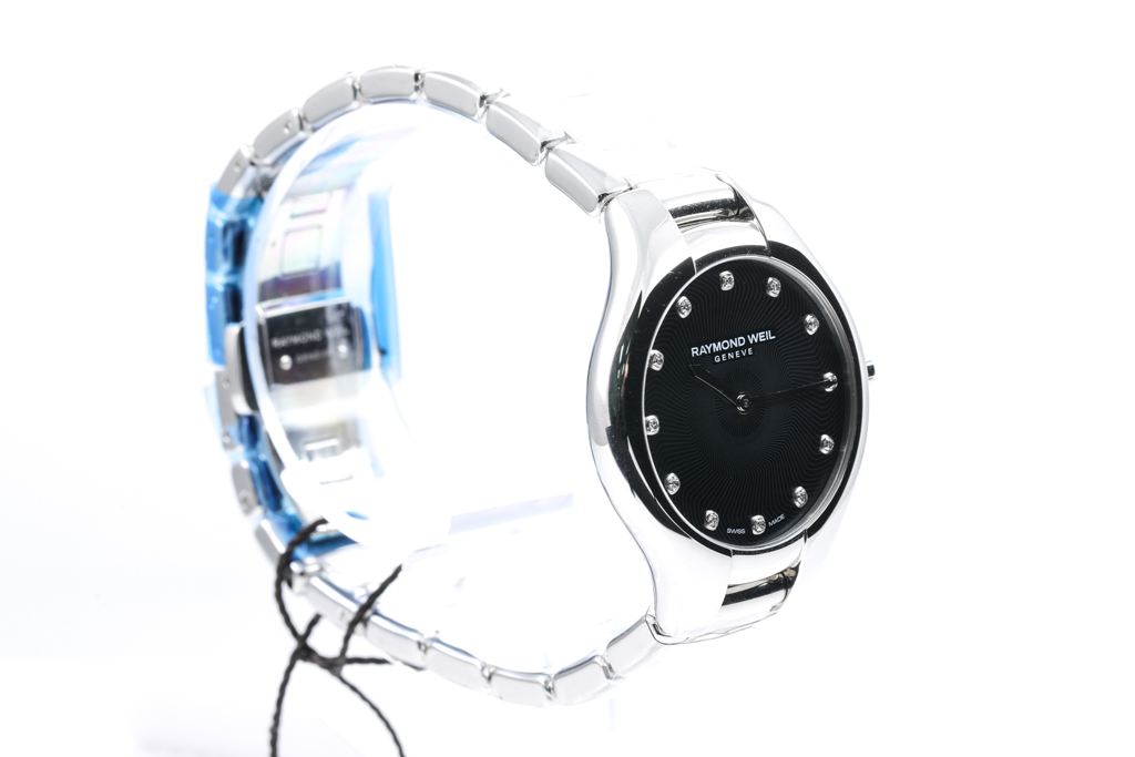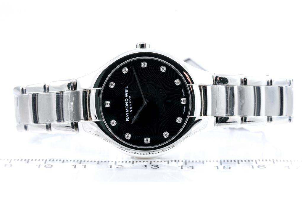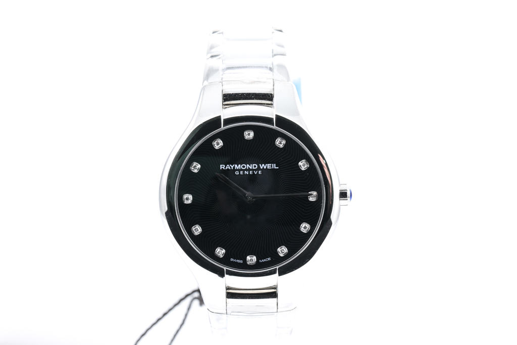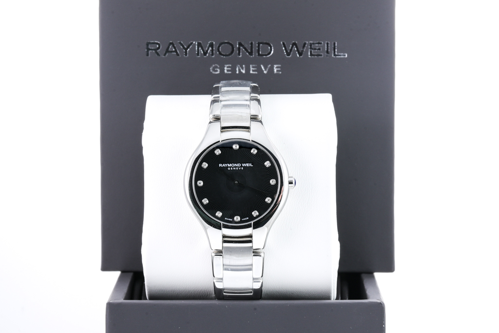 Raymond Weil Noemia stainless steel quartz ladies watch. Black dial, Diamond indicators, case diameter: 32mm, wrist size: 17cm, Swiss made. Ref# 5132-ST-20081. With Raymond Weil stainless steel bracelet and clasp. With Raymond Weil Guarantee Card and Raymond Weil box. 12 month FSA warranty. (As New, in original wrapping. Note: minor scratches on case due to being display stock)