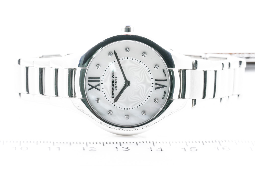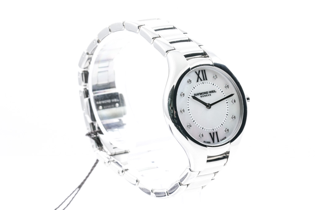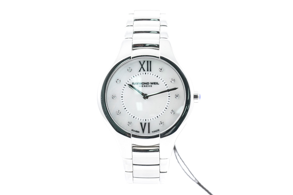 Raymond Weil Noemia stainless steel quartz ladies watch. Mother of Pearl dial, Diamond indicators, case diameter: 32mm, wrist size: 16cm, Swiss made. Ref# 5132-ST-00985. With Raymond Weil stainless steel bracelet and clasp. With Raymond Weil Guarantee card and Raymond Weil box. 12 month FSA warranty. (As New, Note: minor scratches on case and bracelet due to being display stock)